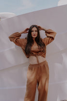 Bluzkę Felicita najlepiej nosić ze spodniami do kompletu, ale śmiało możecie nią też dopełniać inne stylizacje. Ze spódnicą z wysokim stanem czy szerszym dołem stworzy idealny zestaw. Sprawdzi się i na wieczór, ale i na co dzień. Wszystko zależy od tego, z czym i jak ją ogracie.