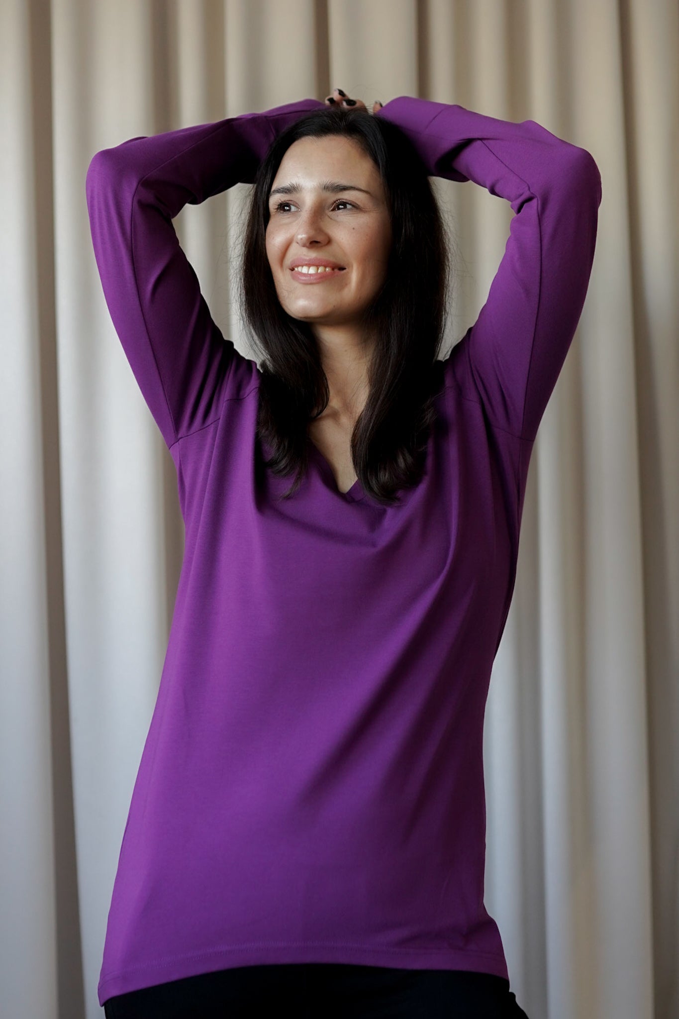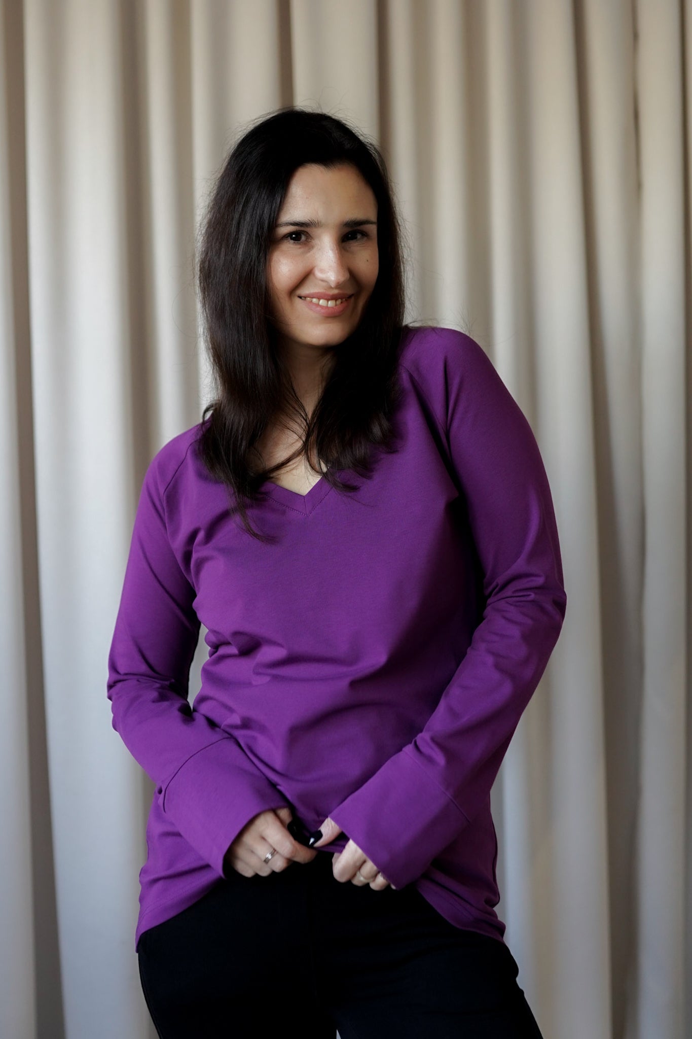 Dekolt w serek, który odsłania tyle, ile powinien, a dodatkowo odpowiednio podkreśla biust.
