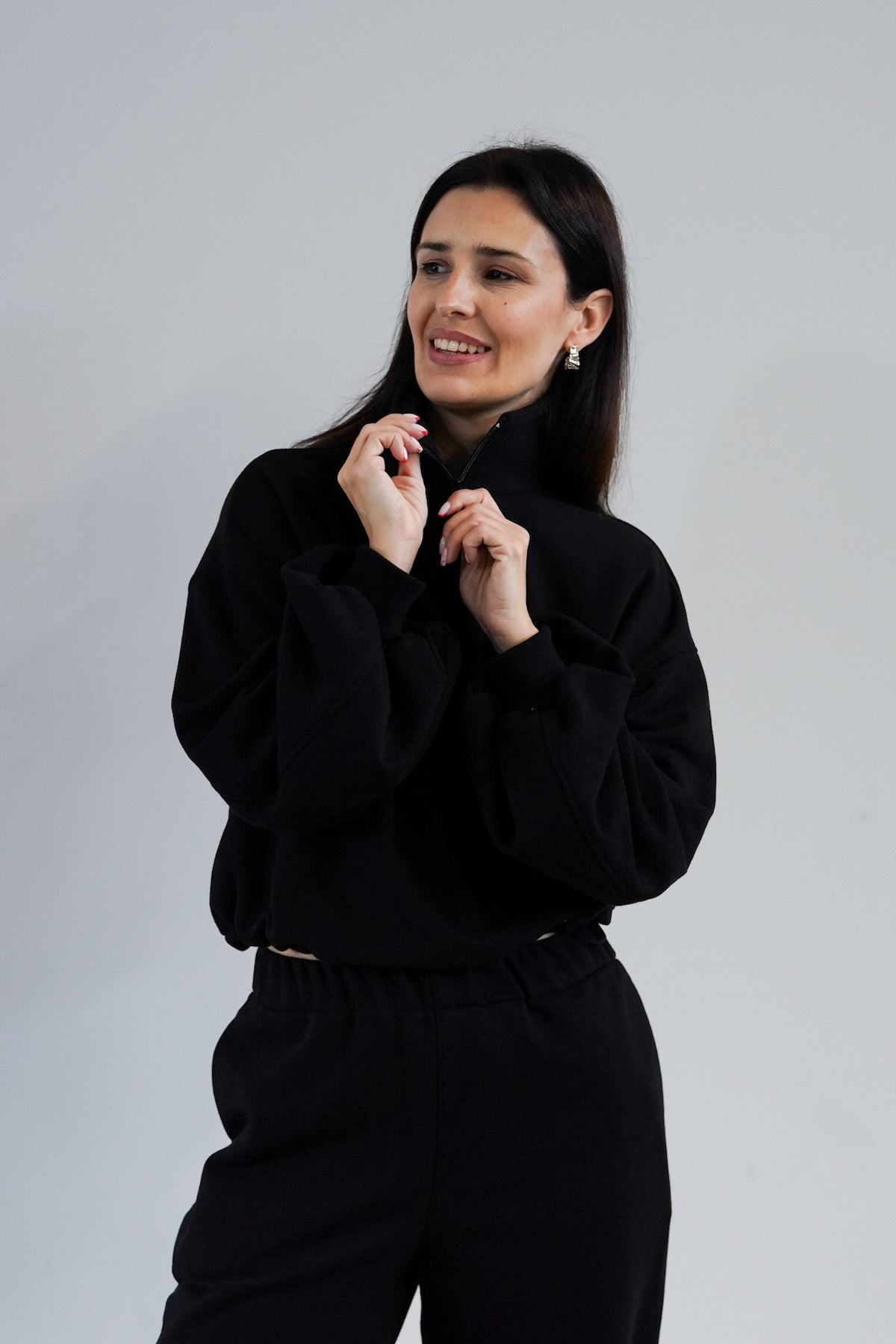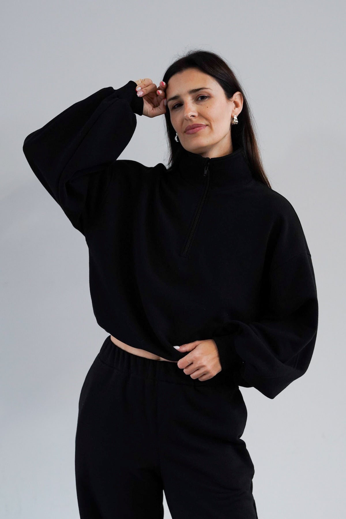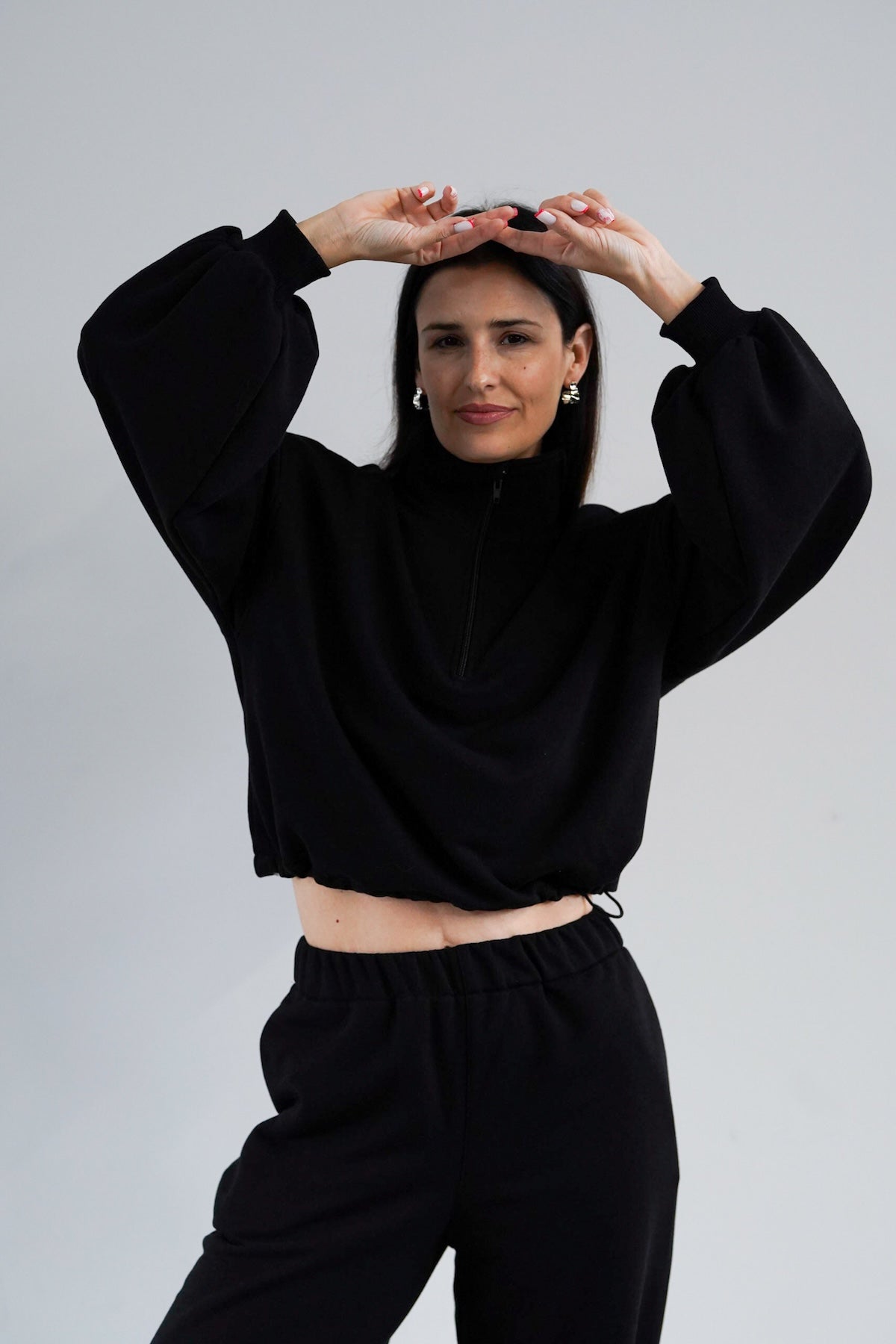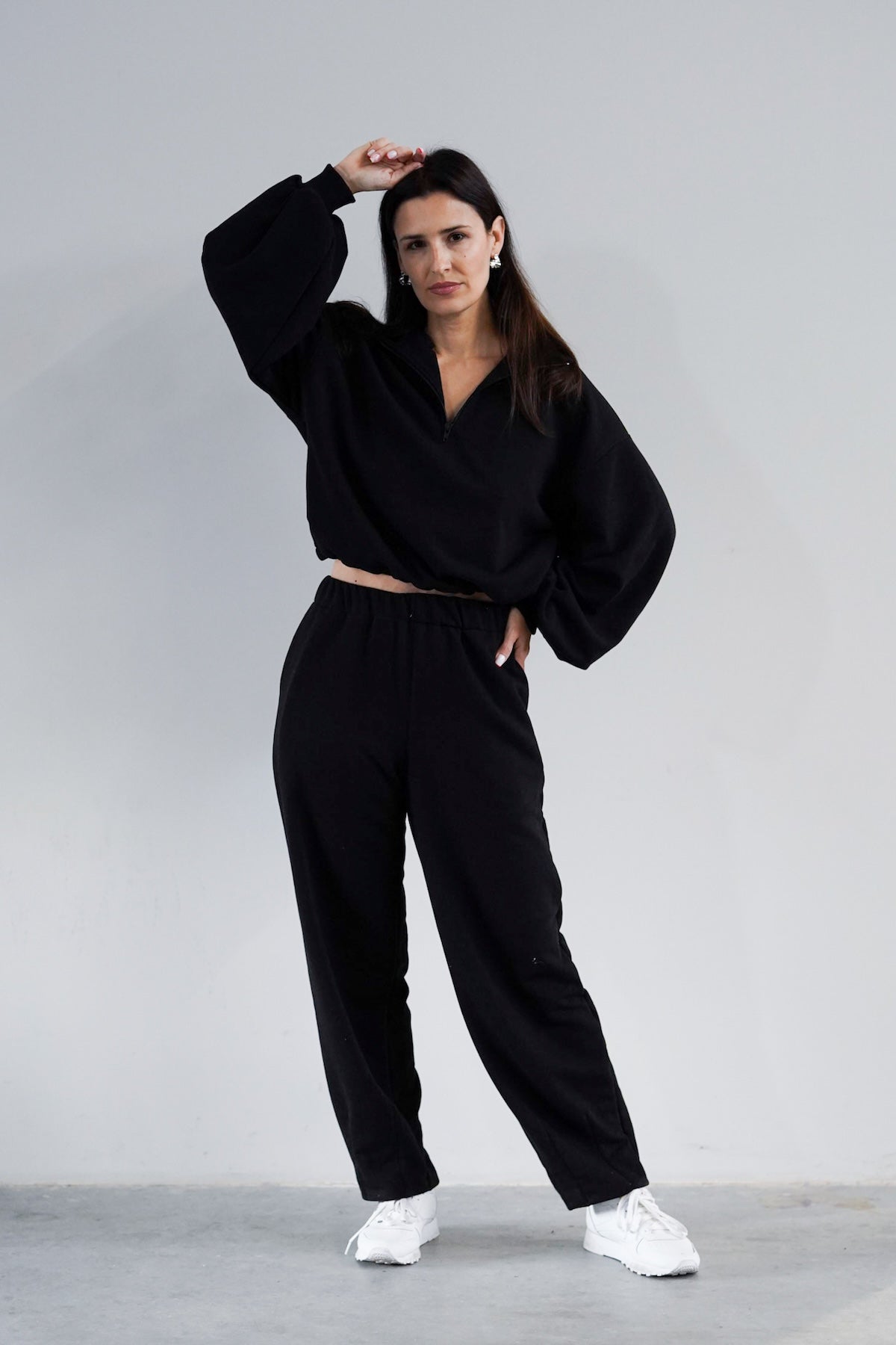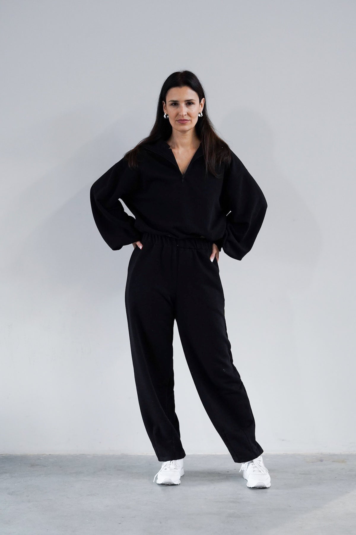 To minimalistyczna bluza, która nabiera charakteru za sprawą formy i kilku nieszablonowych rozwiązań, dlatego świetnie sprawdzi się zarówno na co dzień, jak i w bardziej stylowych, miejskich zestawach. My nosimy ją do naszych dżinsów Suzy, a gdy chcemy poczuć się jeszcze bardziej komfortowo zestawiamy z dresami Monica.