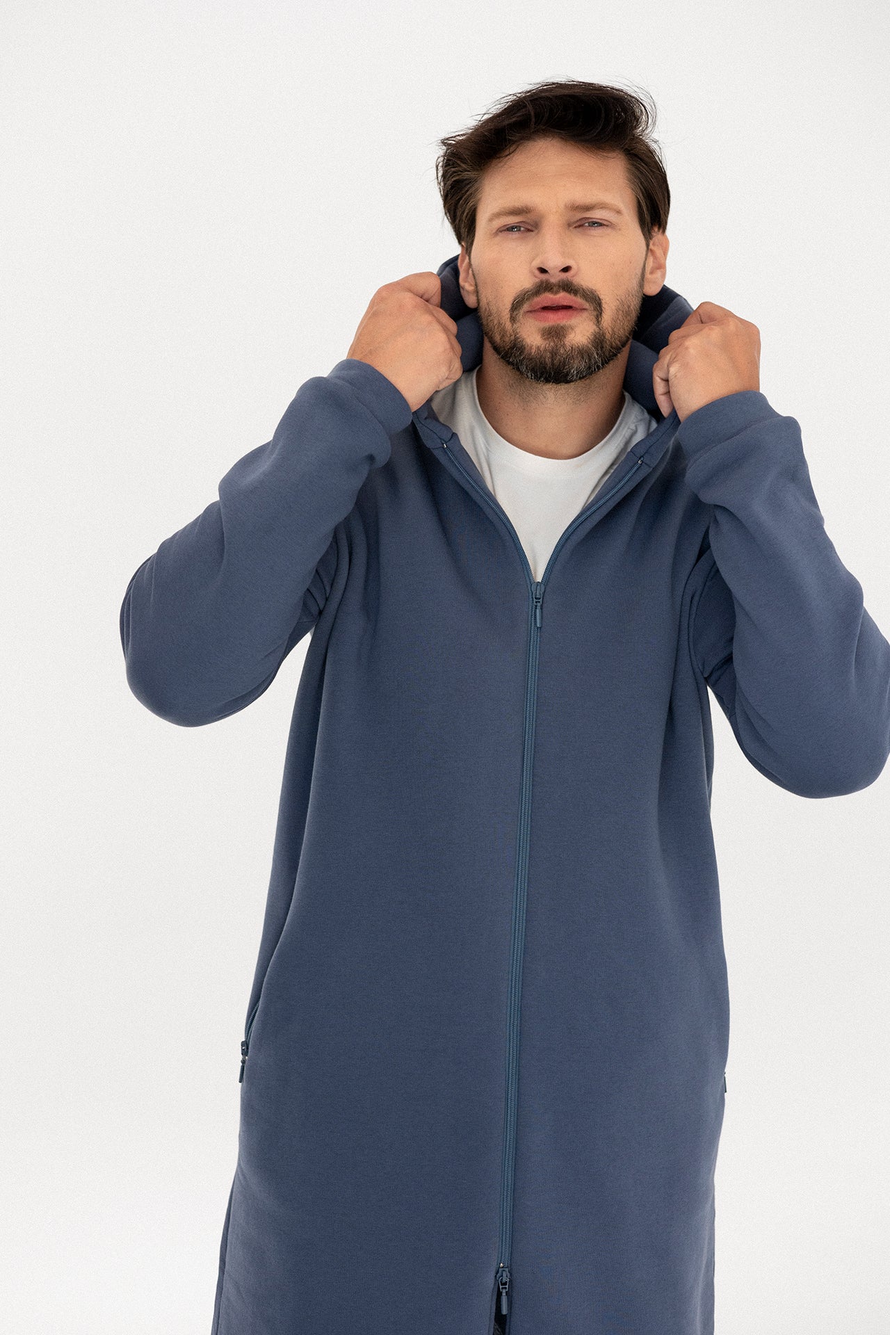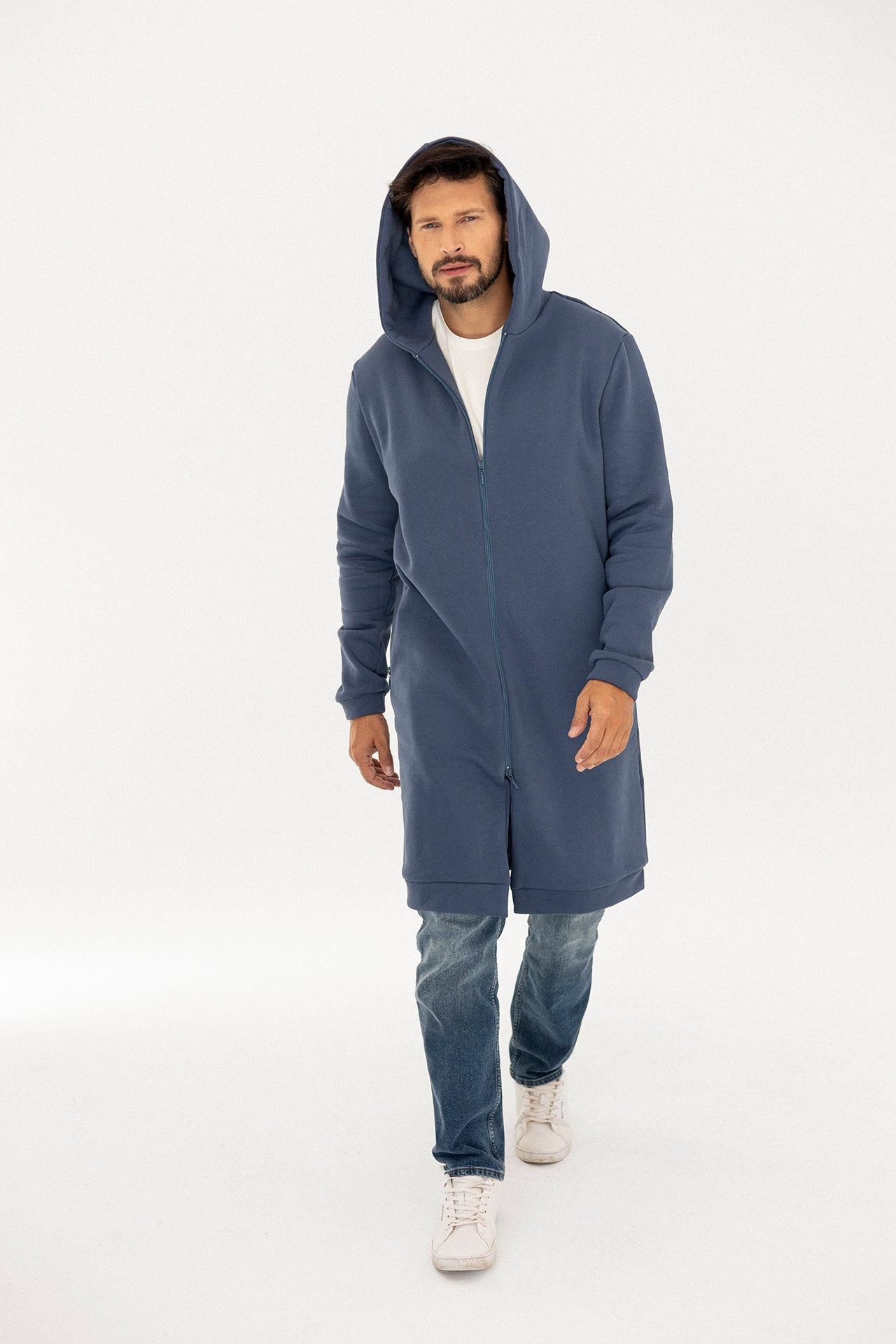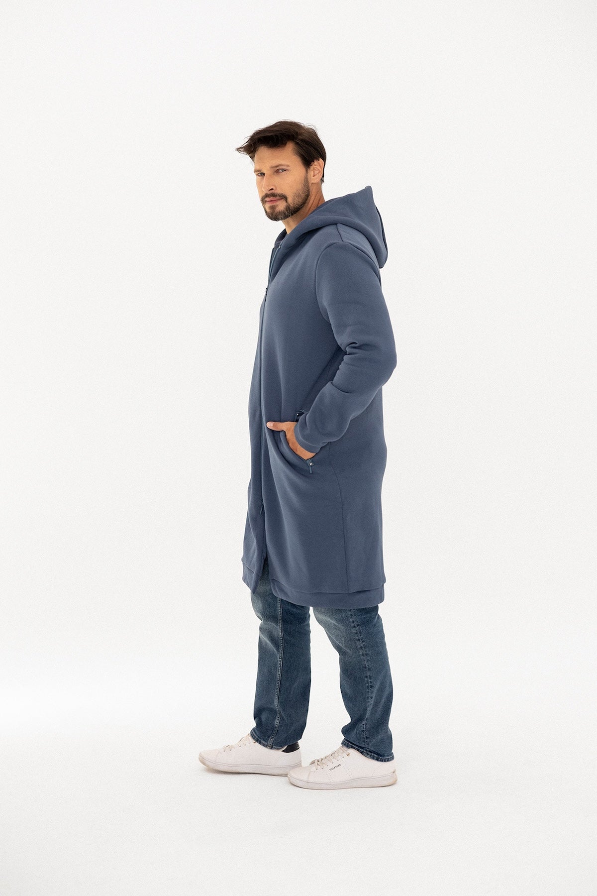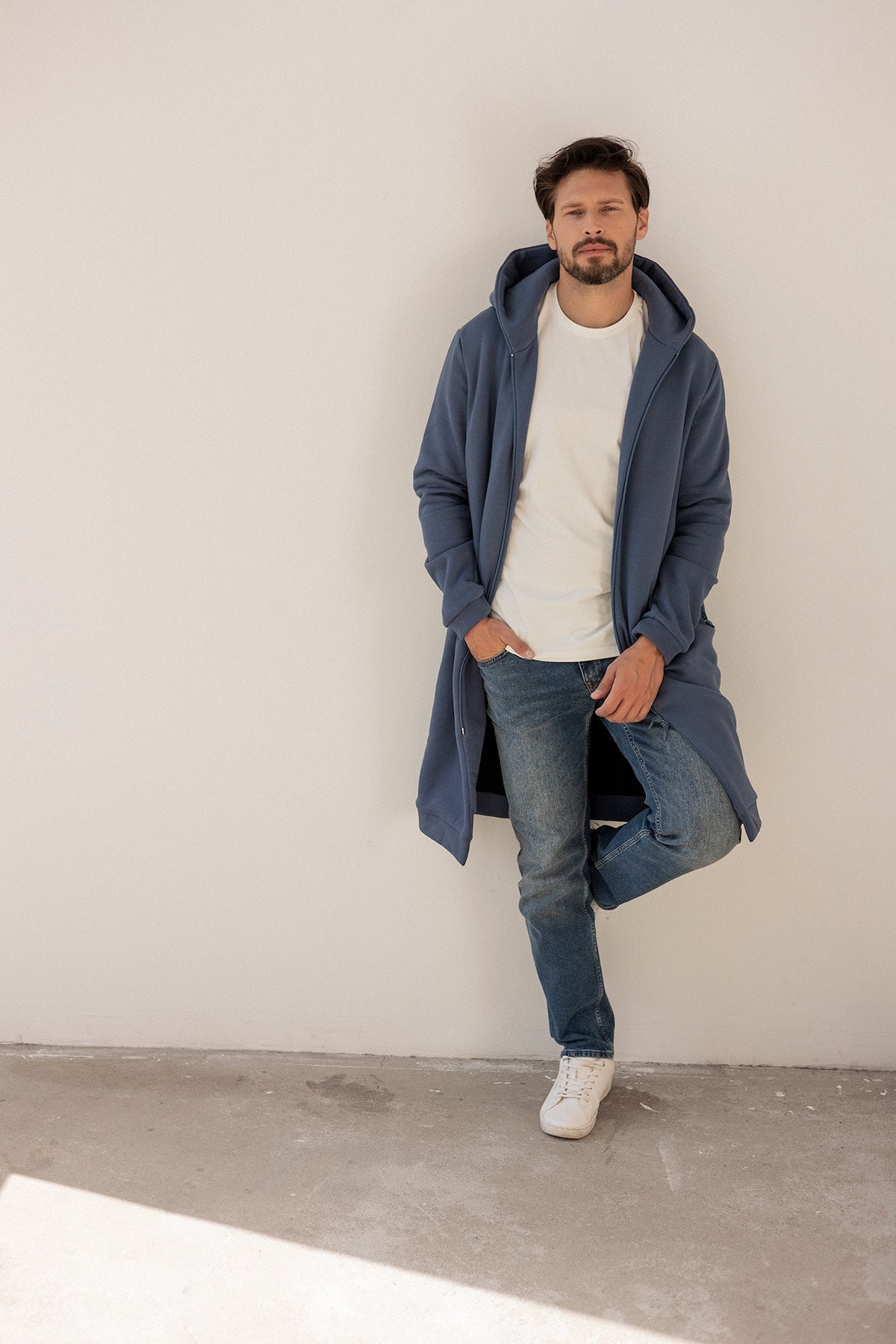 Nasz debiut w kwestii męskiej garderoby. Płaszczobluza ma dłuższy krój, który idealnie chroni przed pierwszymi chłodami, nie krępuje ruchów, a co najważniejsze jej prosta, dłuższa linia sprytnie wyciąga sylwetkę. Do tego wyposażona jest w głębokie, zapinane kieszenie po bokach i obszerny kaptur, dzięki czemu jest uniwersalna i praktyczna. Nie zapomniałyśmy też o podszewce, która dodaje jej elegancji i stawia wysoko poprzeczkę w kategorii idealnych (płaszczo)bluz!