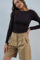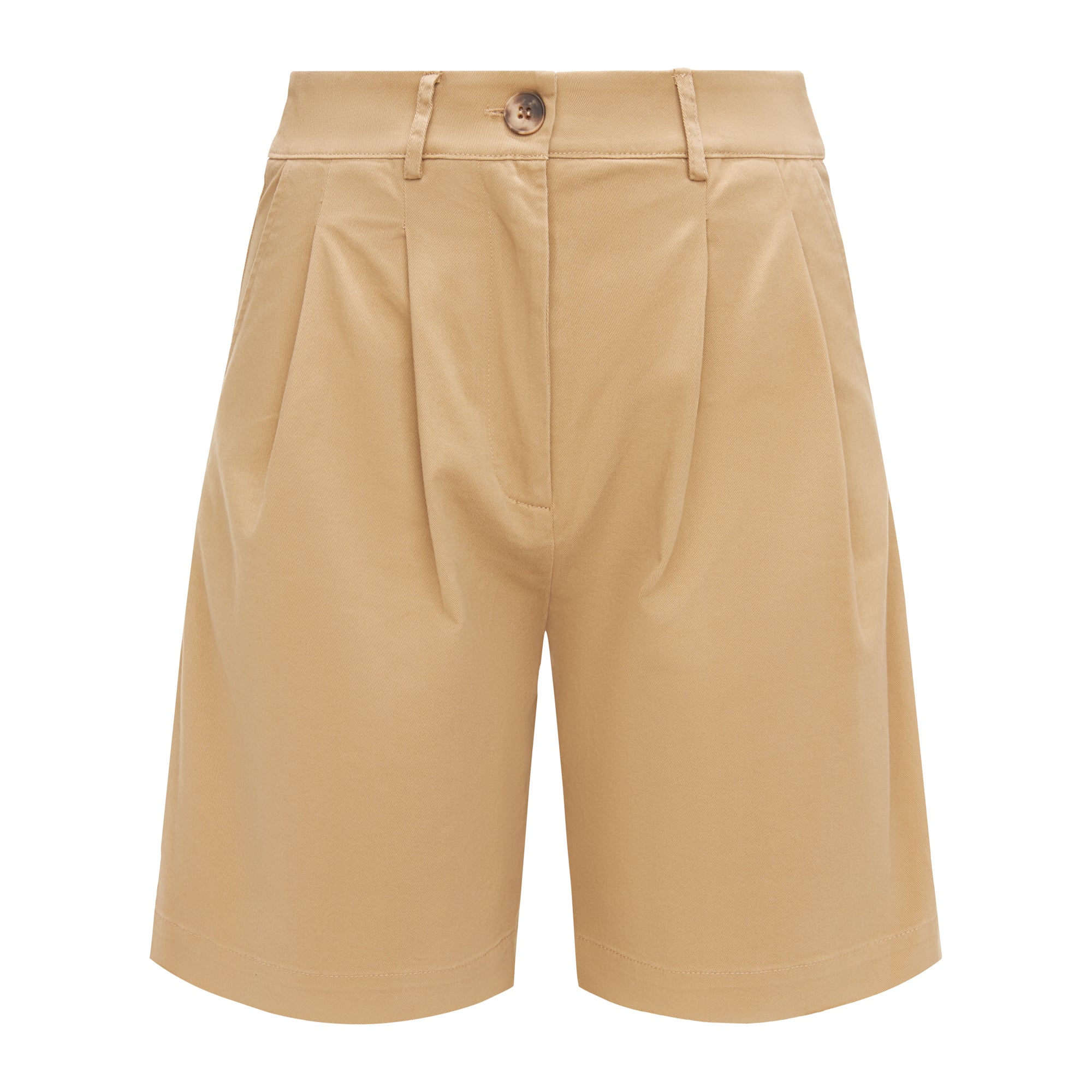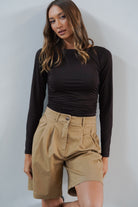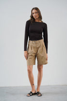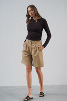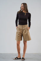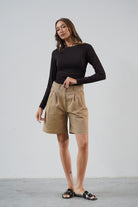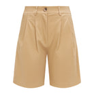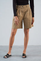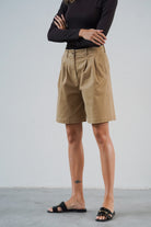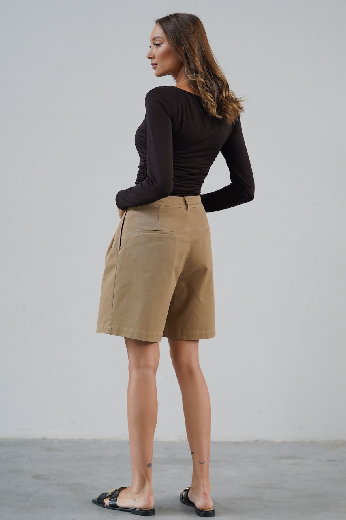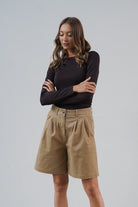 Wysoki stan pięknie podkreśla talię, a delikatne zakładki z przodu dodają im lekkości, zgrabnie się układając. Szeroka nogawka sięga przed kolano, tworząc proporcje, które dają poczucie komfortu, ale i elegancji. Uszyte z wysokiej jakości bawełny — przyjemnej w dotyku, lekko sztywnej tkaniny, która pięknie trzyma formę i nadaje stylizacji strukturę.
