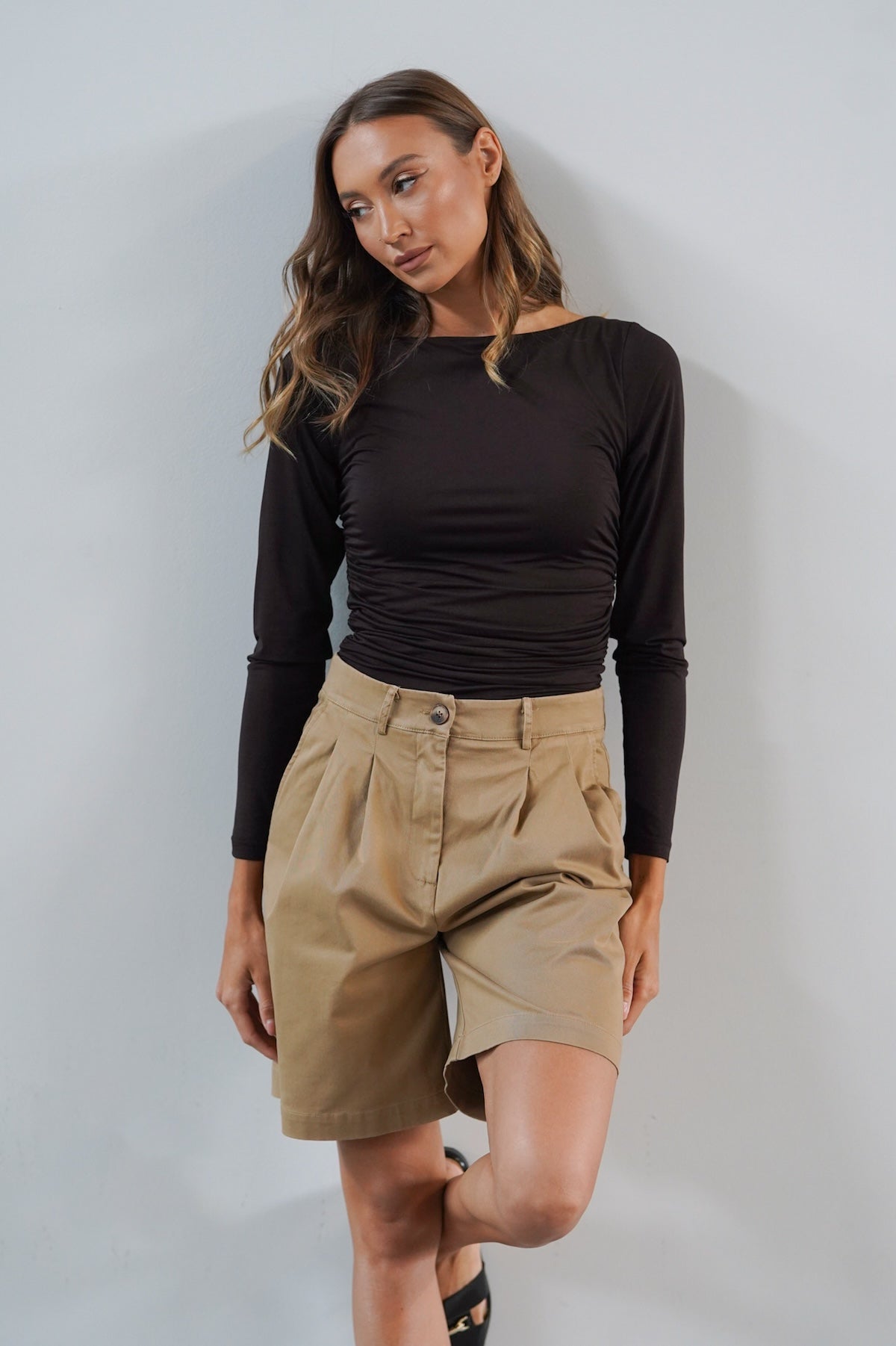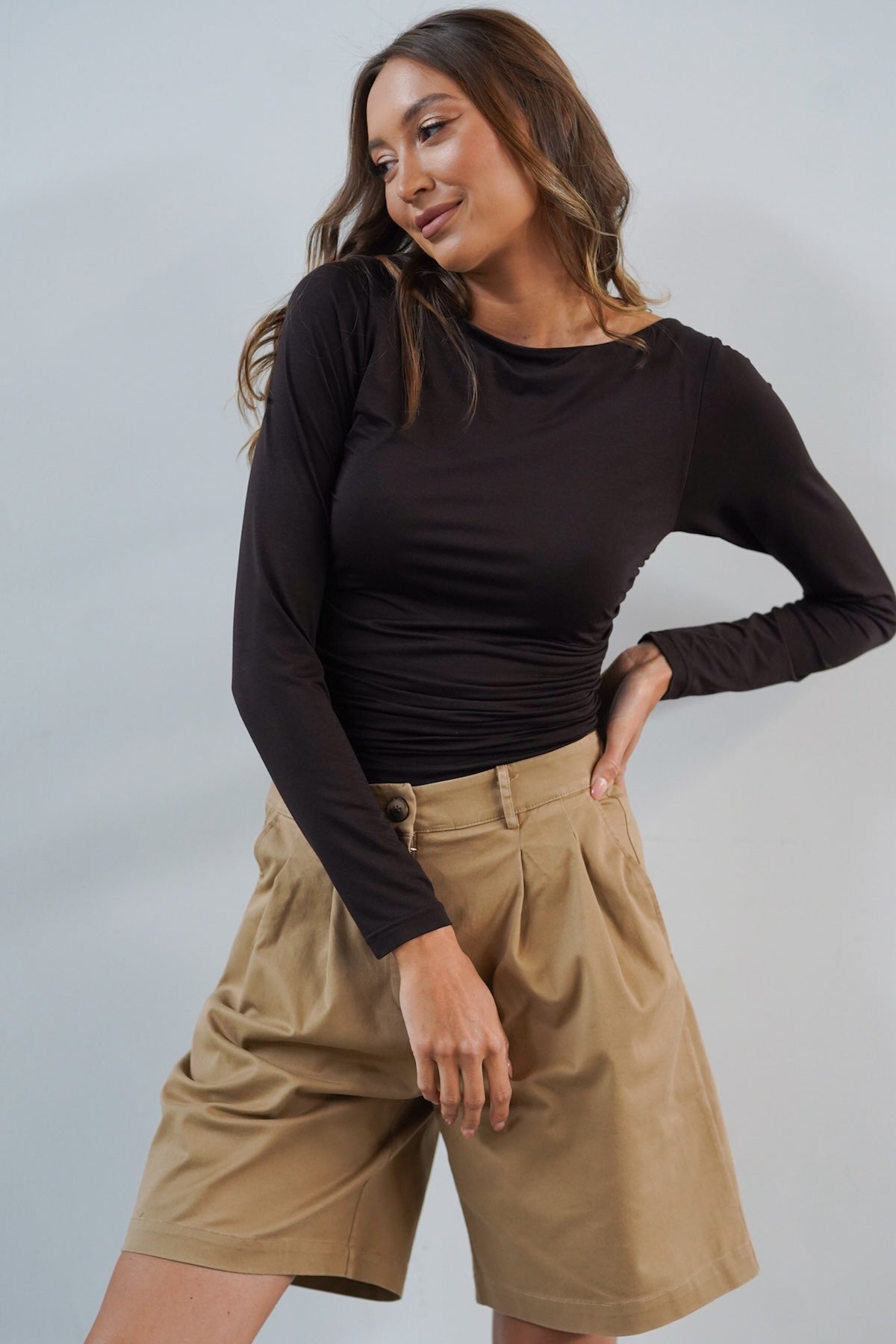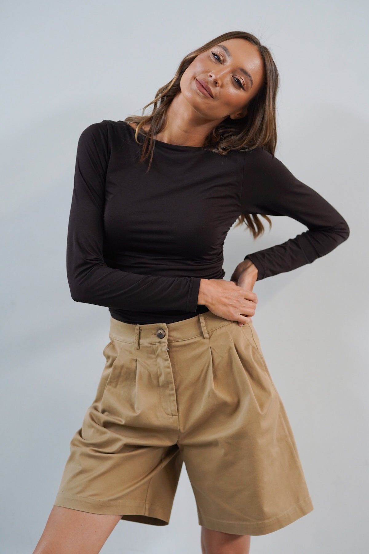 Wysoki stan pięknie podkreśla talię, a delikatne zakładki z przodu dodają im lekkości, zgrabnie się układając. Szeroka nogawka sięga przed kolano, tworząc proporcje, które dają poczucie komfortu, ale i elegancji. Uszyte z wysokiej jakości bawełny — przyjemnej w dotyku, lekko sztywnej tkaniny, która pięknie trzyma formę i nadaje stylizacji strukturę.