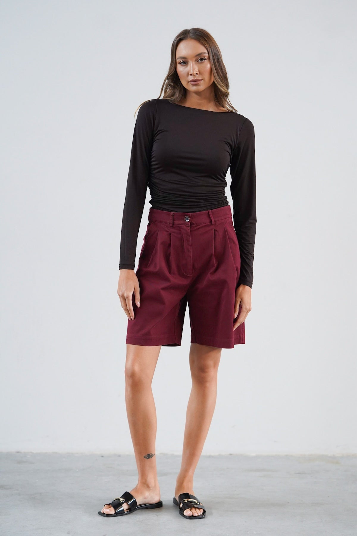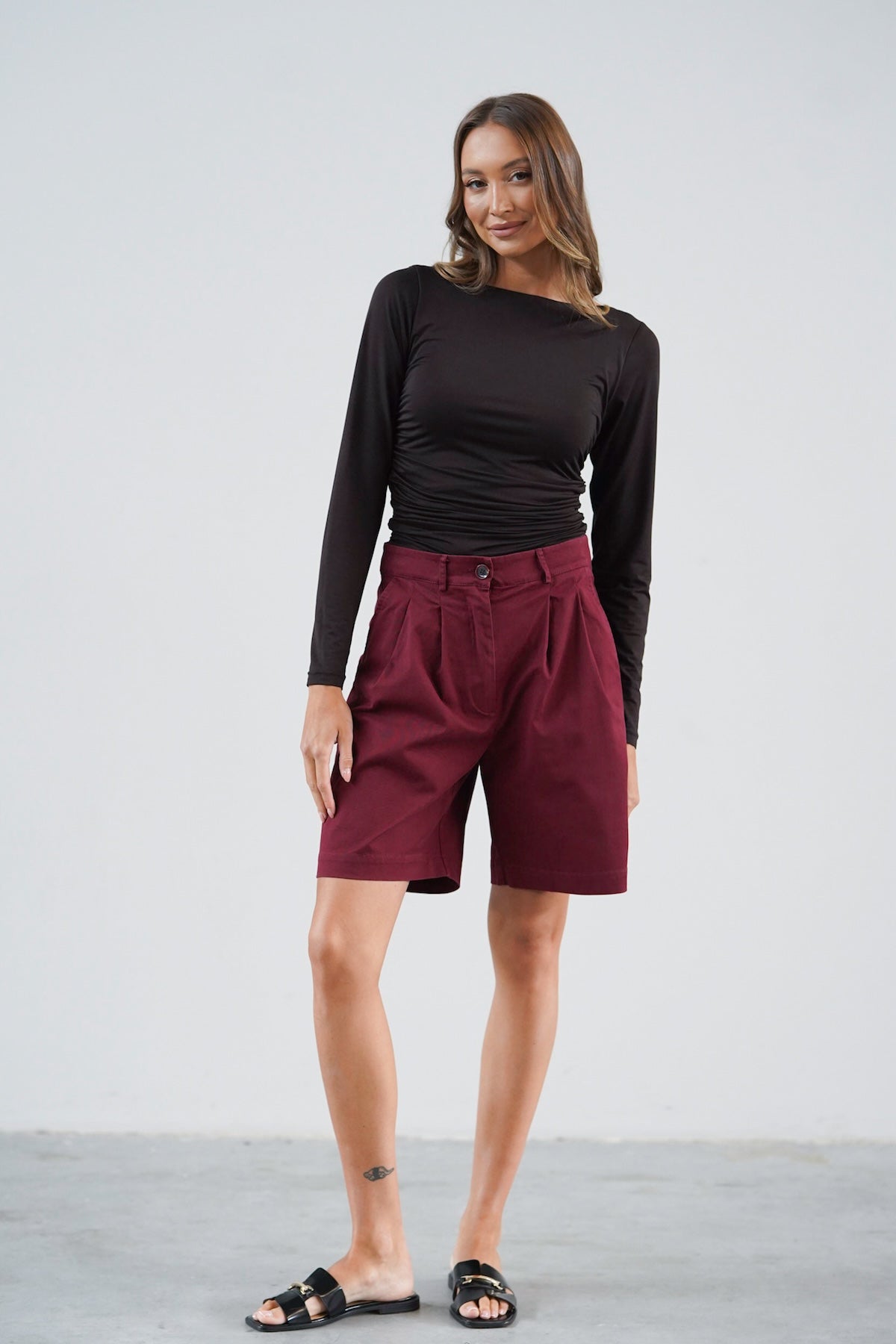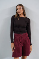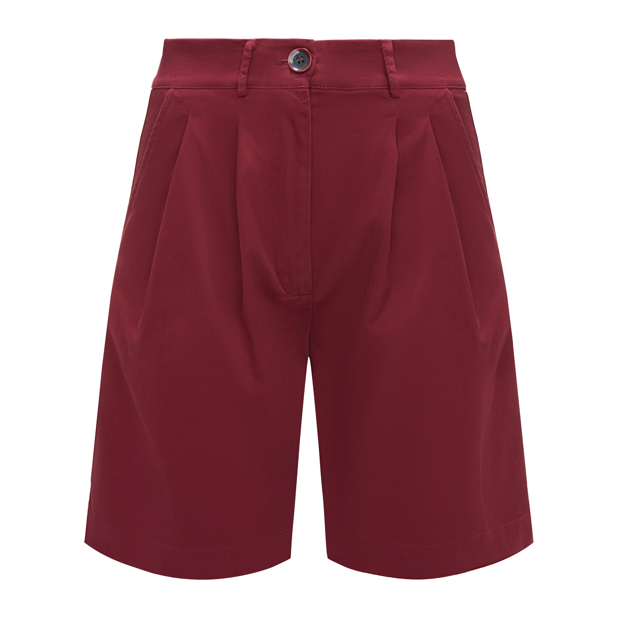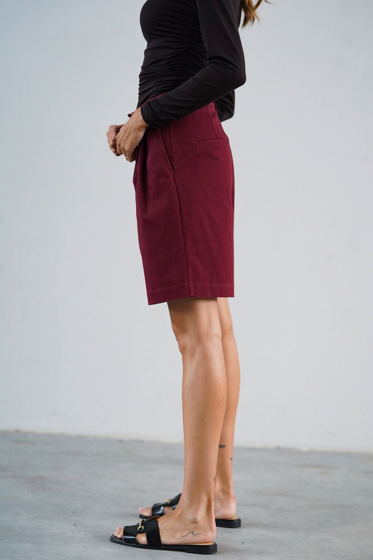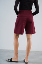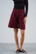 Wysoki stan pięknie podkreśla talię, a delikatne zakładki z przodu dodają im lekkości, zgrabnie się układając. Szeroka nogawka sięga przed kolano, tworząc proporcje, które dają poczucie komfortu, ale i elegancji. Uszyte z wysokiej jakości bawełny — przyjemnej w dotyku, lekko sztywnej tkaniny, która pięknie trzyma formę i nadaje stylizacji strukturę.