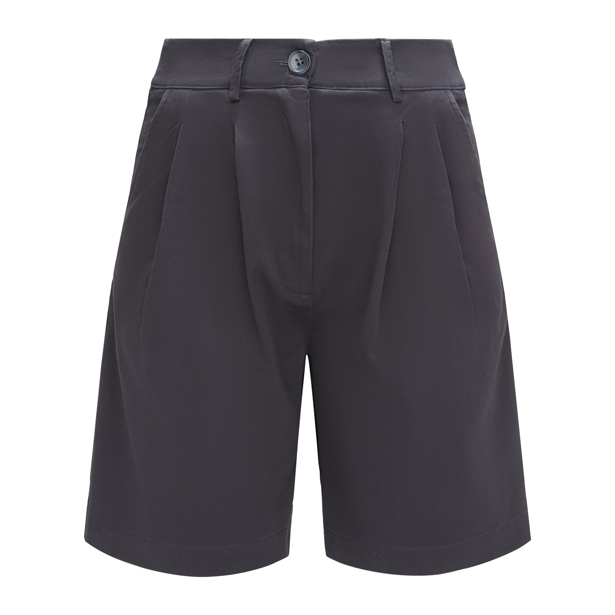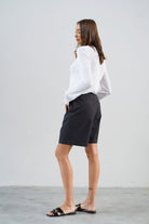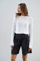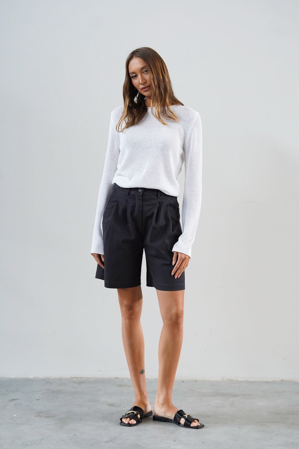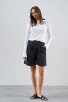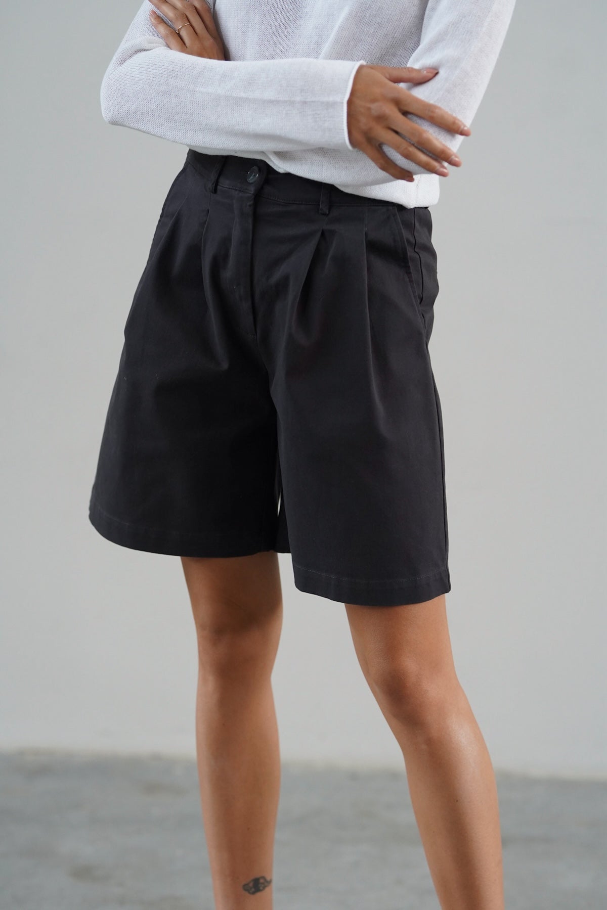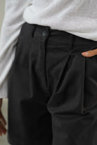 Wysoki stan pięknie podkreśla talię, a delikatne zakładki z przodu dodają im lekkości, zgrabnie się układając. Szeroka nogawka sięga przed kolano, tworząc proporcje, które dają poczucie komfortu, ale i elegancji. Uszyte z wysokiej jakości bawełny — przyjemnej w dotyku, lekko sztywnej tkaniny, która pięknie trzyma formę i nadaje stylizacji strukturę.