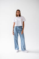 Ma obszerny, luźniejszy, ale zdecydowanie krótszy krój, podkreślający talię. Do tego delikatnie wywinięte rękawki i odpowiednio dopieszczone wykończenie. Wykonany jest z wysokiej jakości, przewiewnej bawełny o gramaturze 180, która zapewni Wam komfort noszenia. Do tego dziewczęcy haft w postaci białych stokrotek.
