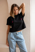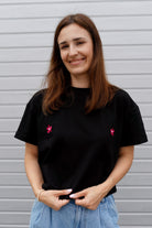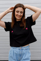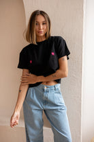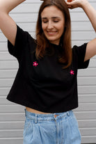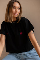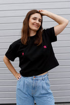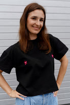 Ma obszerny, luźniejszy, ale zdecydowanie krótszy krój, podkreślający talię. Do tego delikatnie wywinięte rękawki i odpowiednio dopieszczone wykończenie. Wykonany jest z wysokiej jakości, przewiewnej bawełny o gramaturze 180, która zapewni Wam komfort noszenia. Do tego dziewczęcy haft w postaci białych stokrotek.