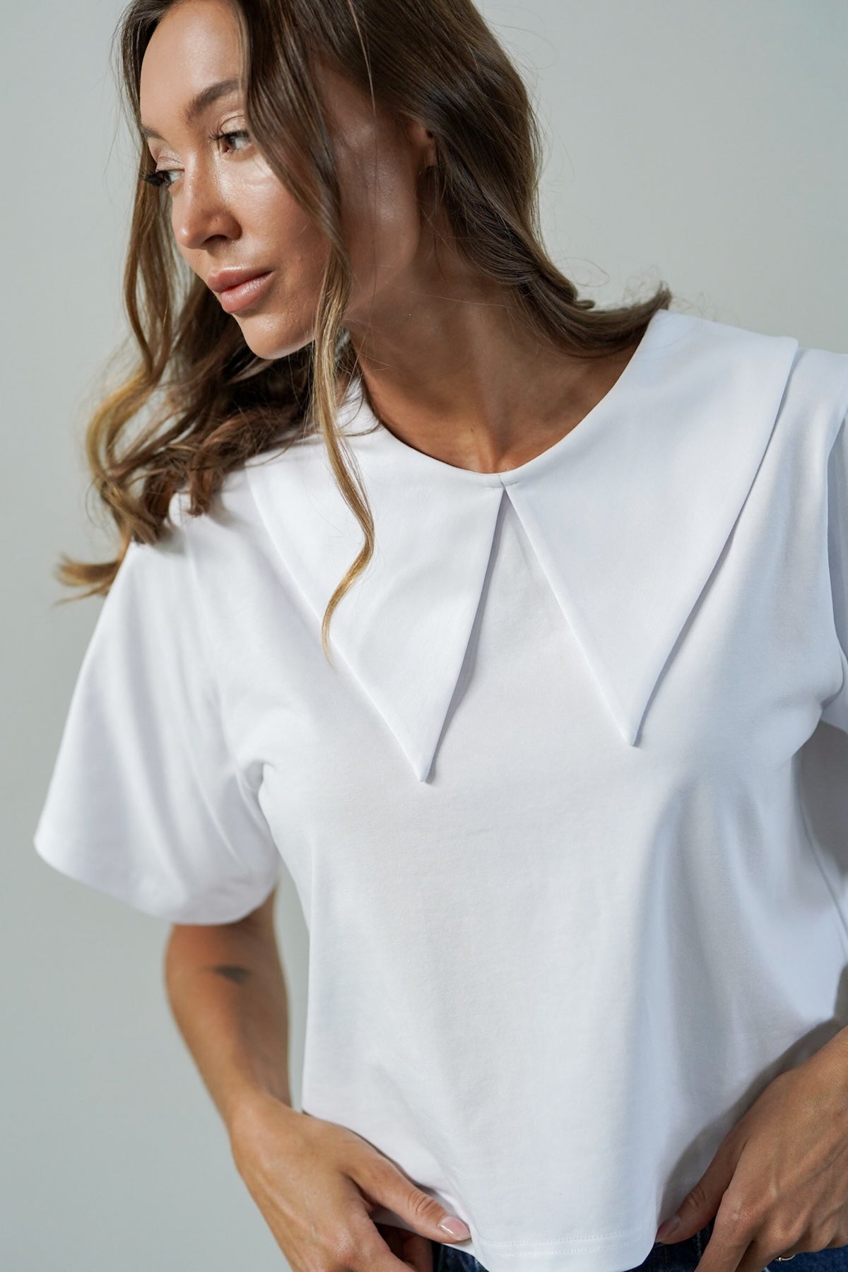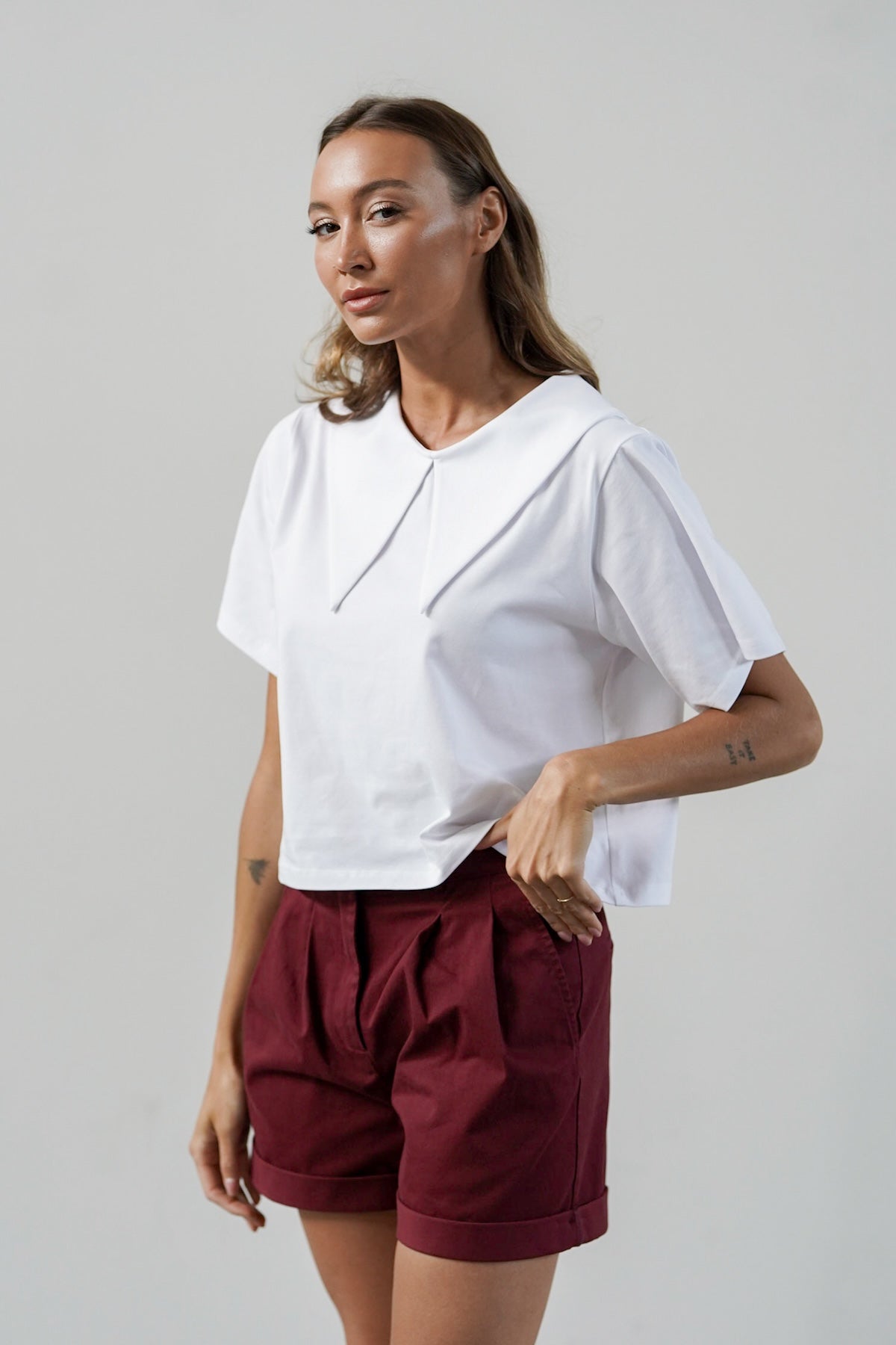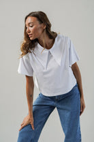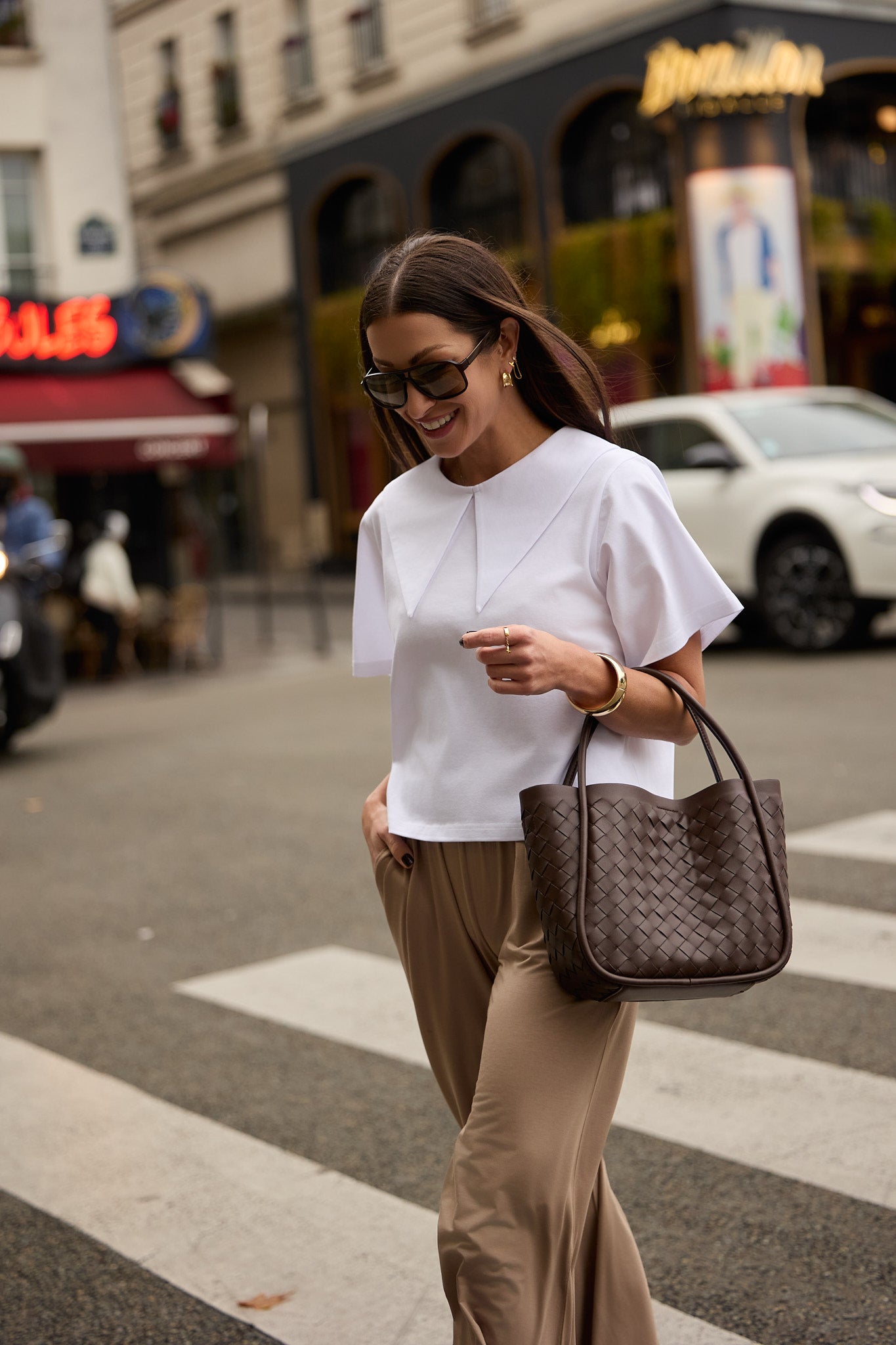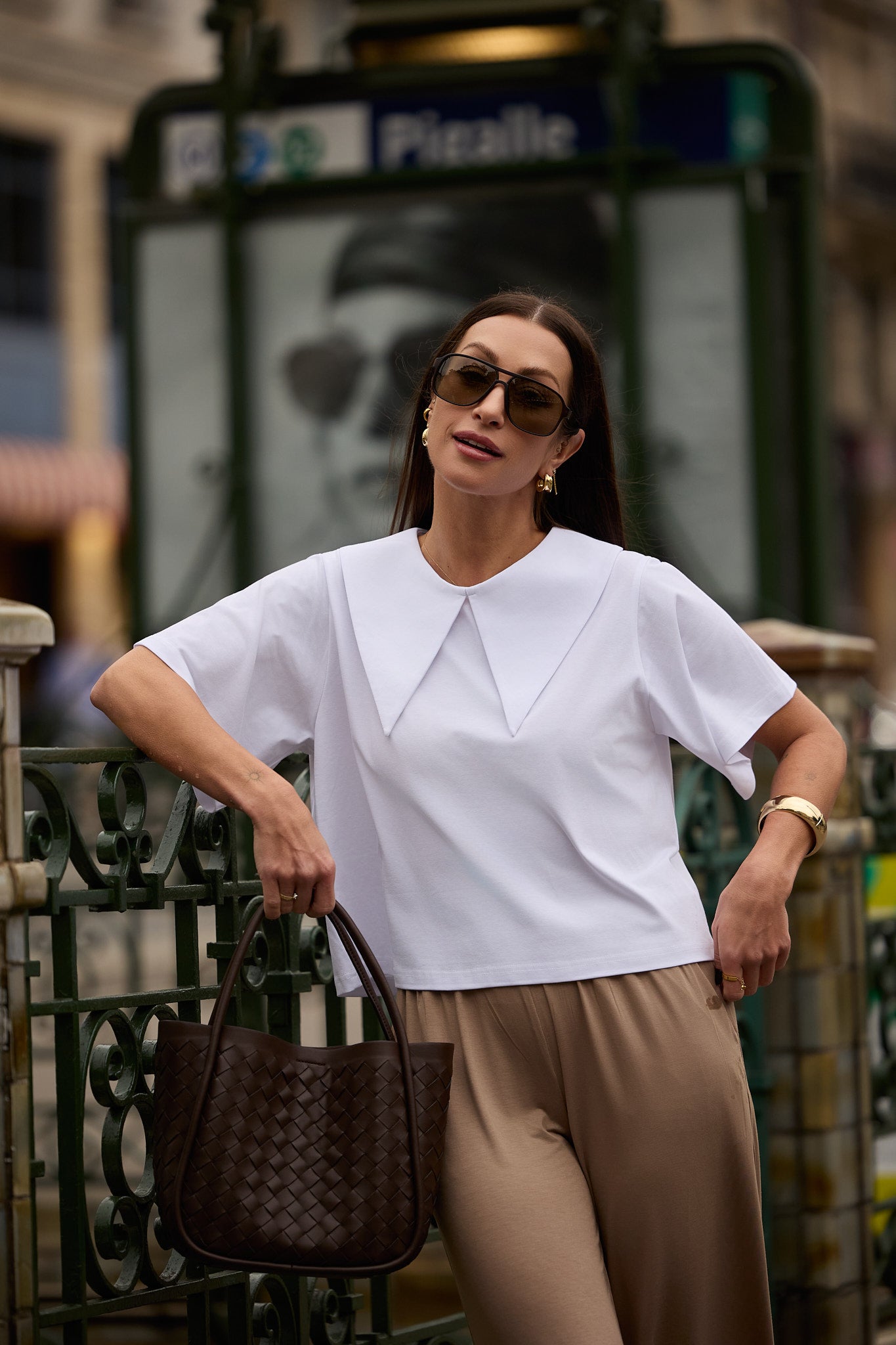 Koszulka Audrey to subtelne połączenie klasyki z nowoczesnym luzem. Jej charakterystycznym elementem jest dekoracyjny, wydłużony kołnierz o wyrazistej formie, który dodaje całości dziewczęcego uroku i wyróżnia ją w tłumie innych bluzek. Swobodniejszy krój zapewnia komfort noszenia i idealnie układa się na sylwetce, podkreślając codzienny, niezobowiązujący styl. To propozycja dla osób, które cenią detal i wygodę w minimalistycznym wydaniu.