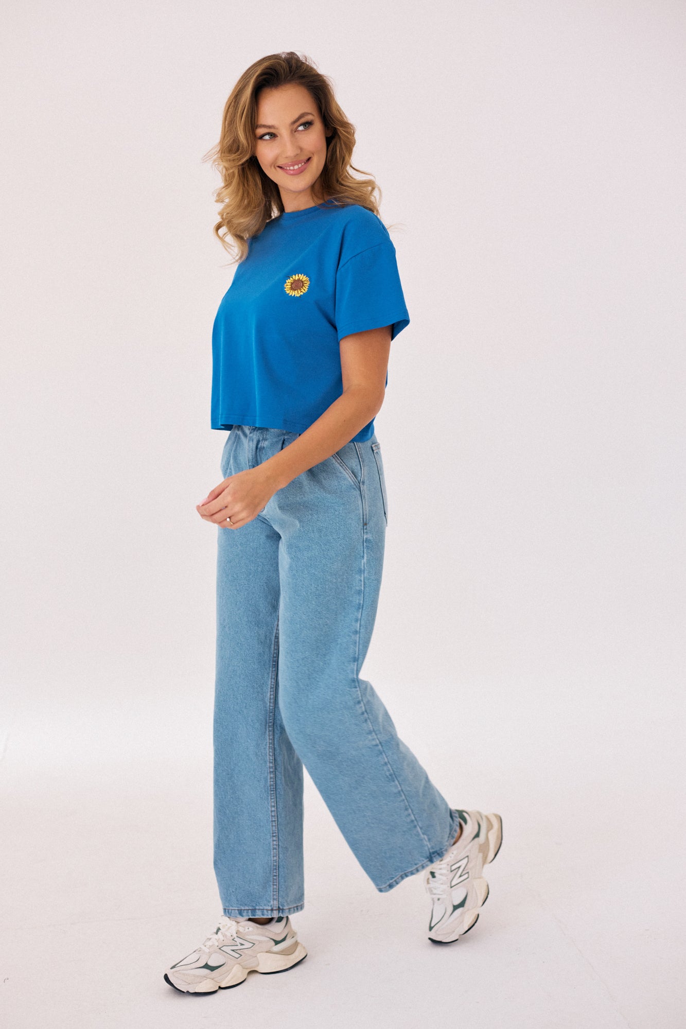 It has a spacious, looser, but definitely shorter cut, emphasizing the waist. In addition, gently rolled up sleeves and a carefully refined finish. It is made of high-quality, airy 180-gram cotton, which will provide you with comfortable wearing. Additionally, girly embroidery in the form of white daisies.