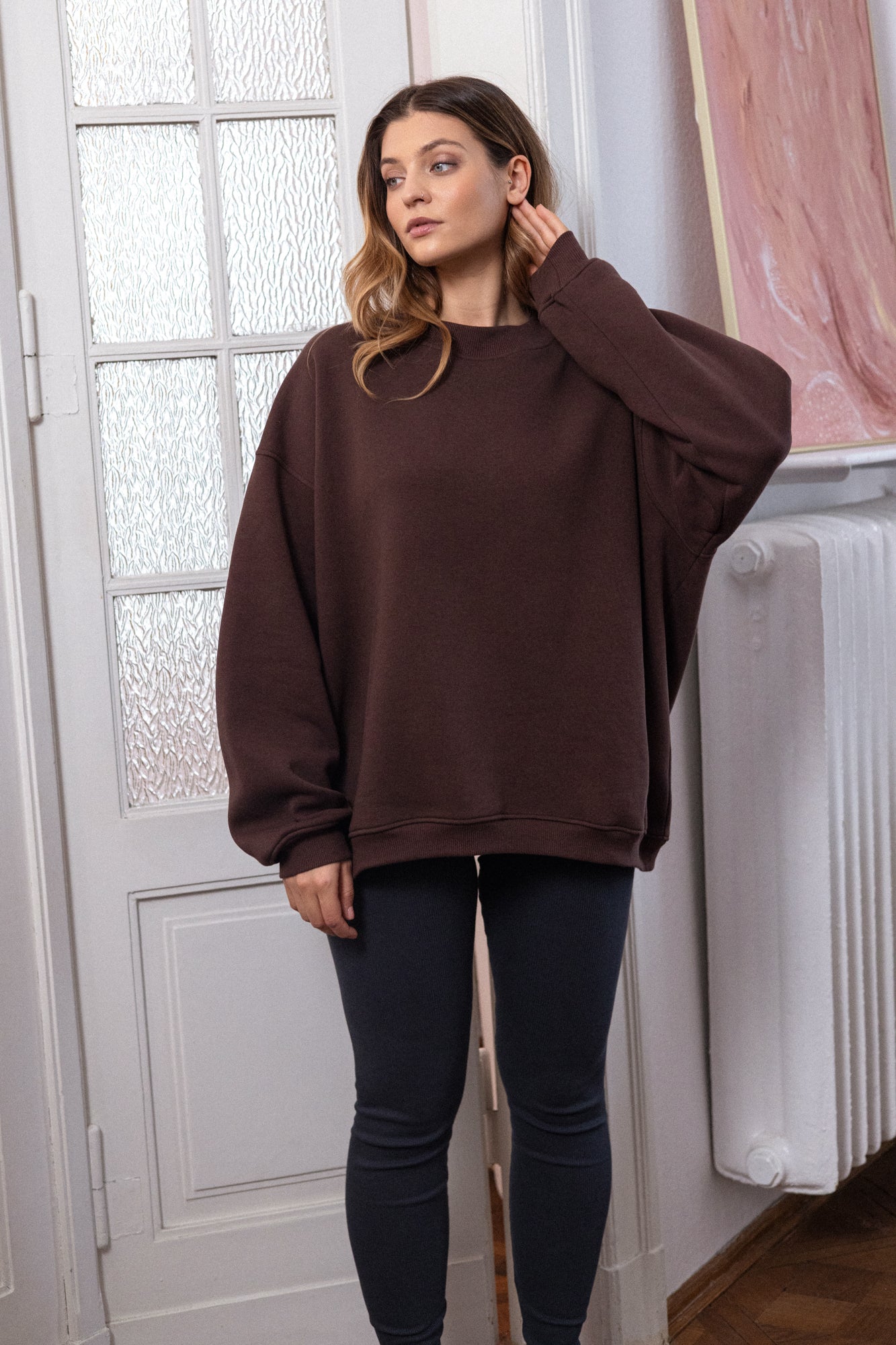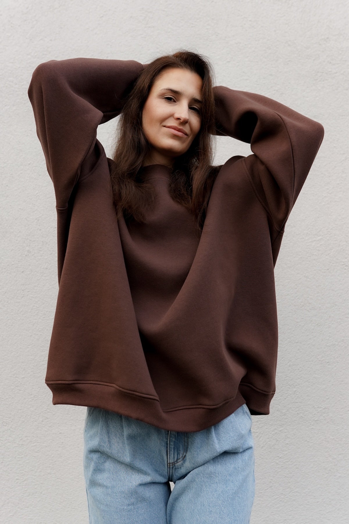 It has an oversized cut in an urban style, which we've given a sporty twist. Nonchalance is added by wider sleeves, finished with an aesthetic welt, and a longer cut, also with a neat finish. All enclosed in fleecy, warm cotton with a characteristic and already well-known teddy bear on the inside. Perfect for a weekend chill on the couch, a walk with friends or any outing.