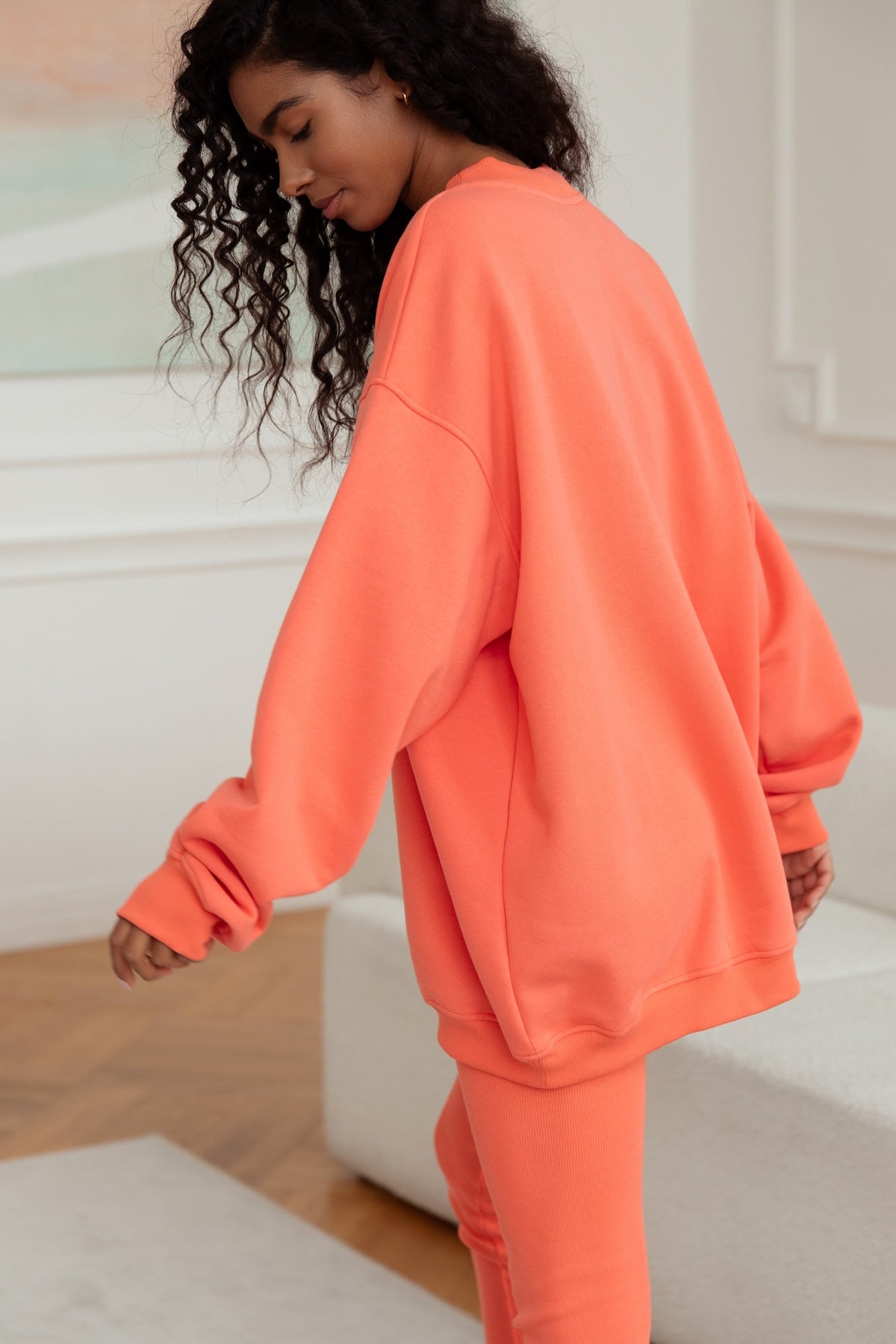 It has an oversized cut in an urban style, which we've given a sporty twist. Nonchalance is added by wider sleeves, finished with an aesthetic welt, and a longer cut, also with a neat finish. All enclosed in fleecy, warm cotton with a characteristic and already well-known teddy bear on the inside. Perfect for a weekend chill on the couch, a walk with friends or any outing.