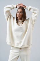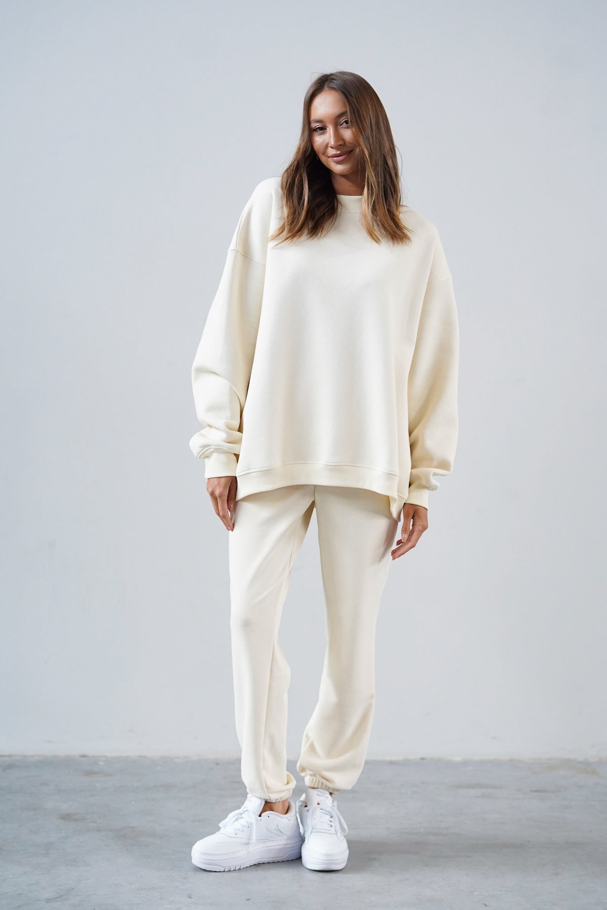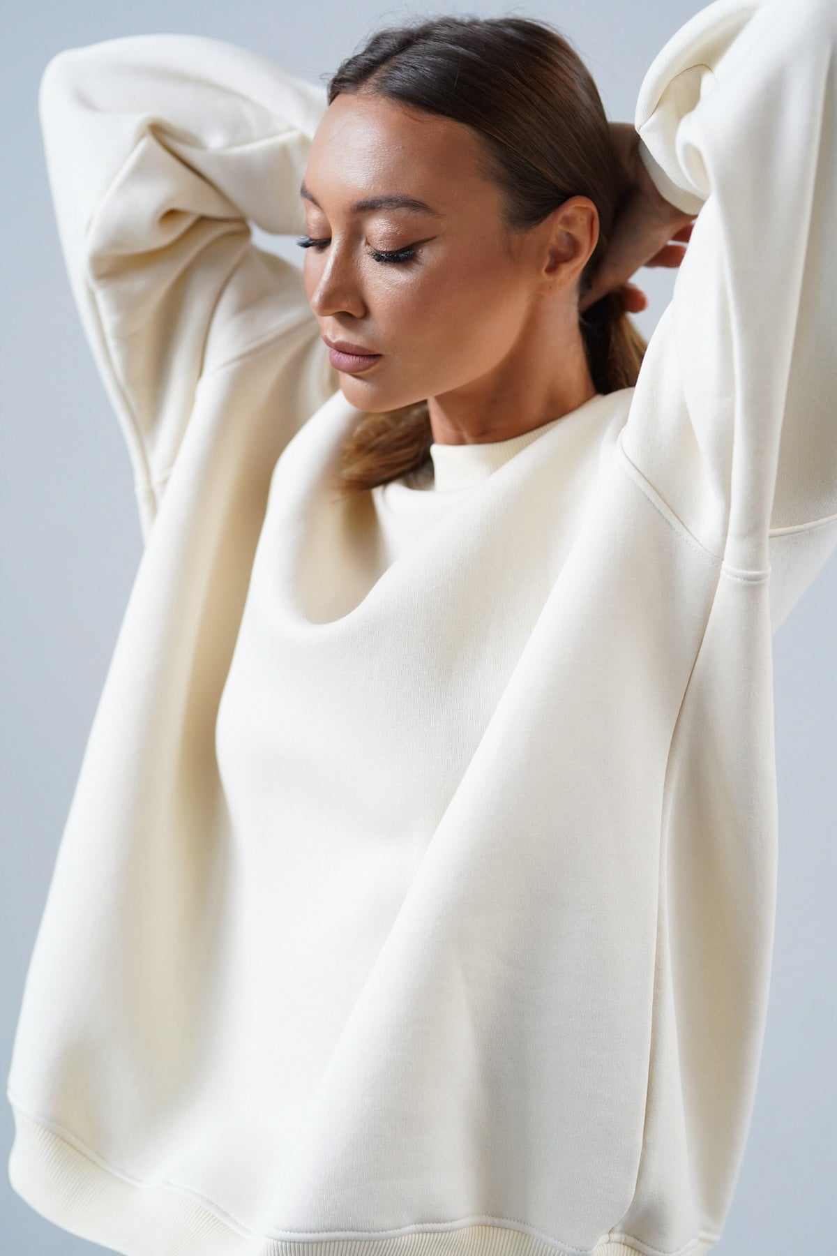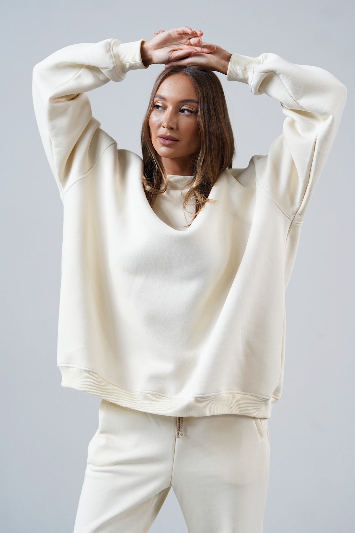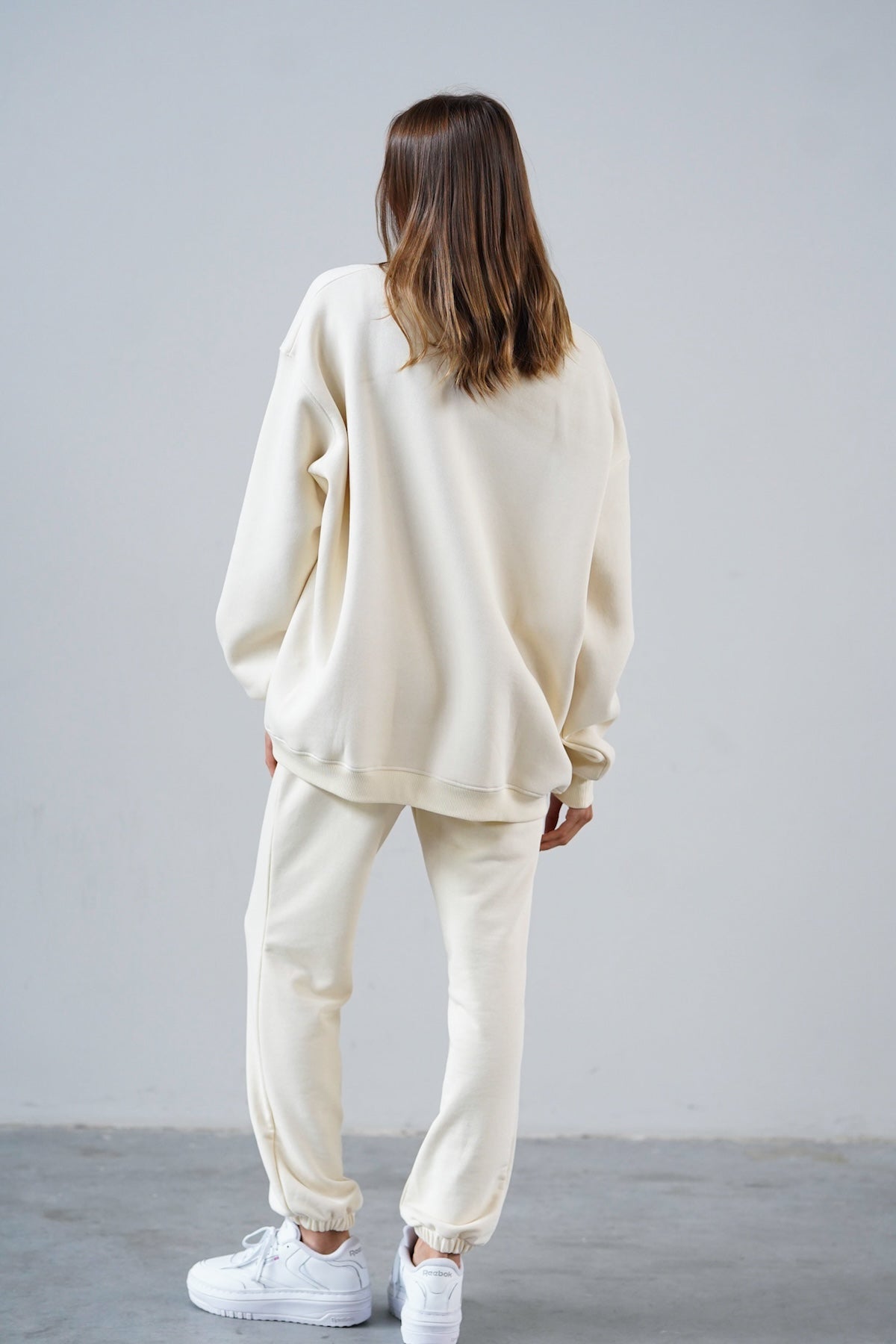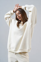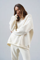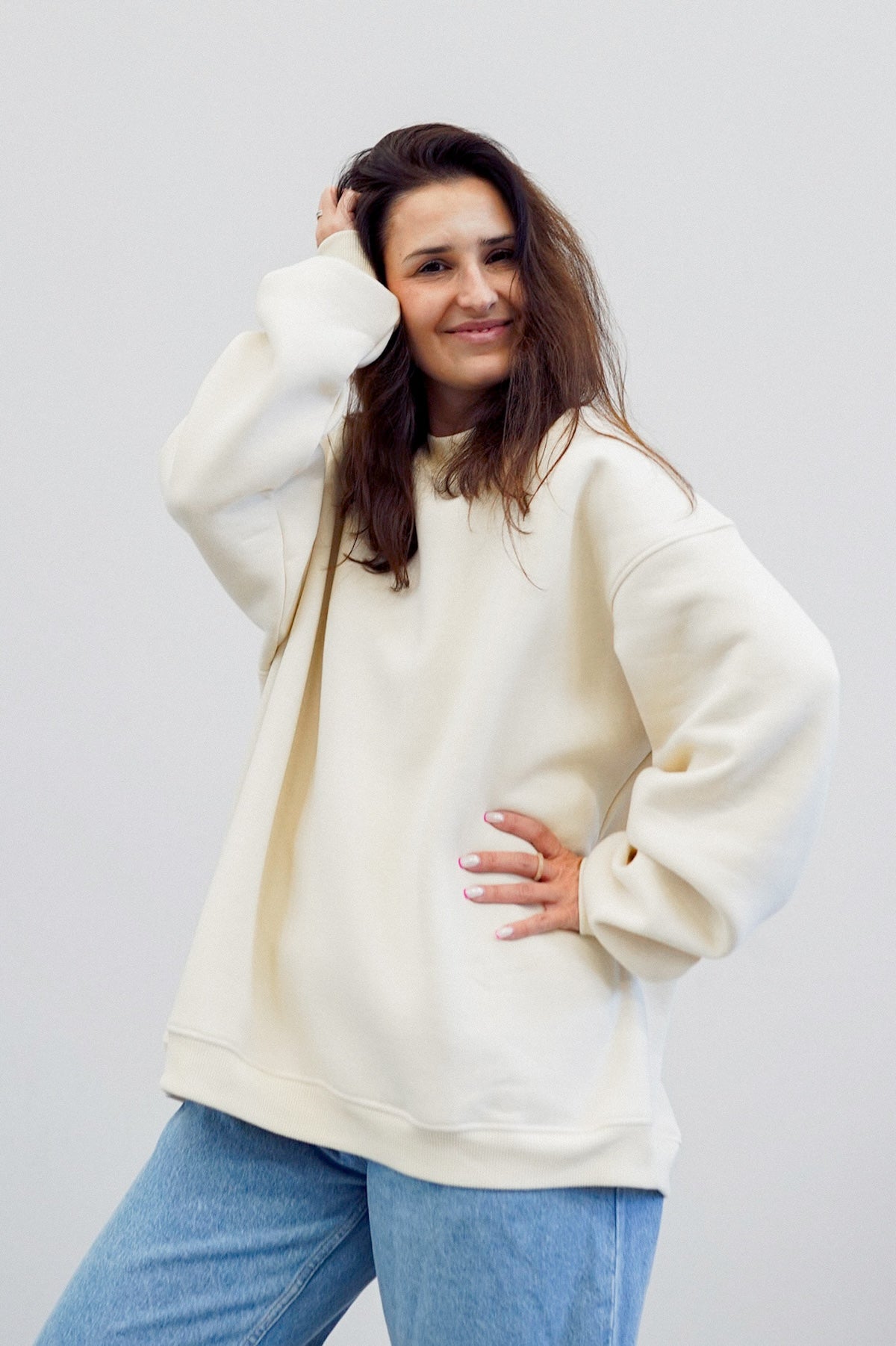 It has an oversized cut in an urban style, which we've given a sporty twist. Nonchalance is added by wider sleeves, finished with an aesthetic welt, and a longer cut, also with a neat finish. All enclosed in fleecy, warm cotton with a characteristic and already well-known teddy bear on the inside. Perfect for a weekend chill on the couch, a walk with friends or any outing.