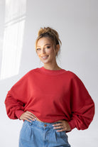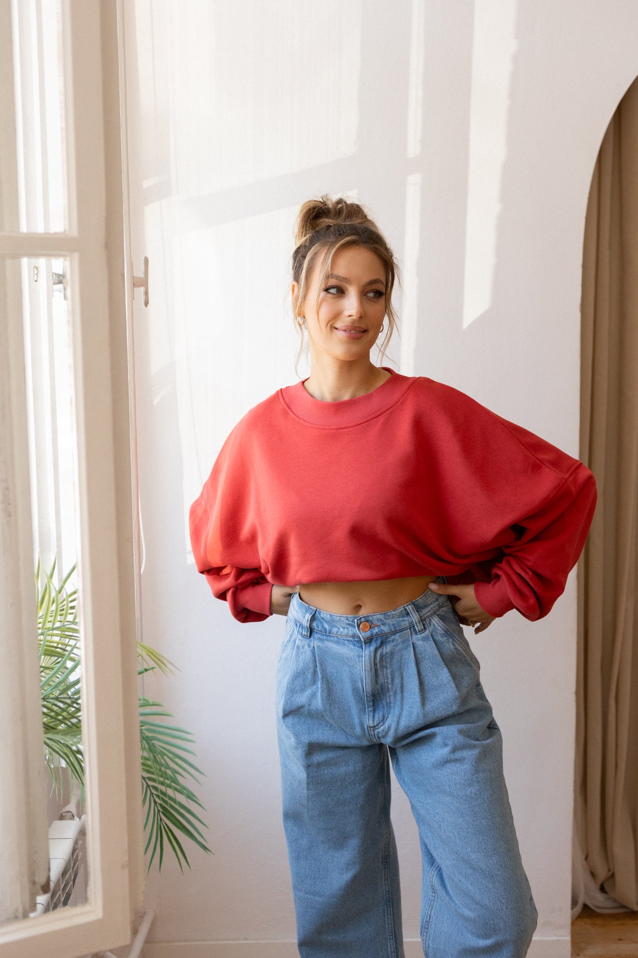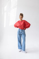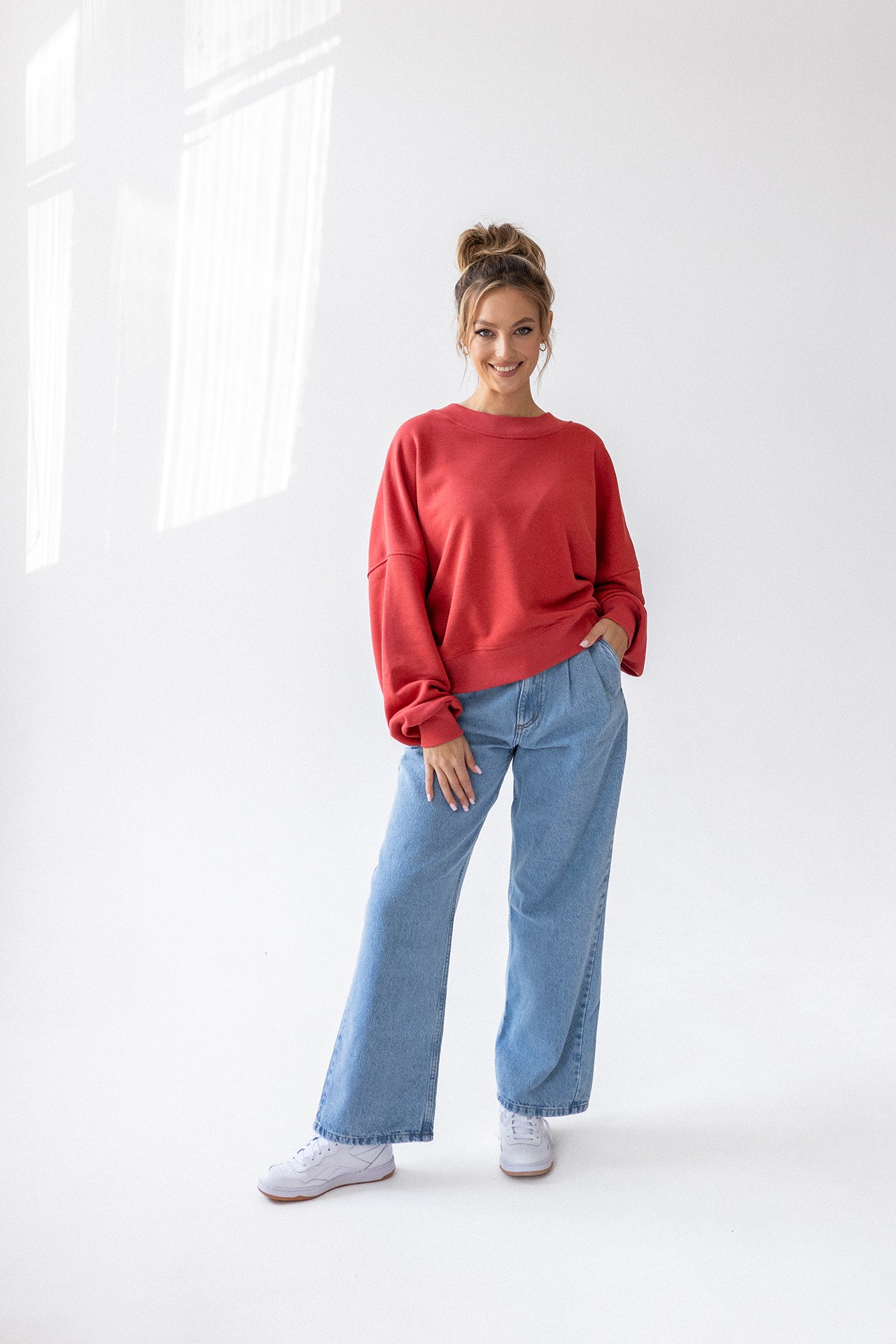 It is distinguished by its lowered shoulder line and wider, puffy sleeves, which literally add style and immediately attract attention. Additionally, a loose, oversized and slightly nonchalant cut, although shorter because it reaches just to the hips. The bottom is finished with a wider cuff, which also enhances the sleeves and neckline. Effect? Comfort has not looked so feminine and original for a long time.