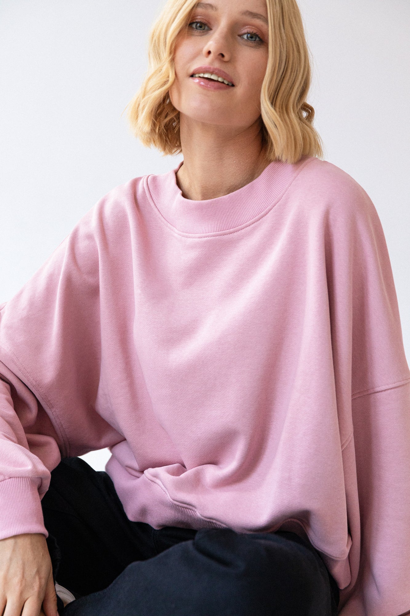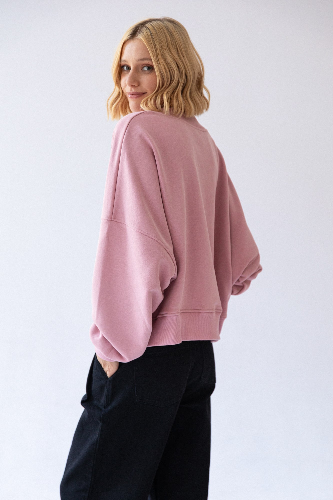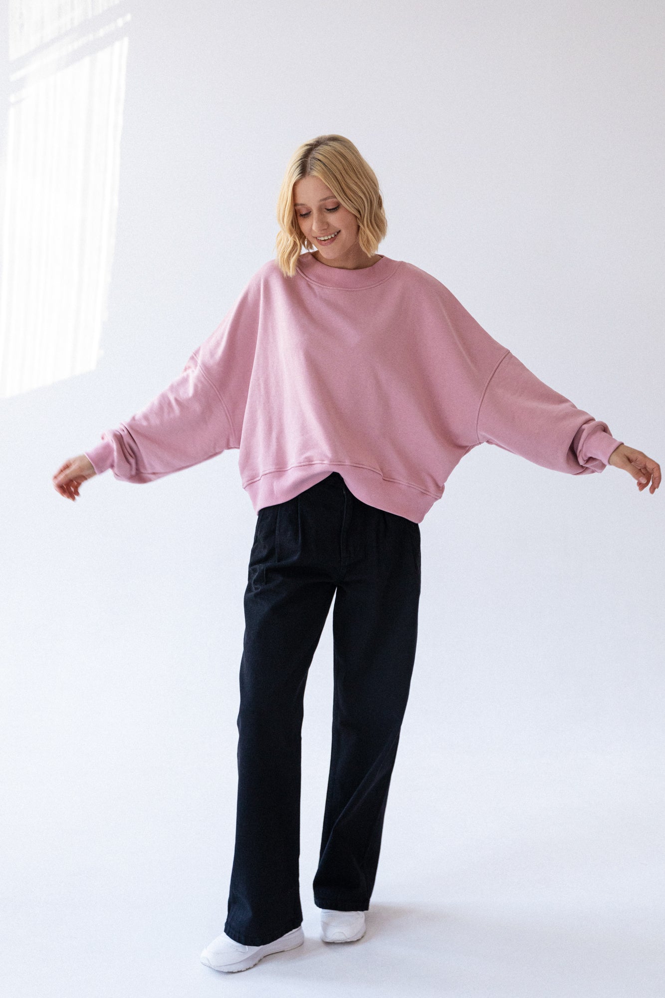 It is distinguished by its lowered shoulder line and wider, puffy sleeves, which literally add style and immediately attract attention. Additionally, a loose, oversized and slightly nonchalant cut, although shorter because it reaches just to the hips. The bottom is finished with a wider cuff, which also enhances the sleeves and neckline. Effect? Comfort has not looked so feminine and original for a long time.