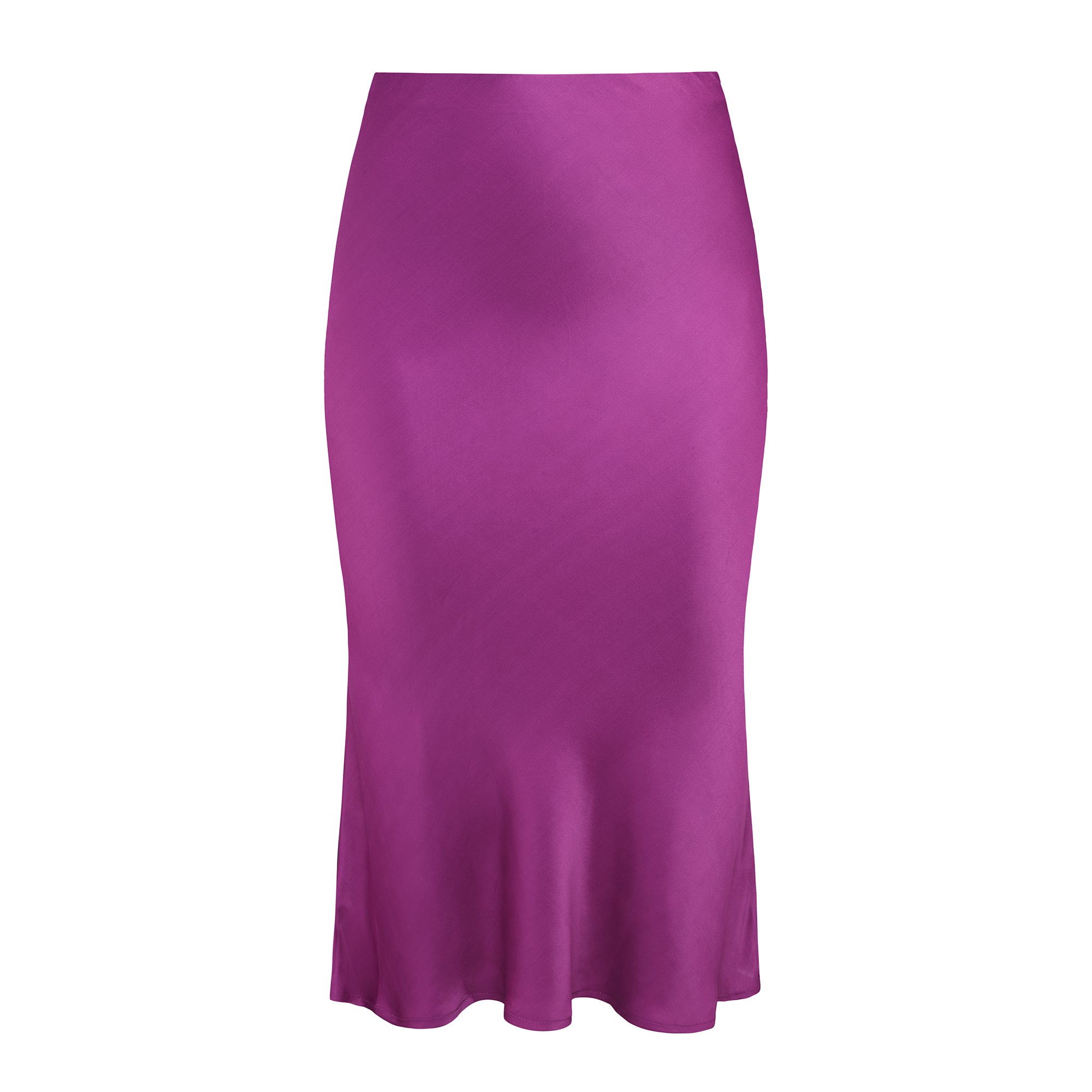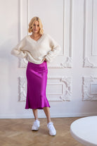 It has a timeless, fitted but not tight cut that not only drapes beautifully but also accentuates your figure. A subtle elastic waistband ensures comfort while highlighting the waist, and the satin viscose fabric adds a touch of lightness. Add to that the midi length, falling just below the knee, that gives it a casual feel and makes it perfect for everyday outfits.