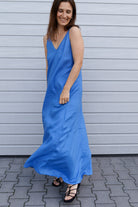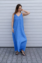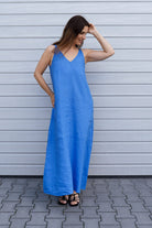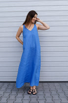 It has slightly wider straps that beautifully reveal the shoulders and a slightly deeper V-neckline, exposing the neck and collarbones. Plus straight lines and a length just above the ankle - after all, it is a maxi dress. The material is 100% linen, which is not only light and pleasant to the body, but also ensures ease of wearing.