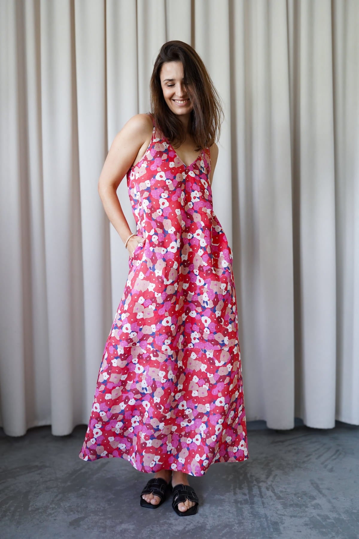 It has slightly wider straps that beautifully reveal the shoulders and a slightly deeper V-neckline, exposing the neck and collarbones. Plus straight lines and a length just above the ankle - after all, it is a maxi dress. The material is 100% linen, which is not only light and pleasant to the body, but also ensures ease of wearing.