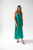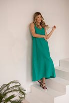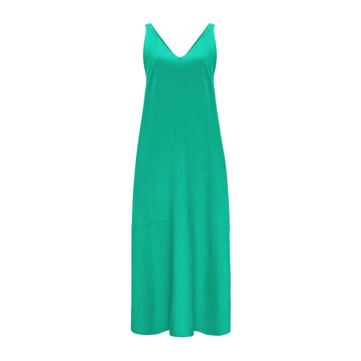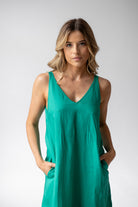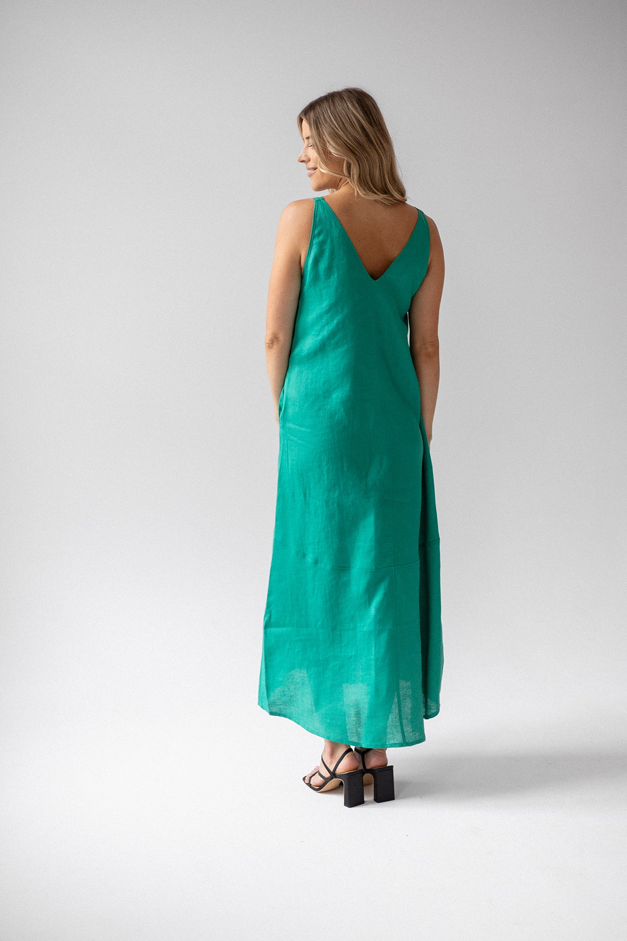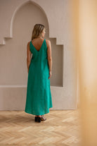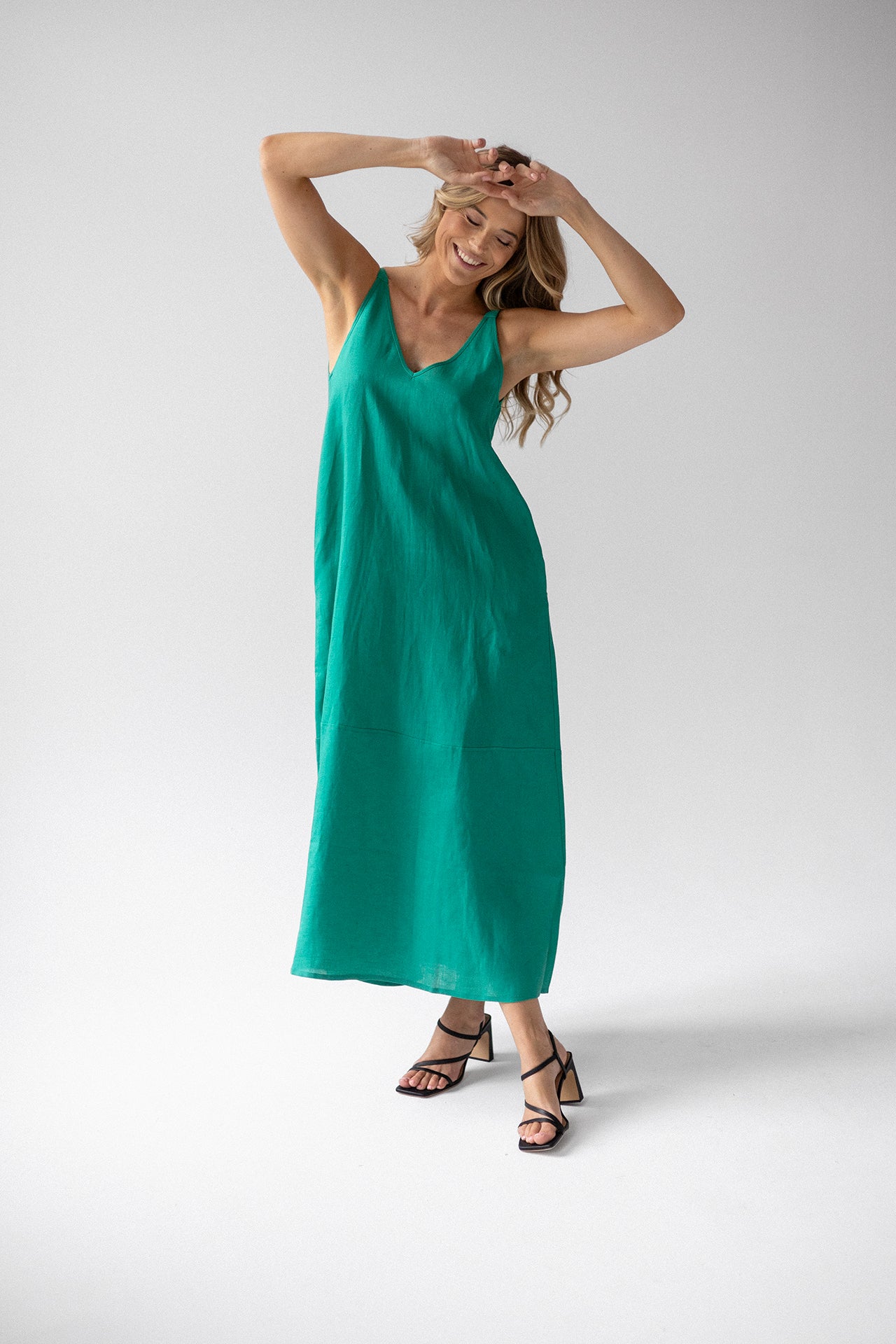 It has slightly wider straps that beautifully reveal the shoulders and a slightly deeper V-neckline, exposing the neck and collarbones. Plus straight lines and a length just above the ankle - after all, it is a maxi dress. The material is 100% linen, which is not only light and pleasant to the body, but also ensures ease of wearing.