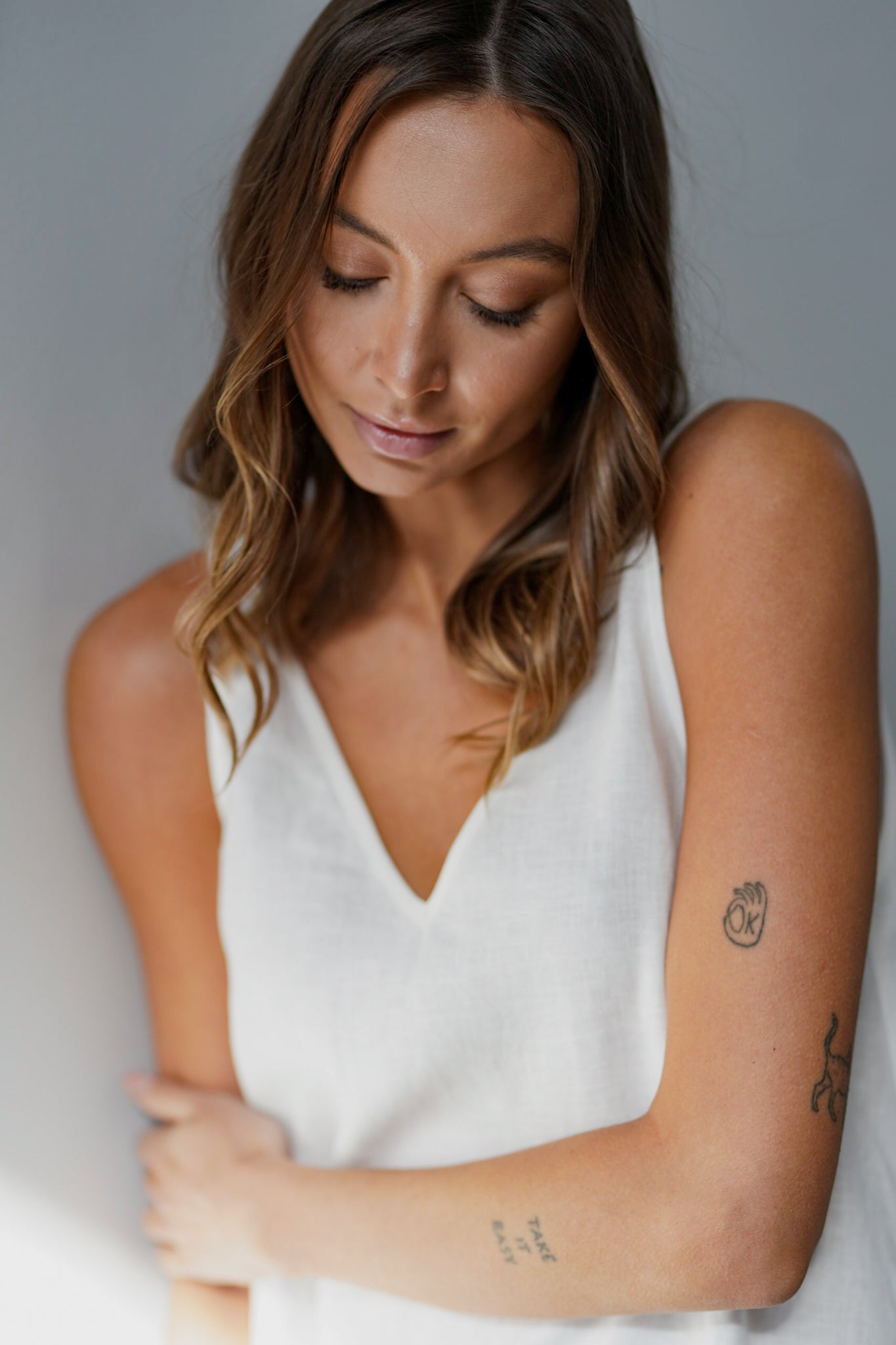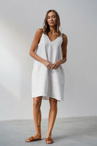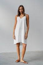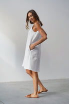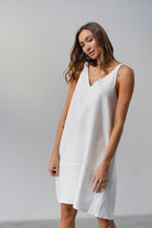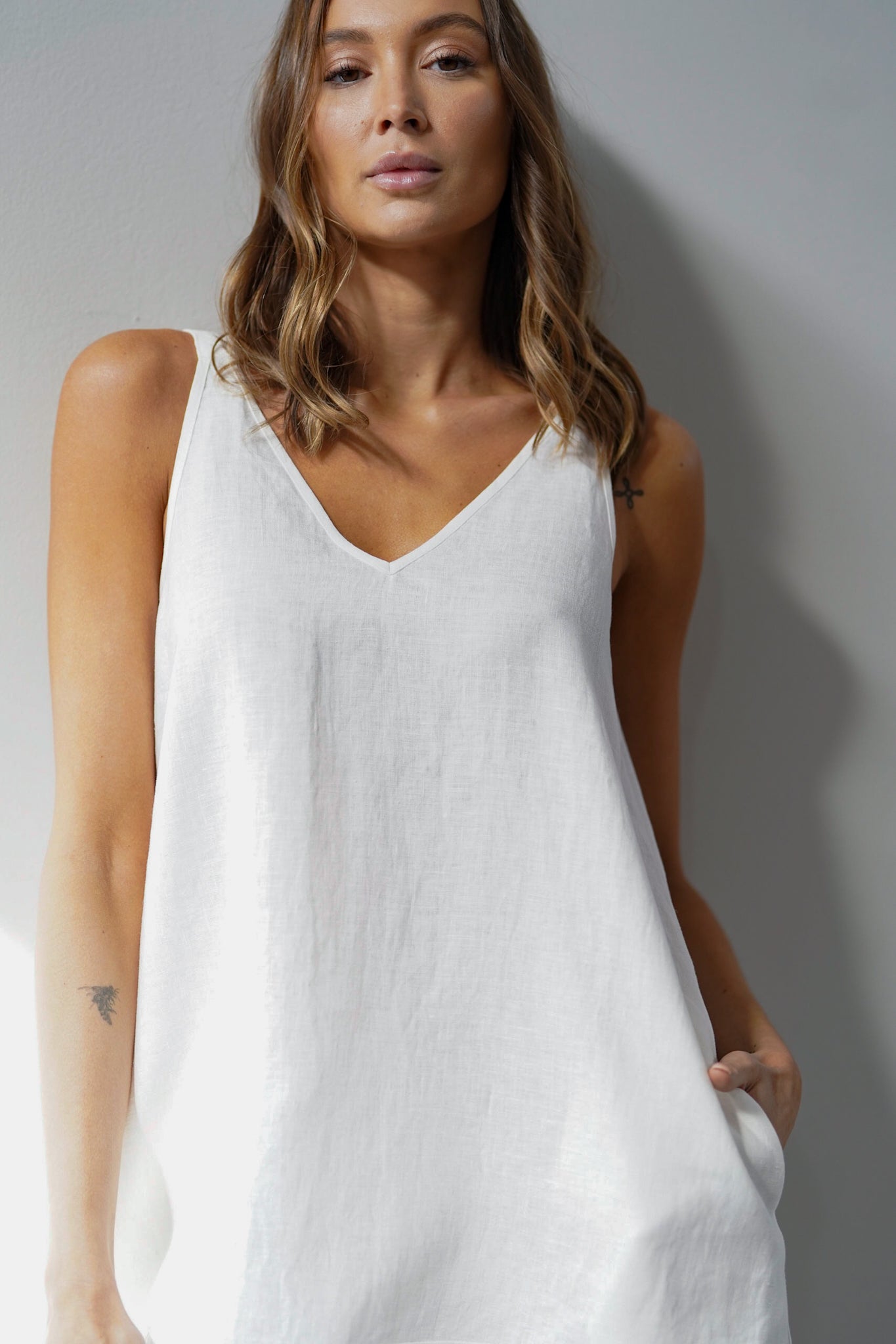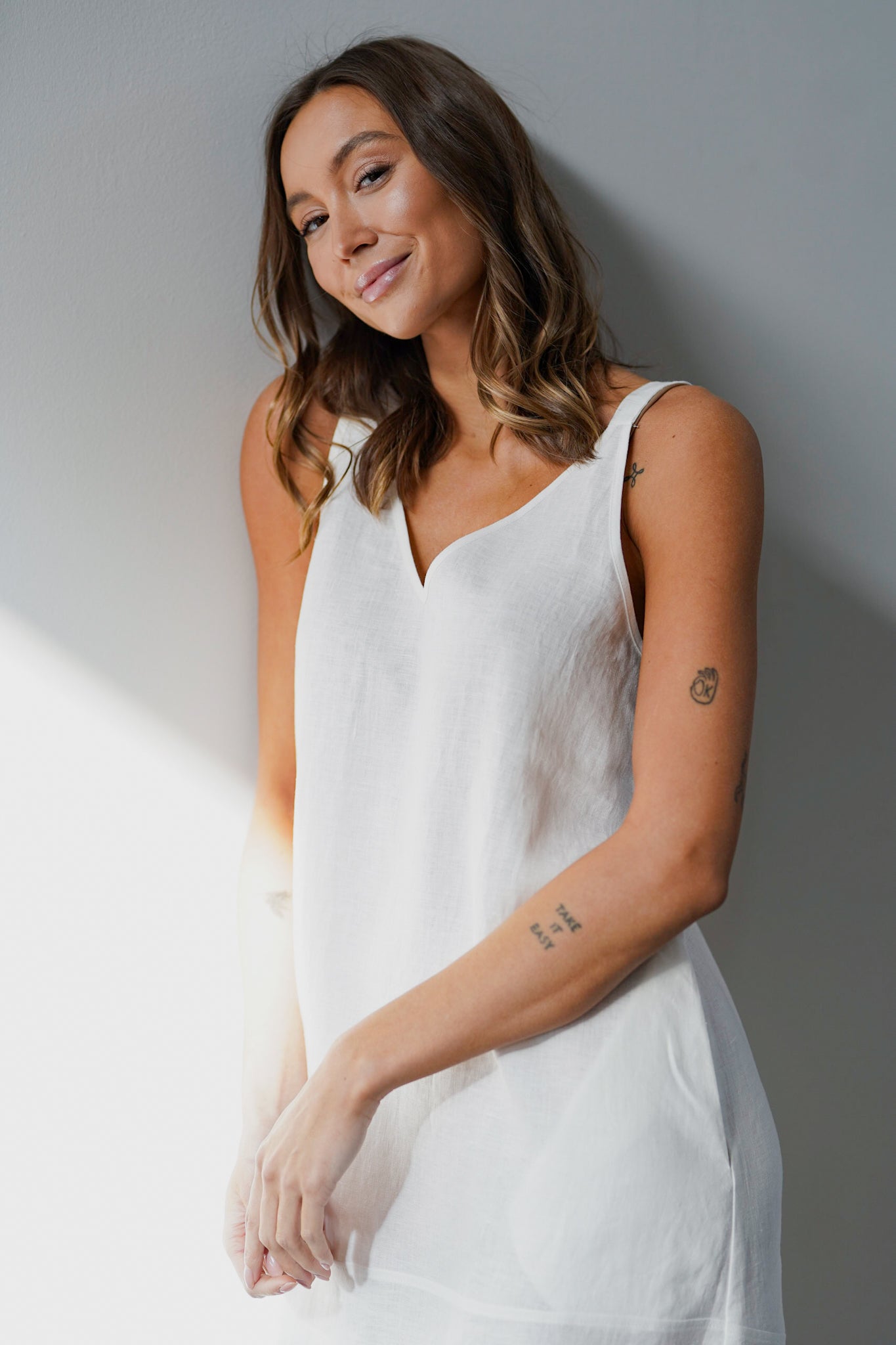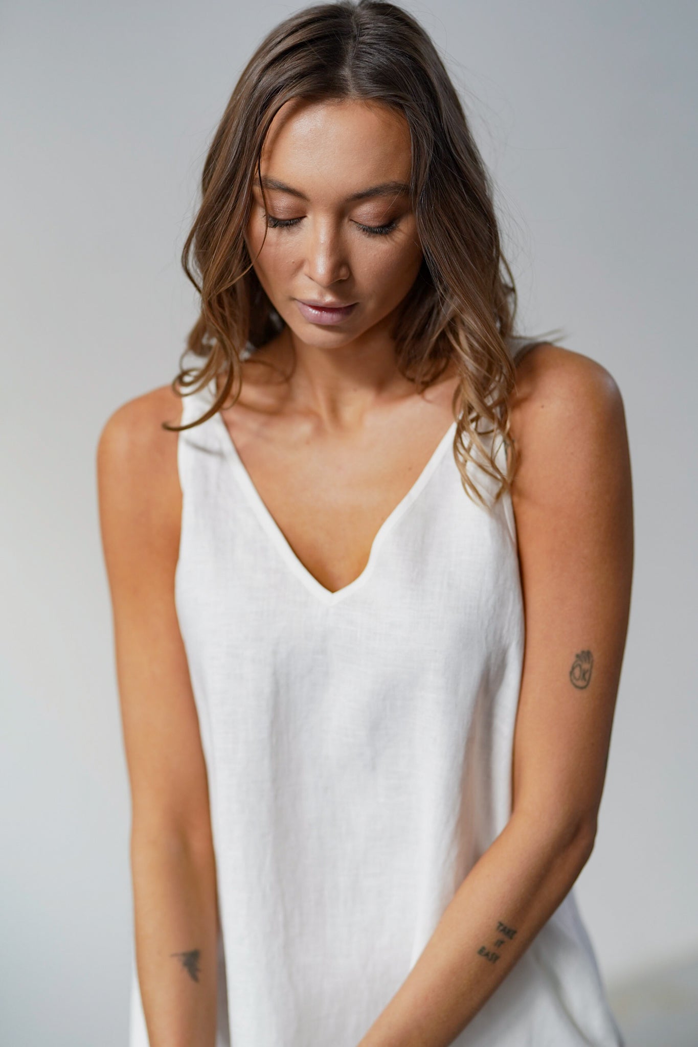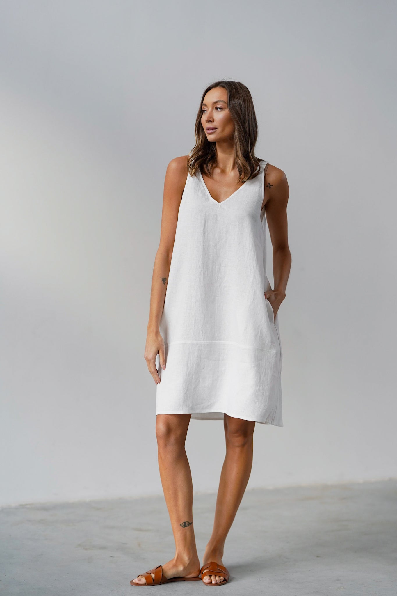 It has slightly wider straps that beautifully reveal the shoulders and a slightly deeper V-neckline, exposing the neck and collarbones. Plus straight lines and knee length, it's a summer dress after all! The material is 100% linen, which is not only light and pleasant to the body, but also ensures ease of wearing. Everything is enclosed in an airy, feminine and extremely comfortable design that will work well regardless of the situation.