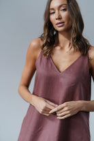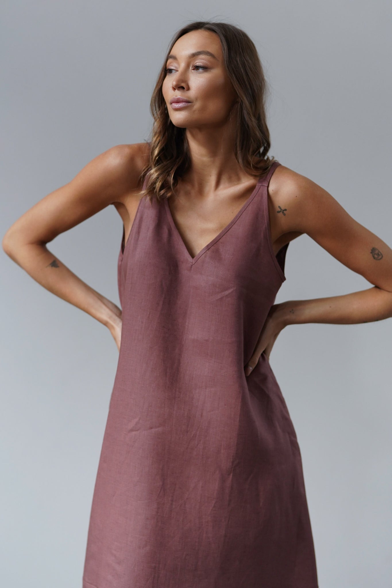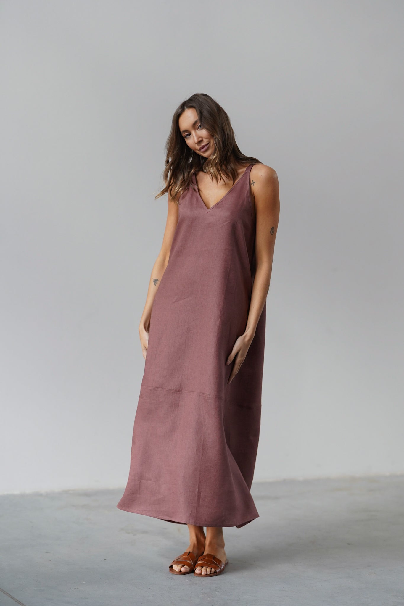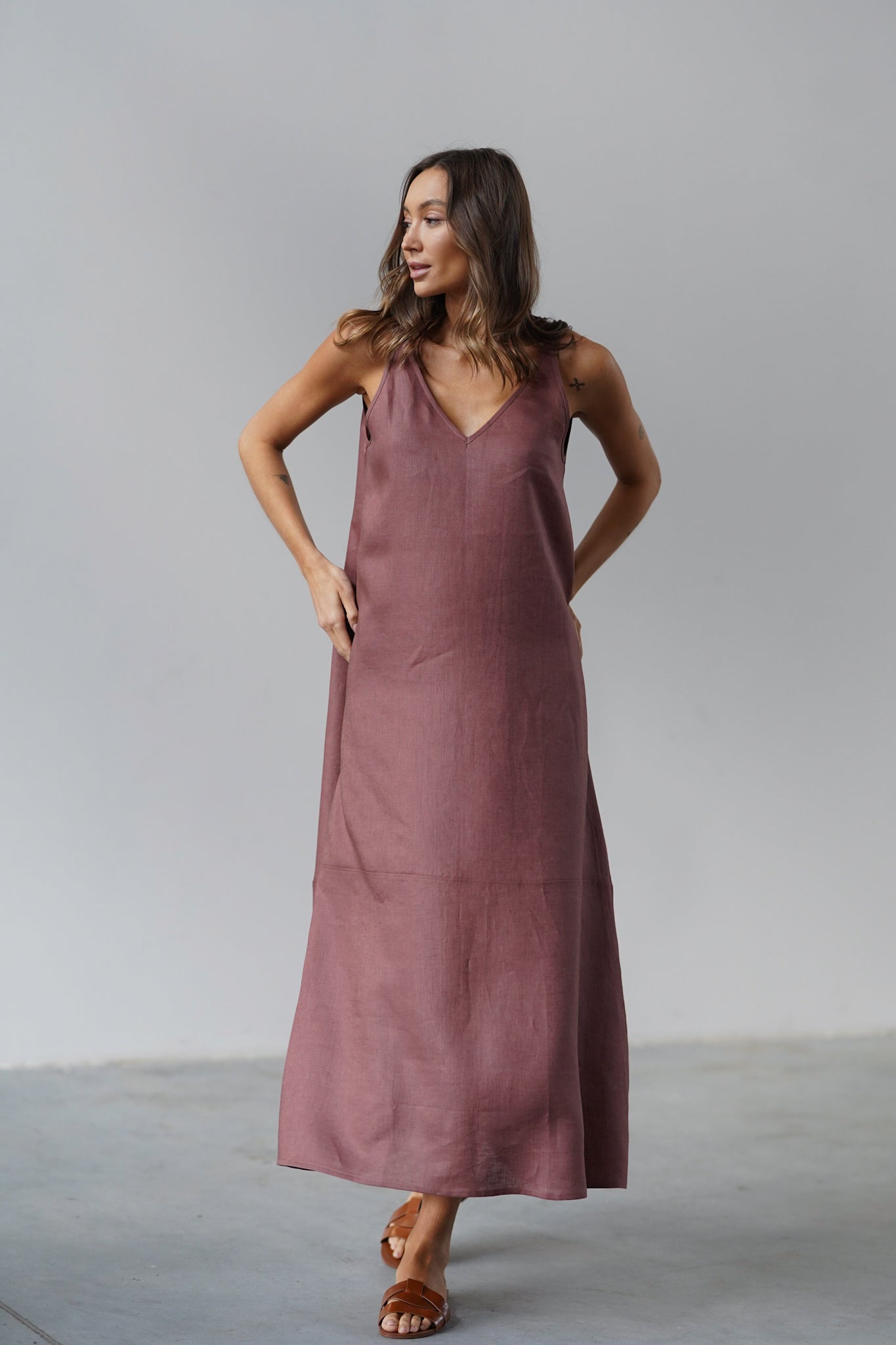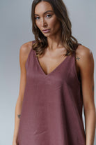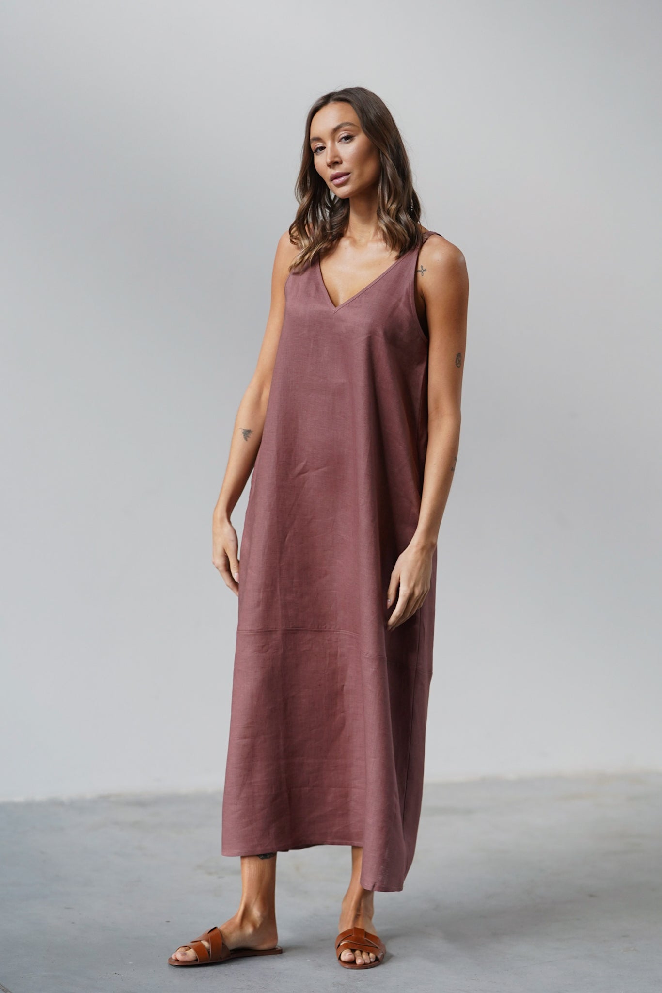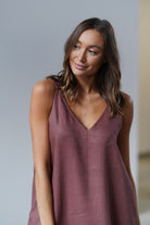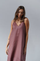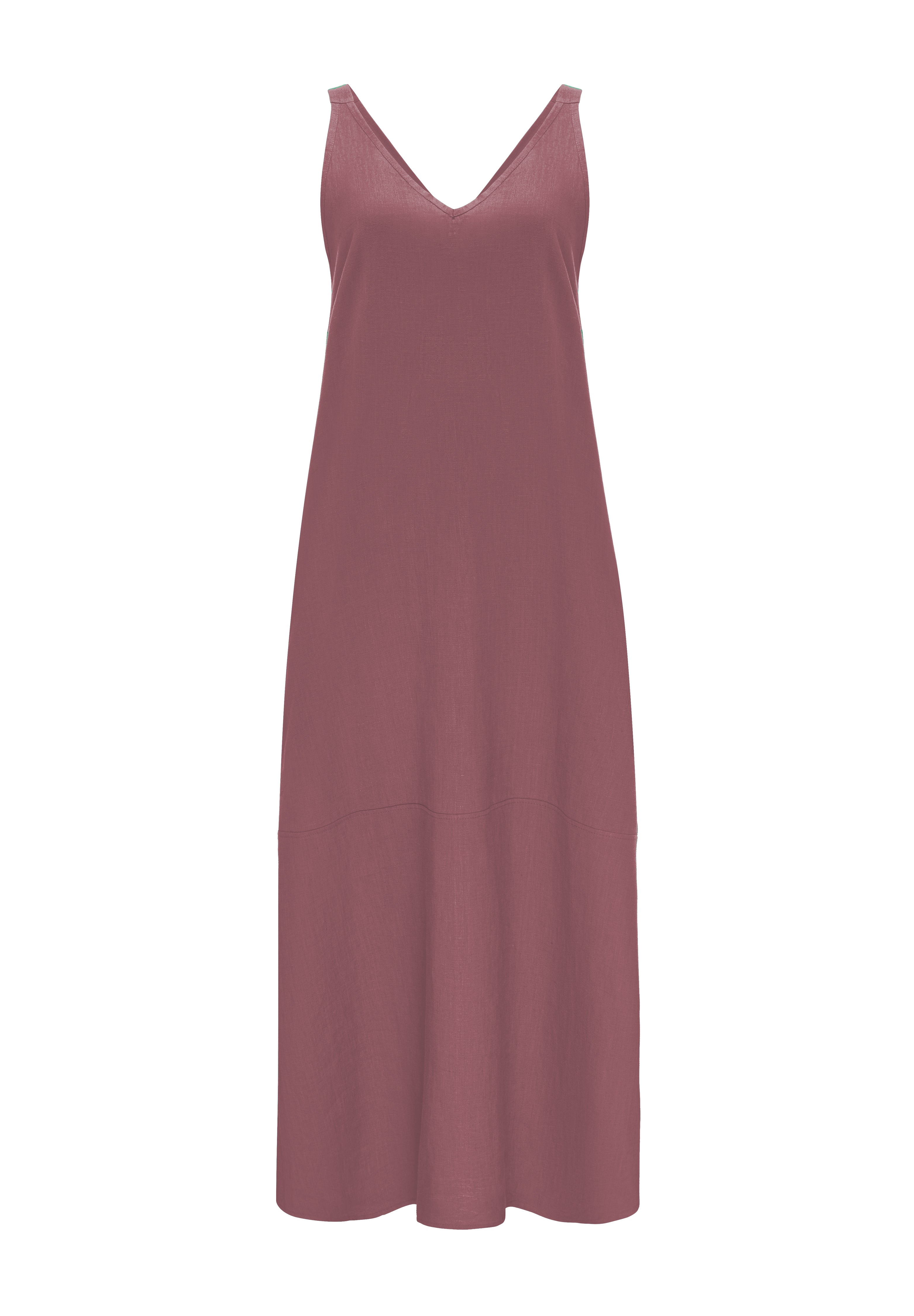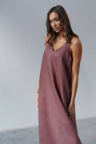 It has slightly wider straps that beautifully reveal the shoulders and a slightly deeper V-neckline, exposing the neck and collarbones. Plus straight lines and a length just above the ankle - after all, it is a maxi dress. The material is 100% linen, which is not only light and pleasant to the body, but also ensures ease of wearing.