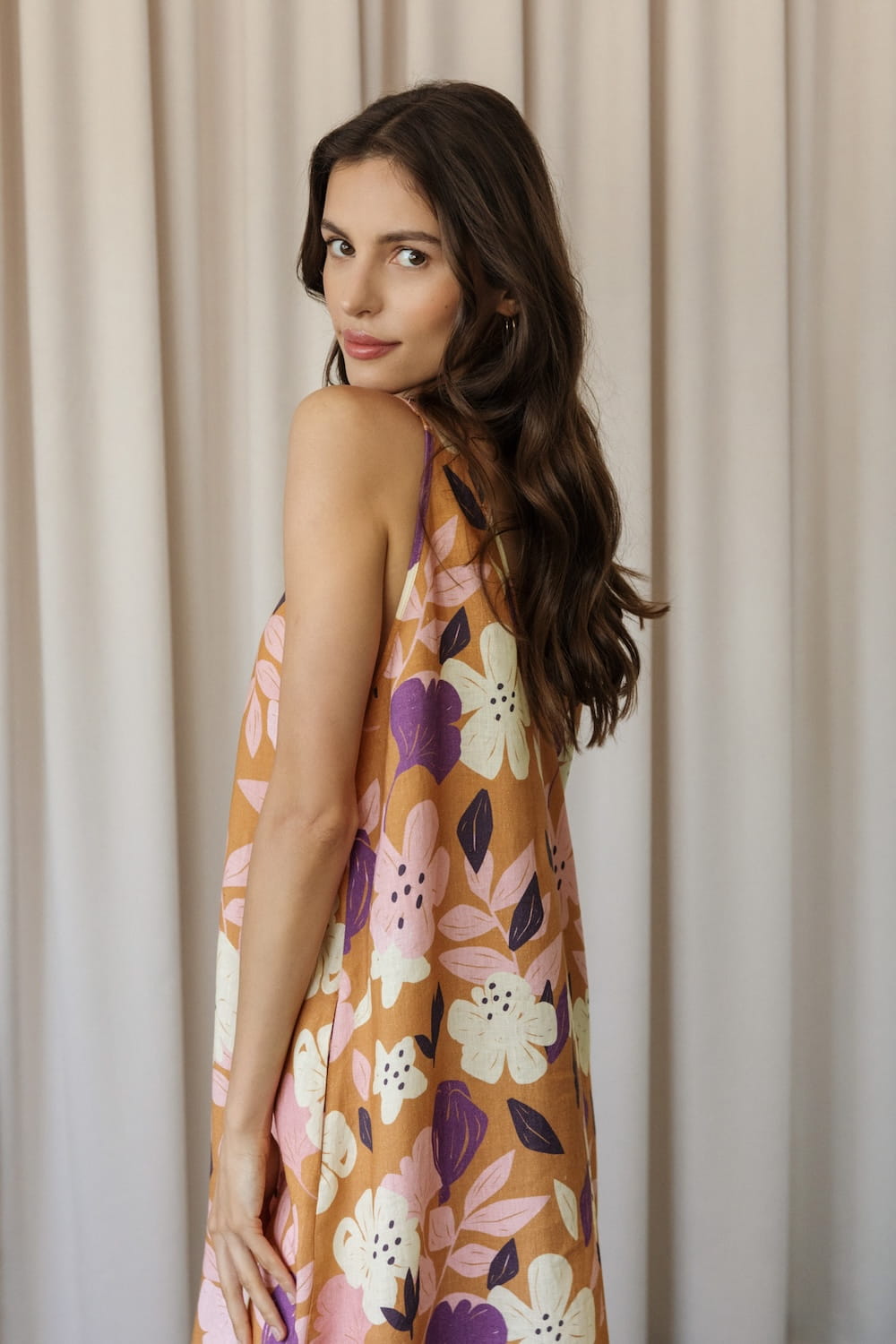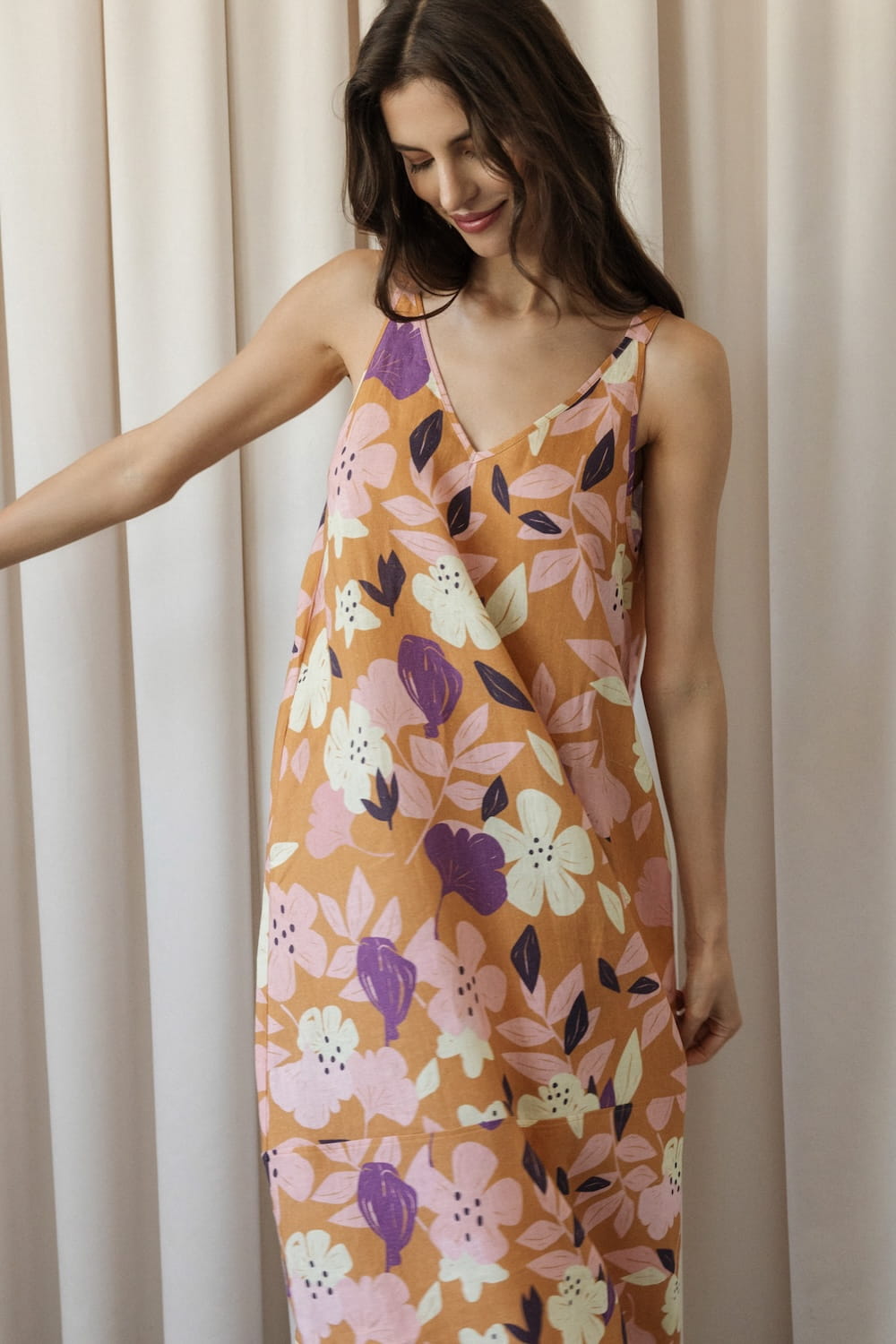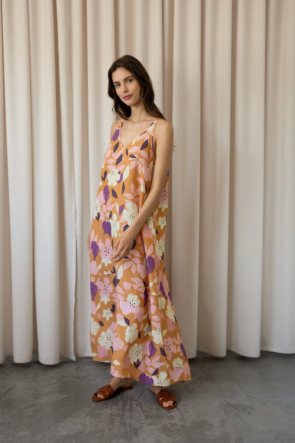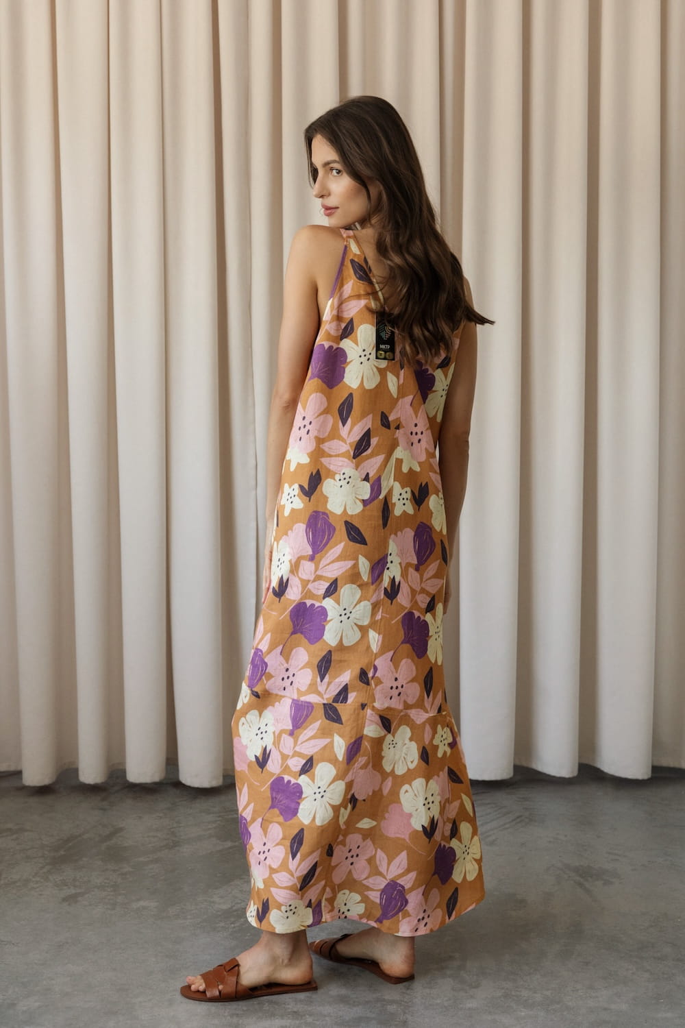 It has slightly wider straps that beautifully reveal the shoulders and a slightly deeper V-neckline, exposing the neck and collarbones. Plus straight lines and a length just above the ankle - after all, it is a maxi dress. The material is 100% linen, which is not only light and pleasant to the body, but also ensures ease of wearing.