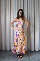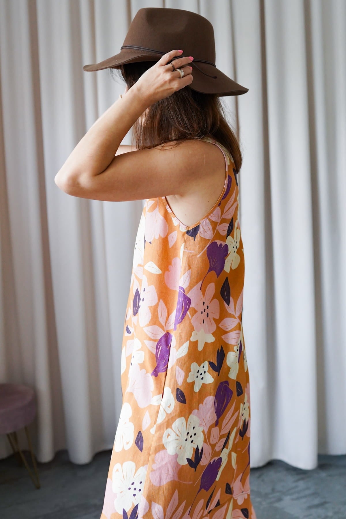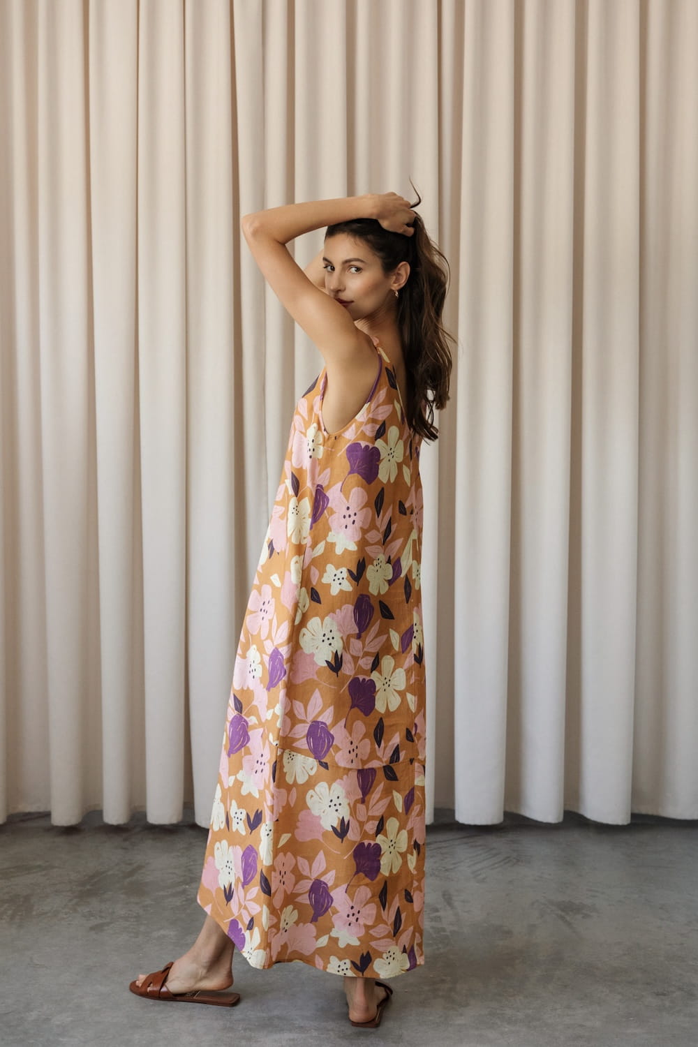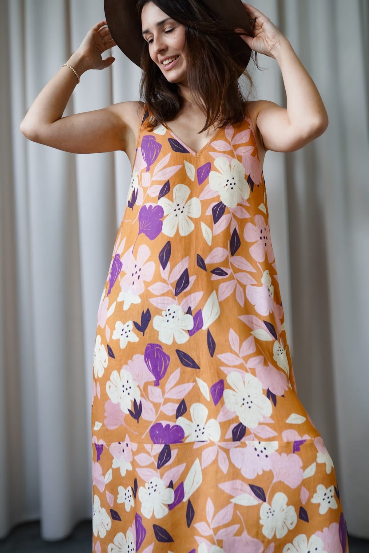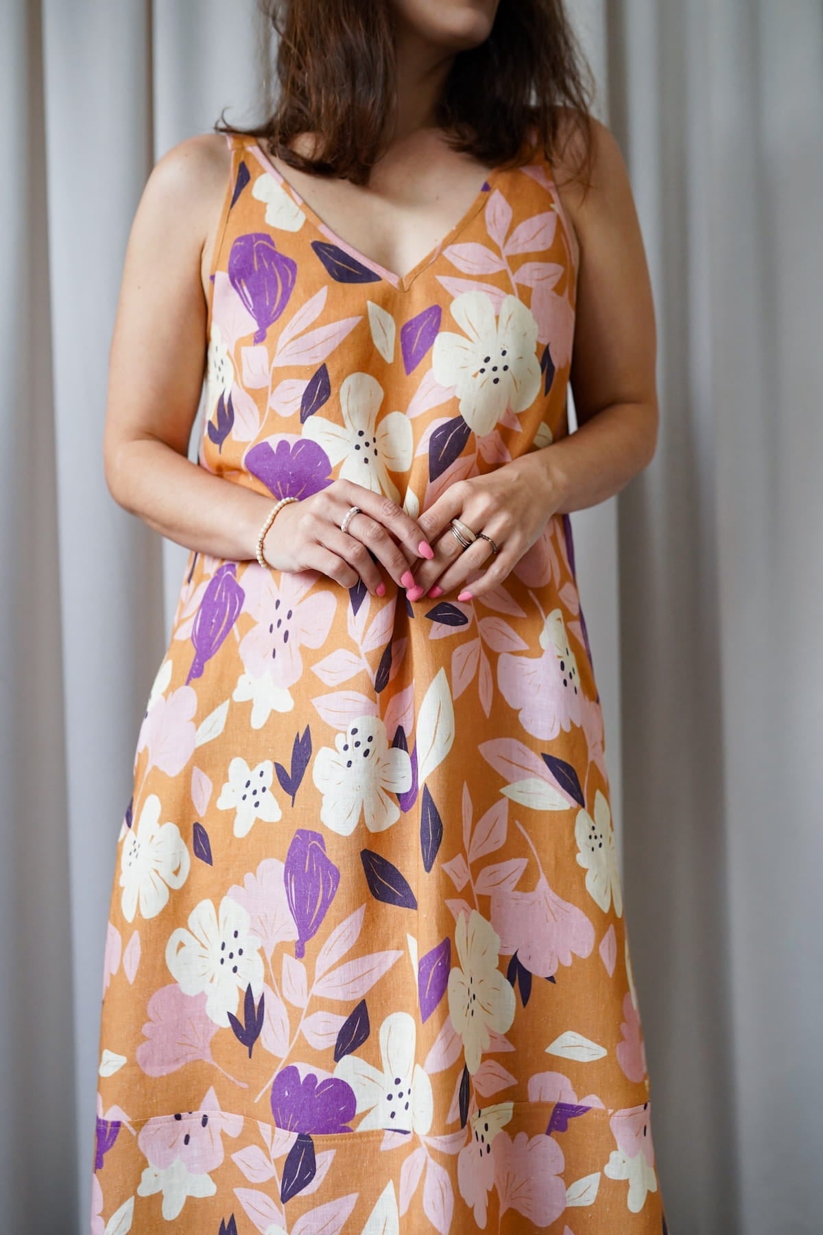 It has slightly wider straps that beautifully reveal the shoulders and a slightly deeper V-neckline, exposing the neck and collarbones. Plus straight lines and a length just above the ankle - after all, it is a maxi dress. The material is 100% linen, which is not only light and pleasant to the body, but also ensures ease of wearing.