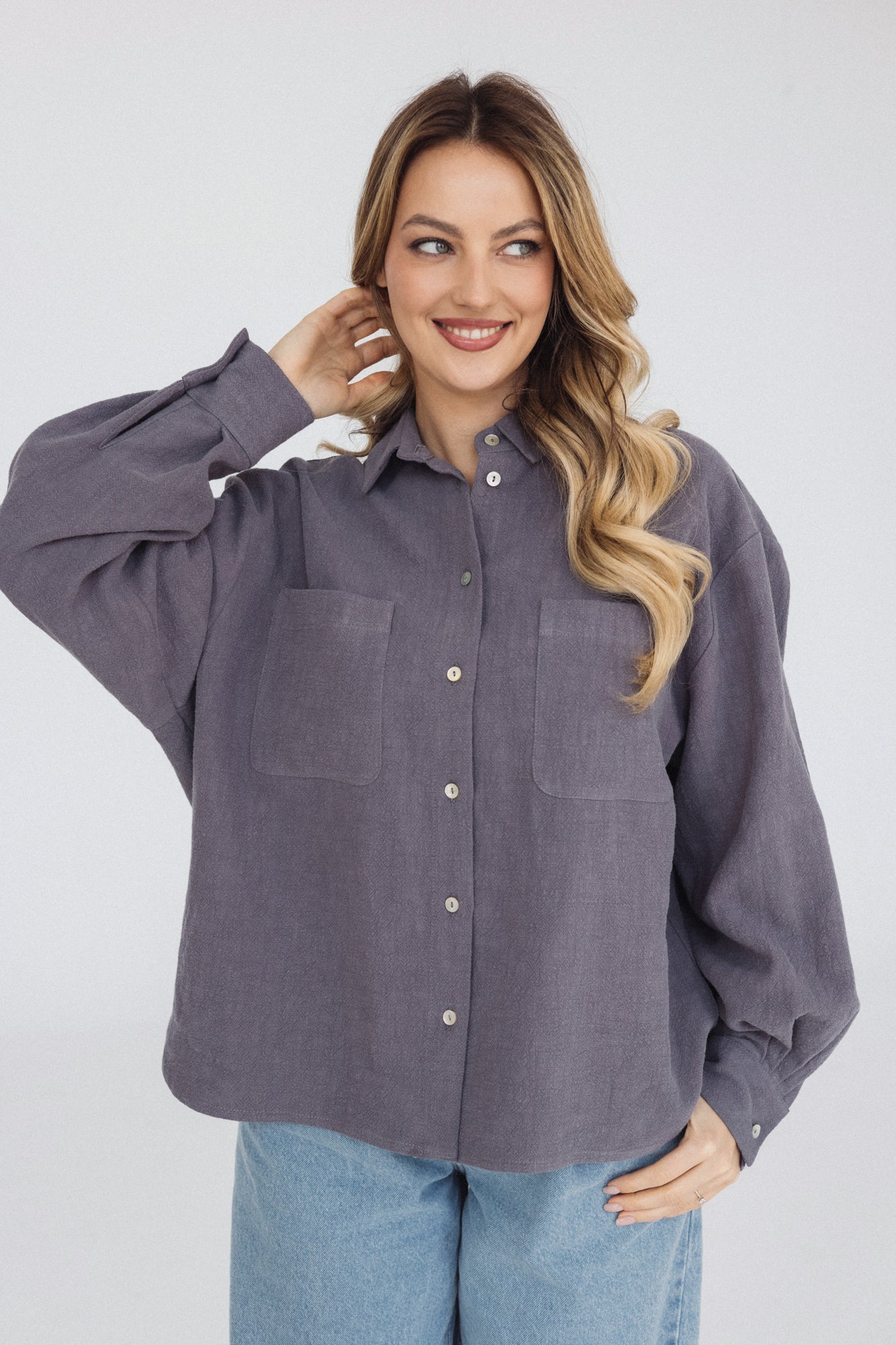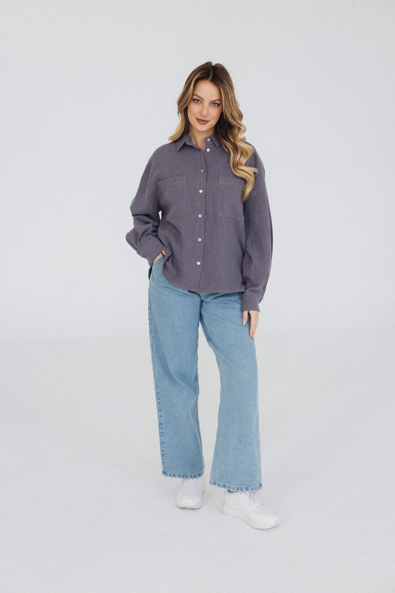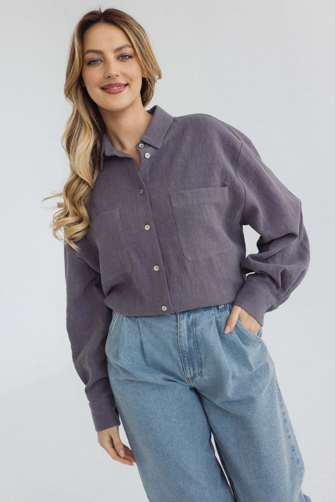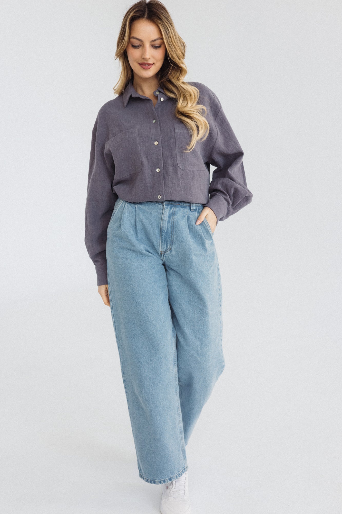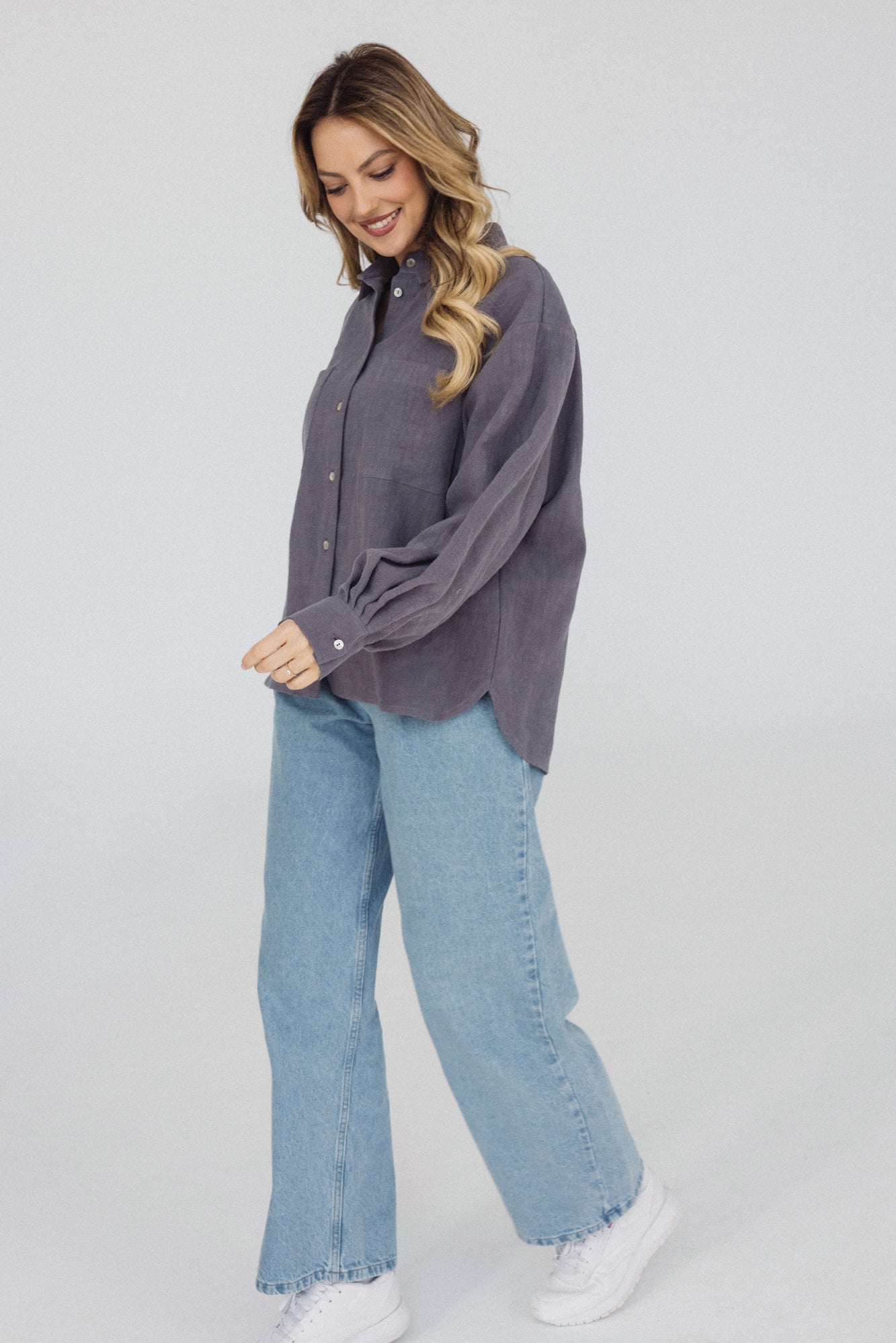 It has a timeless, slightly oversized, boxy cut, which, combined with muslin cotton, creates the perfect combination of casualness and femininity, definitely not only for summer. However, we had to spice up the classics. Nonchalantly widened, shorter sleeves with delicate cuffs and an asymmetric hem add character to it.