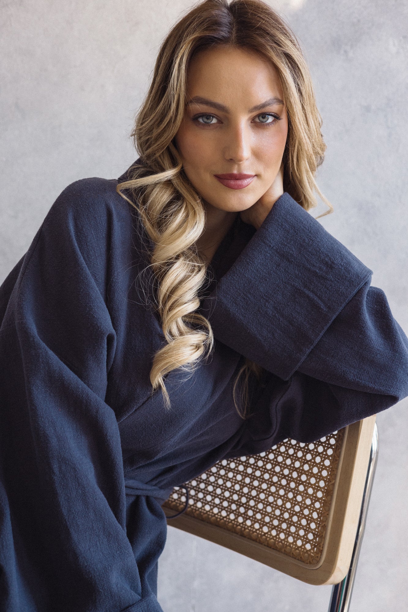 It has a timeless, slightly oversized, boxy cut, which, combined with muslin cotton, creates the perfect combination of casualness and femininity, definitely not only for summer. However, we had to spice up the classics. Nonchalantly widened, shorter sleeves with delicate cuffs and an asymmetric hem add character to it.