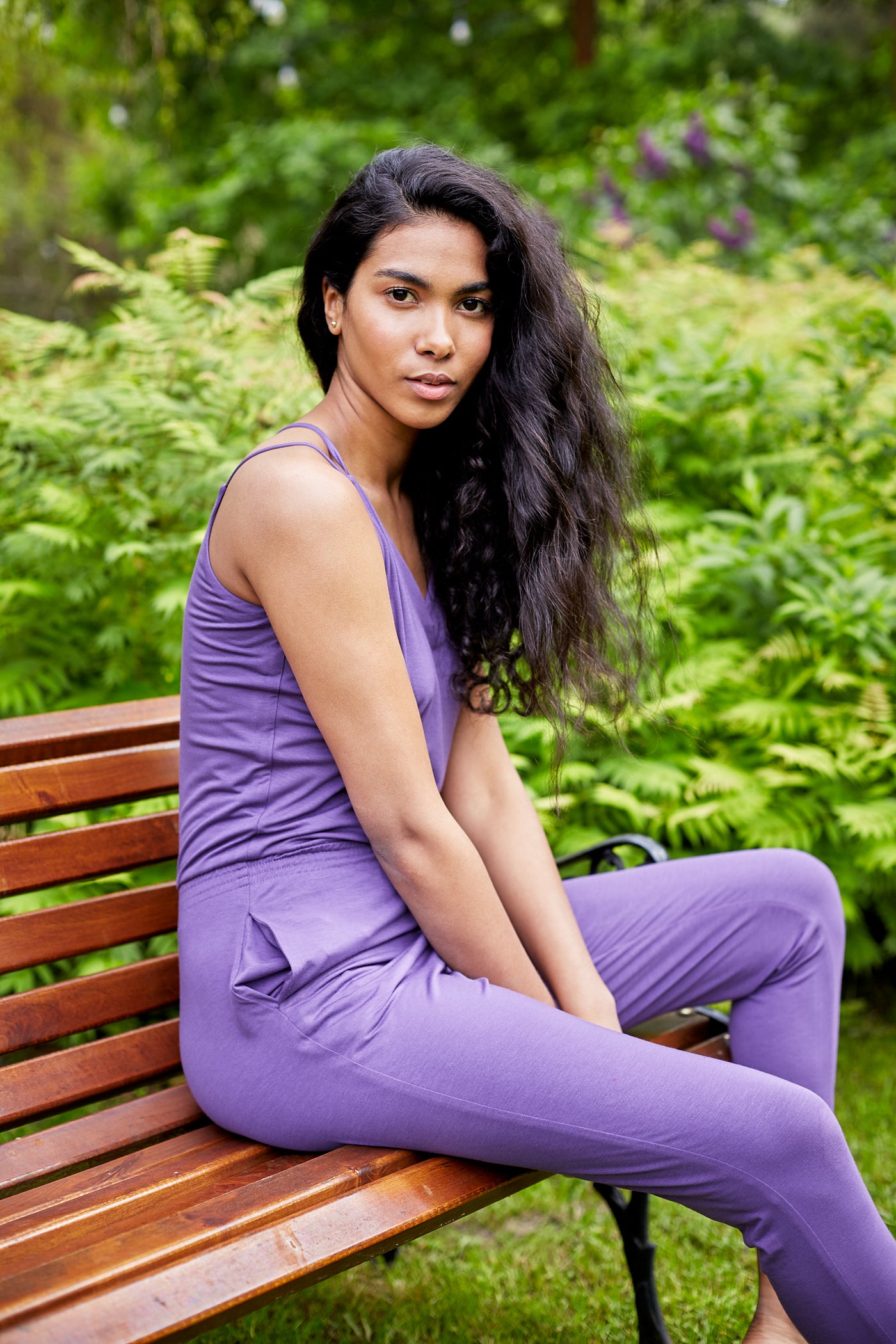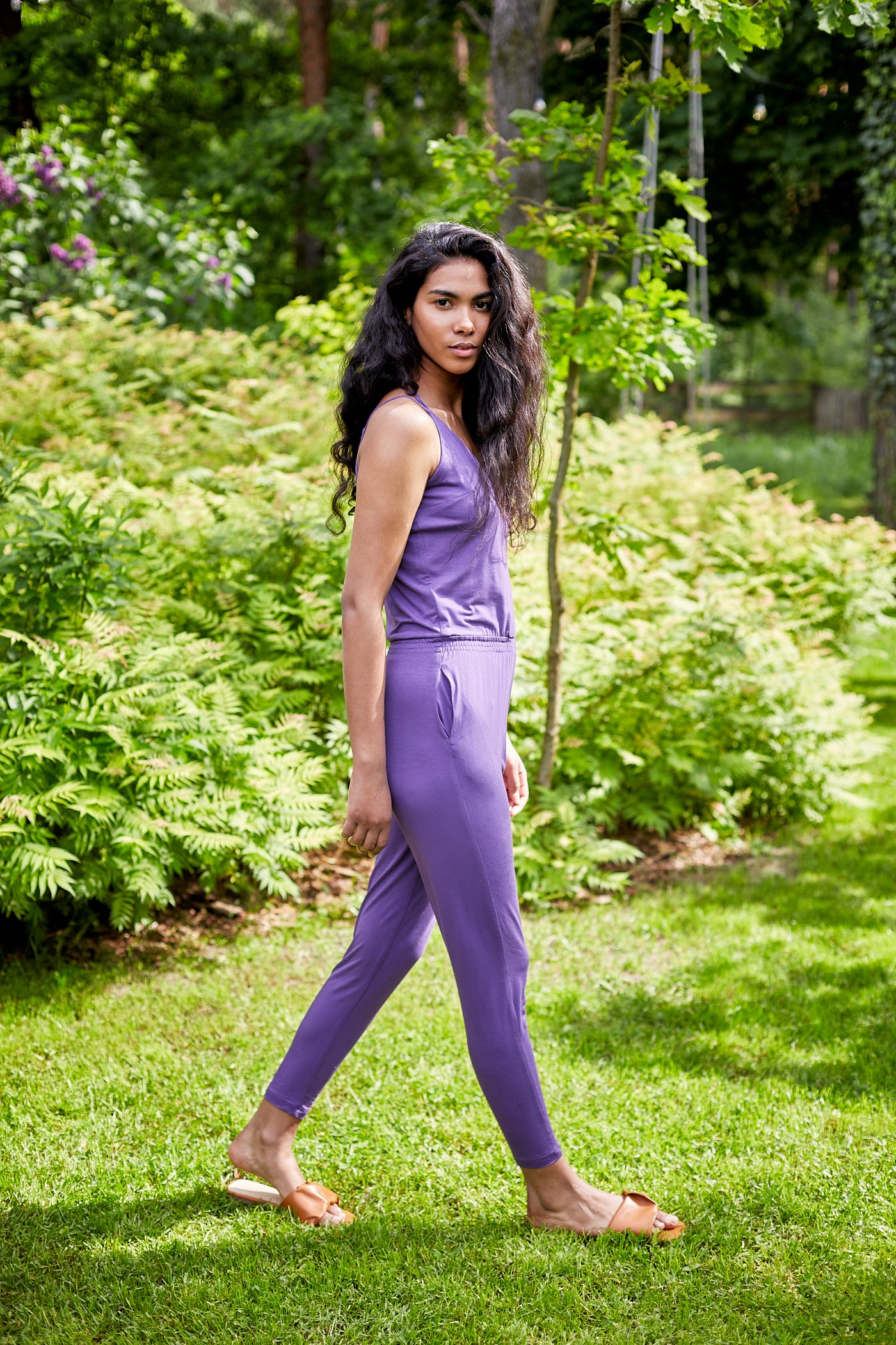 The top is a delicate and girlish top with thin straps, which reveals most of its secrets from the back, flirtatiously revealing the back. The bottom is slightly looser trousers that give it a bit of nonchalance. In addition, there is a comfortable elastic band at the waist, which does not compress and only further exposes the waist.