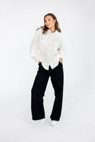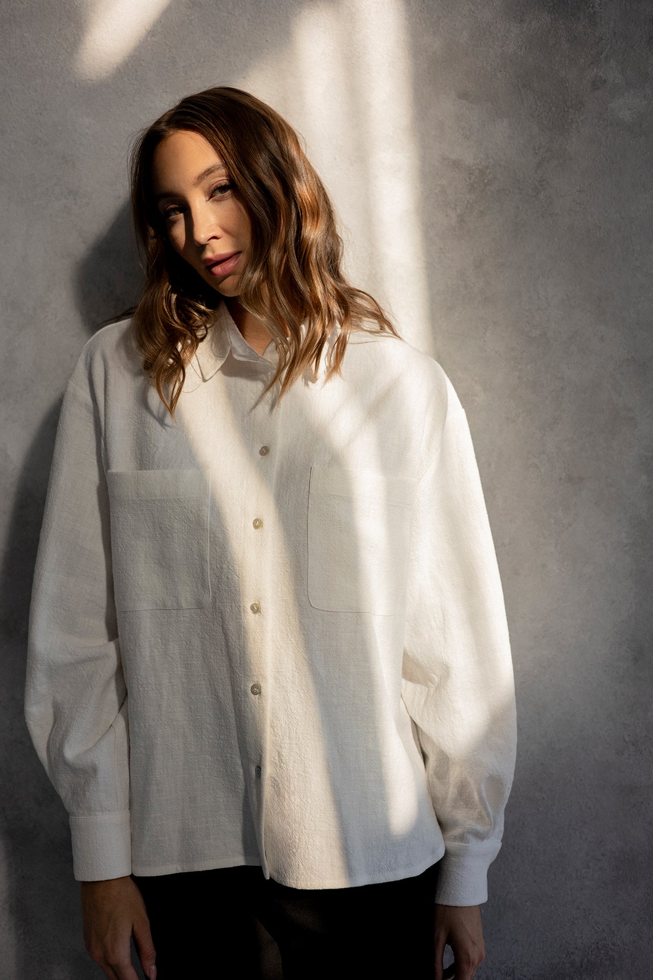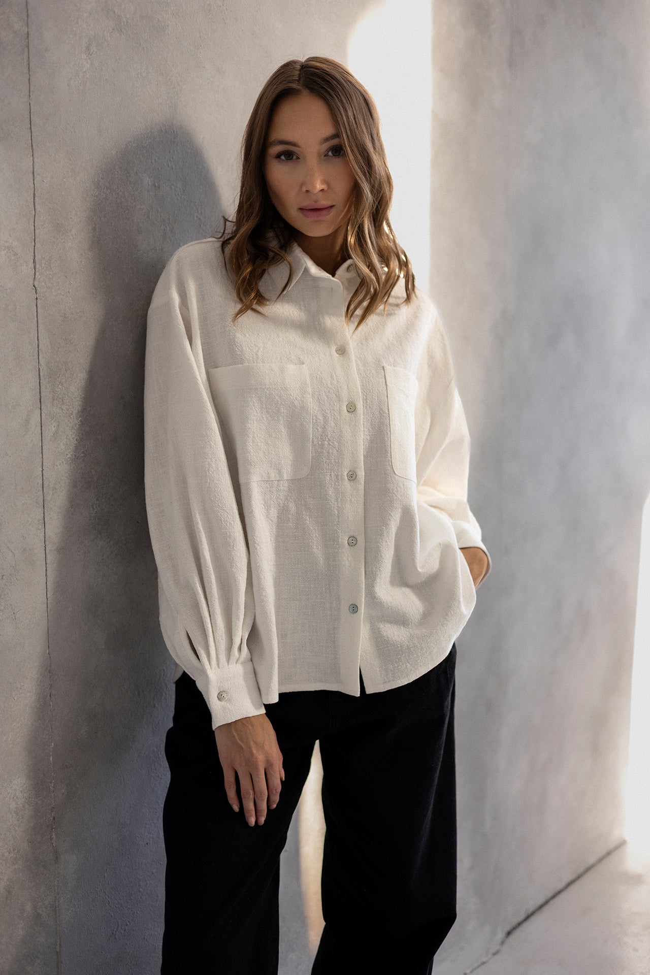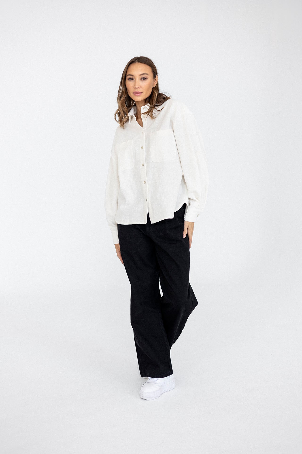 It has a timeless, slightly oversized, boxy cut, which, combined with muslin cotton, creates the perfect combination of casualness and femininity, definitely not only for summer. However, we had to spice up the classics. Nonchalantly widened, shorter sleeves with delicate cuffs and an asymmetric hem add character to it.