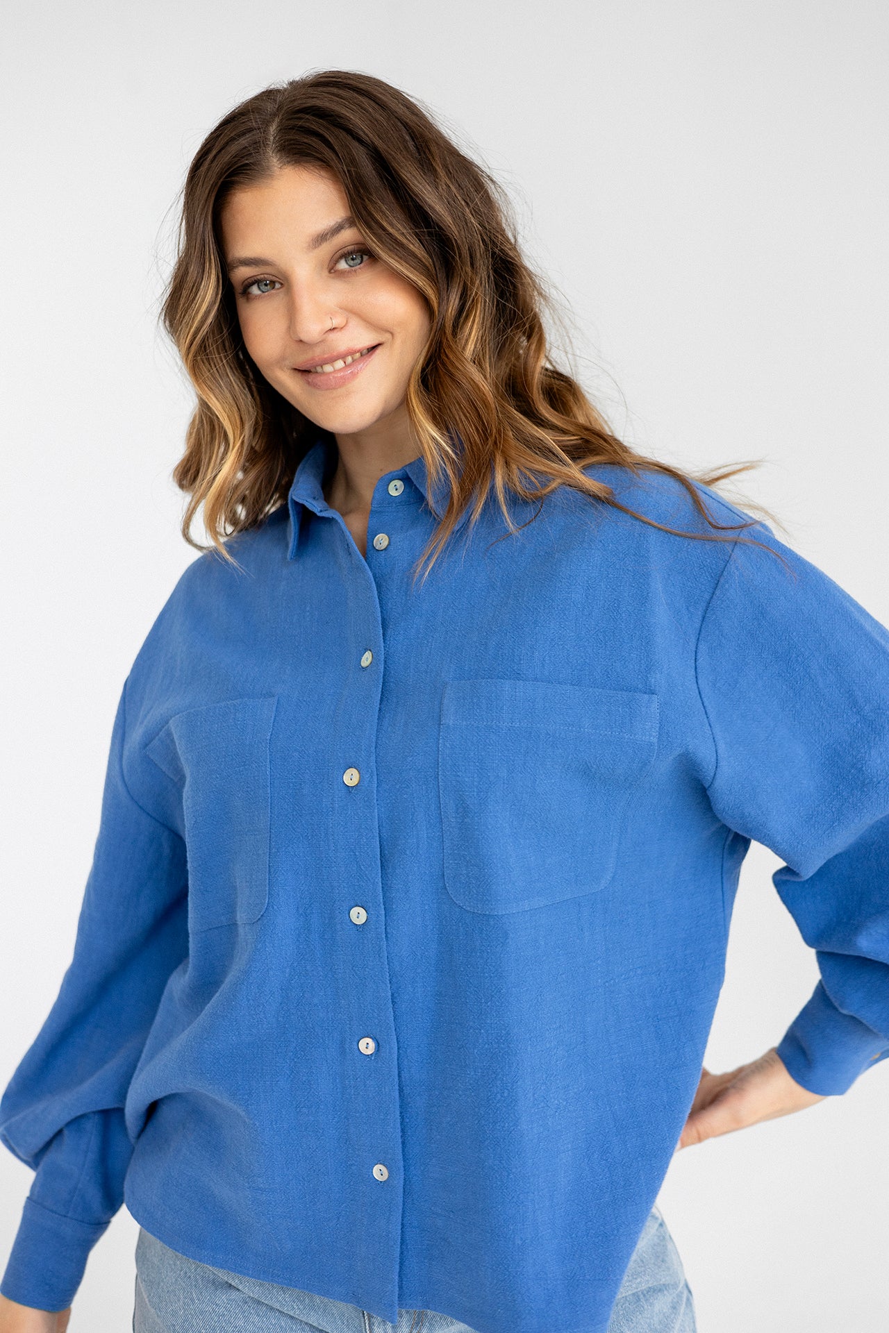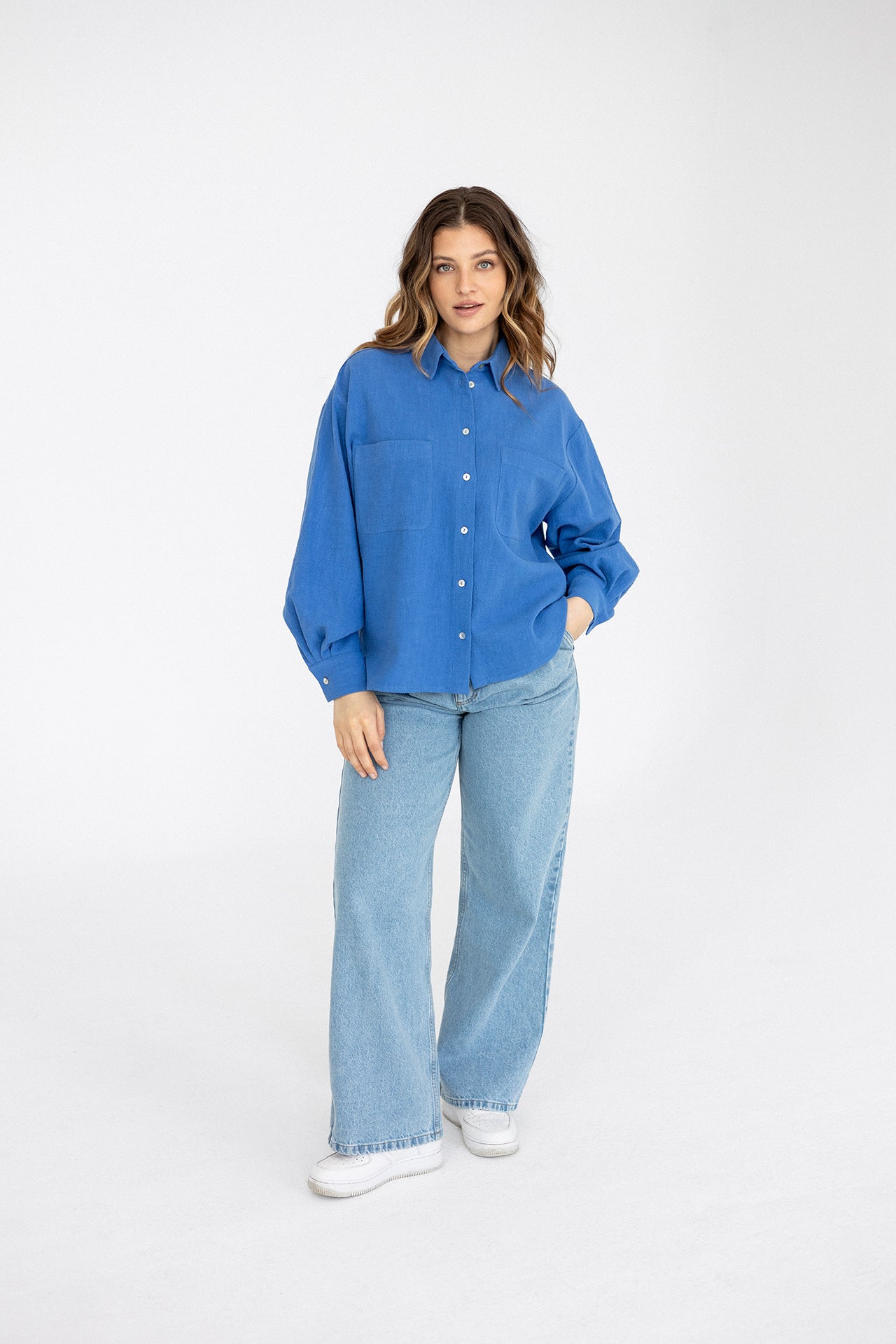 It has a timeless, slightly oversized, boxy cut, which, combined with muslin cotton, creates the perfect combination of casualness and femininity, definitely not only for summer. However, we had to spice up the classics. Nonchalantly widened, shorter sleeves with delicate cuffs and an asymmetric hem add character to it.