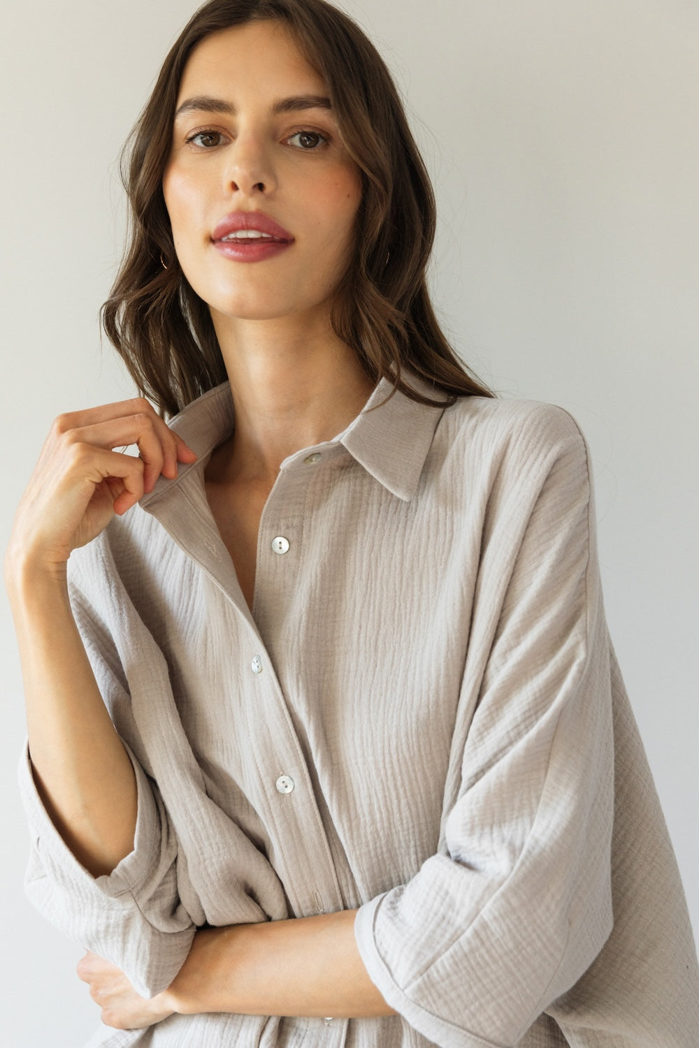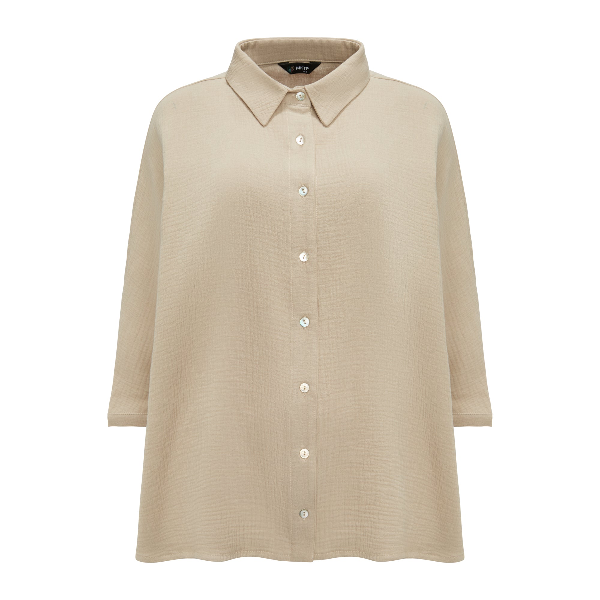 It has a timeless, slightly oversized, boxy cut, which, combined with muslin cotton, creates the perfect combination of casualness and femininity, definitely not only for summer. However, we had to spice up the classics. Nonchalantly widened, shorter sleeves with delicate cuffs and an asymmetric hem add character to it.