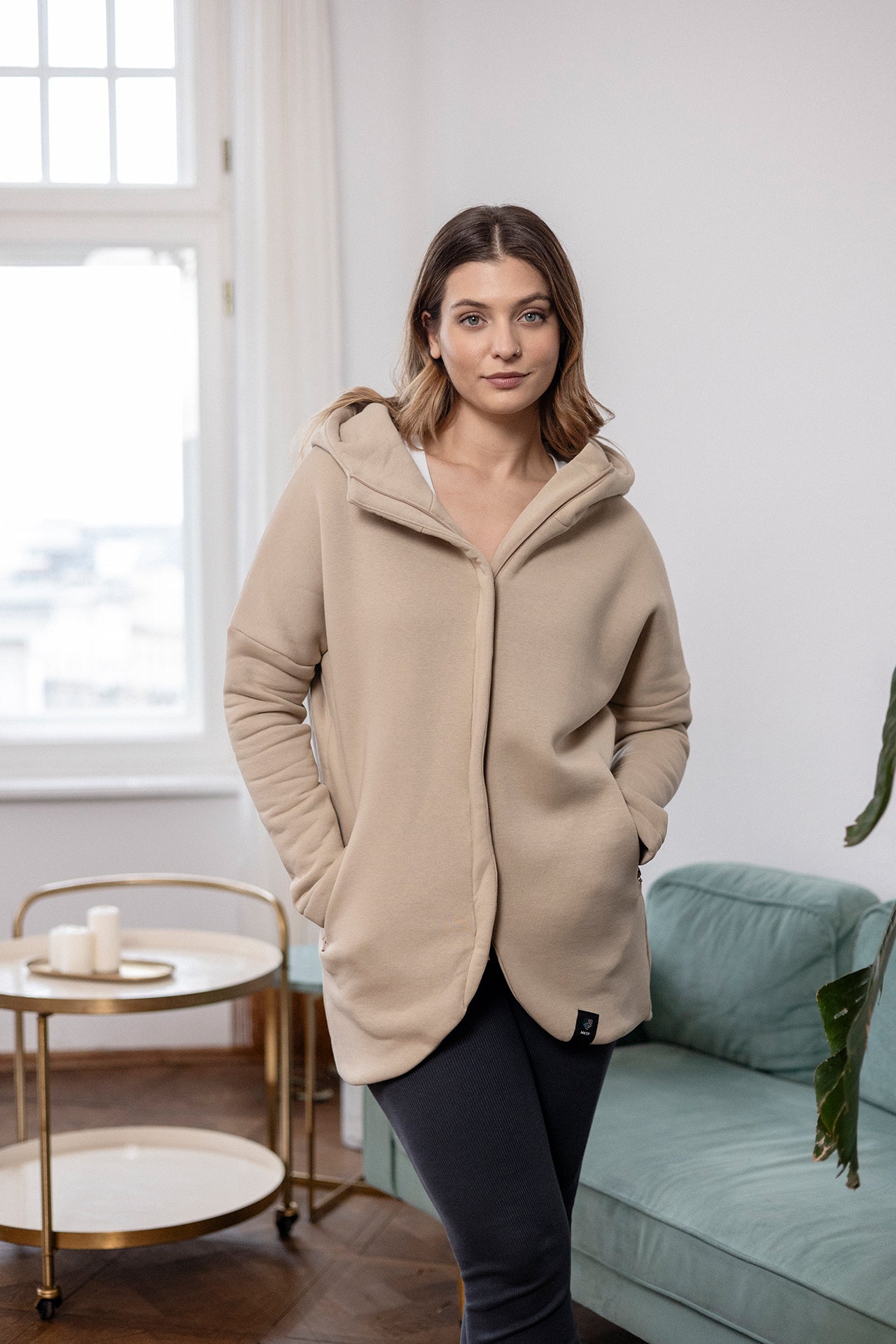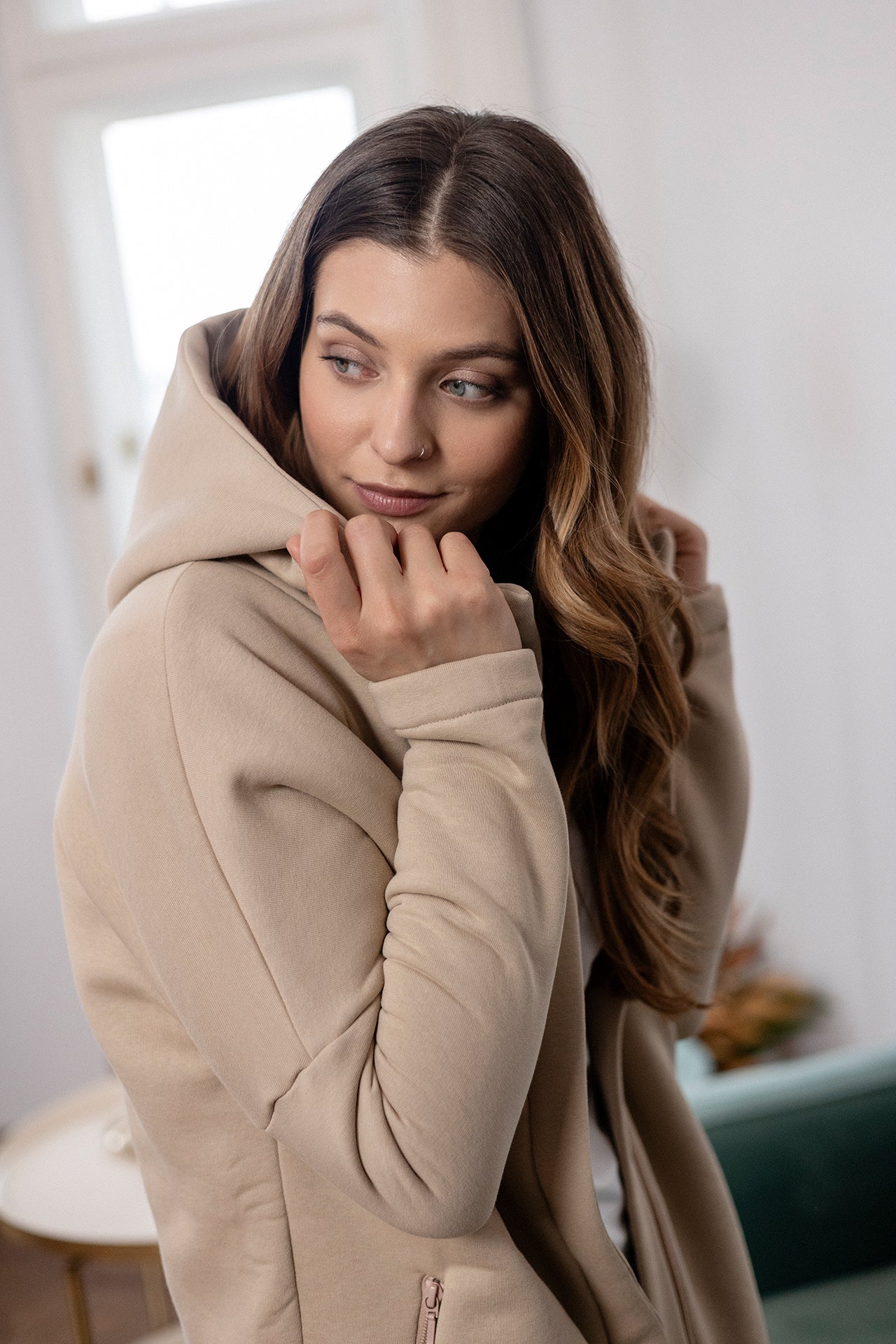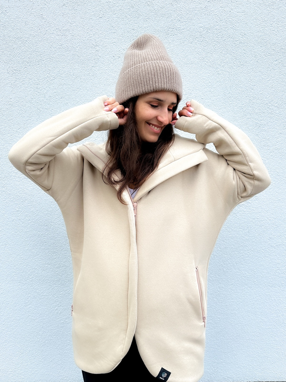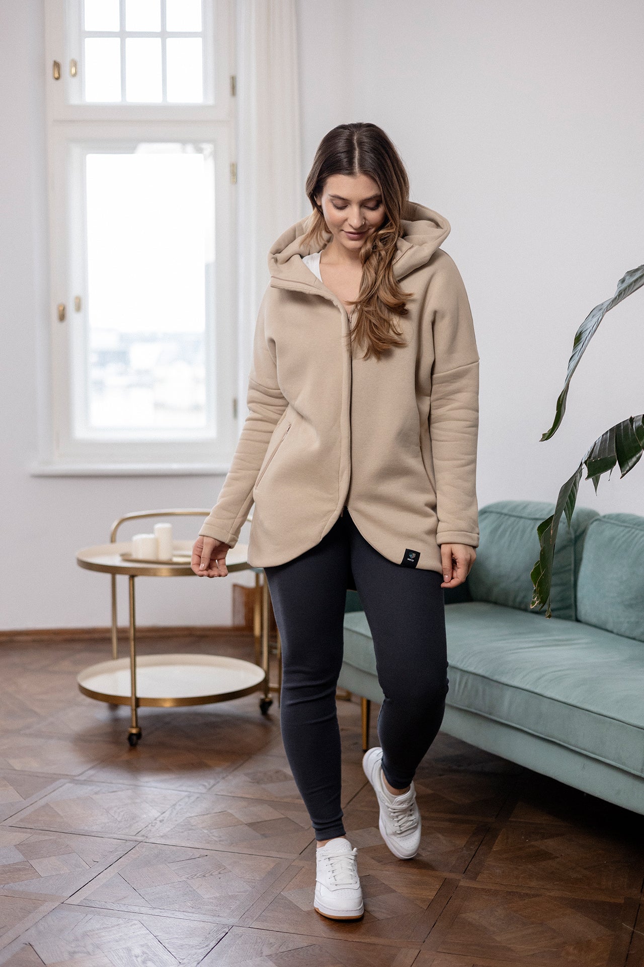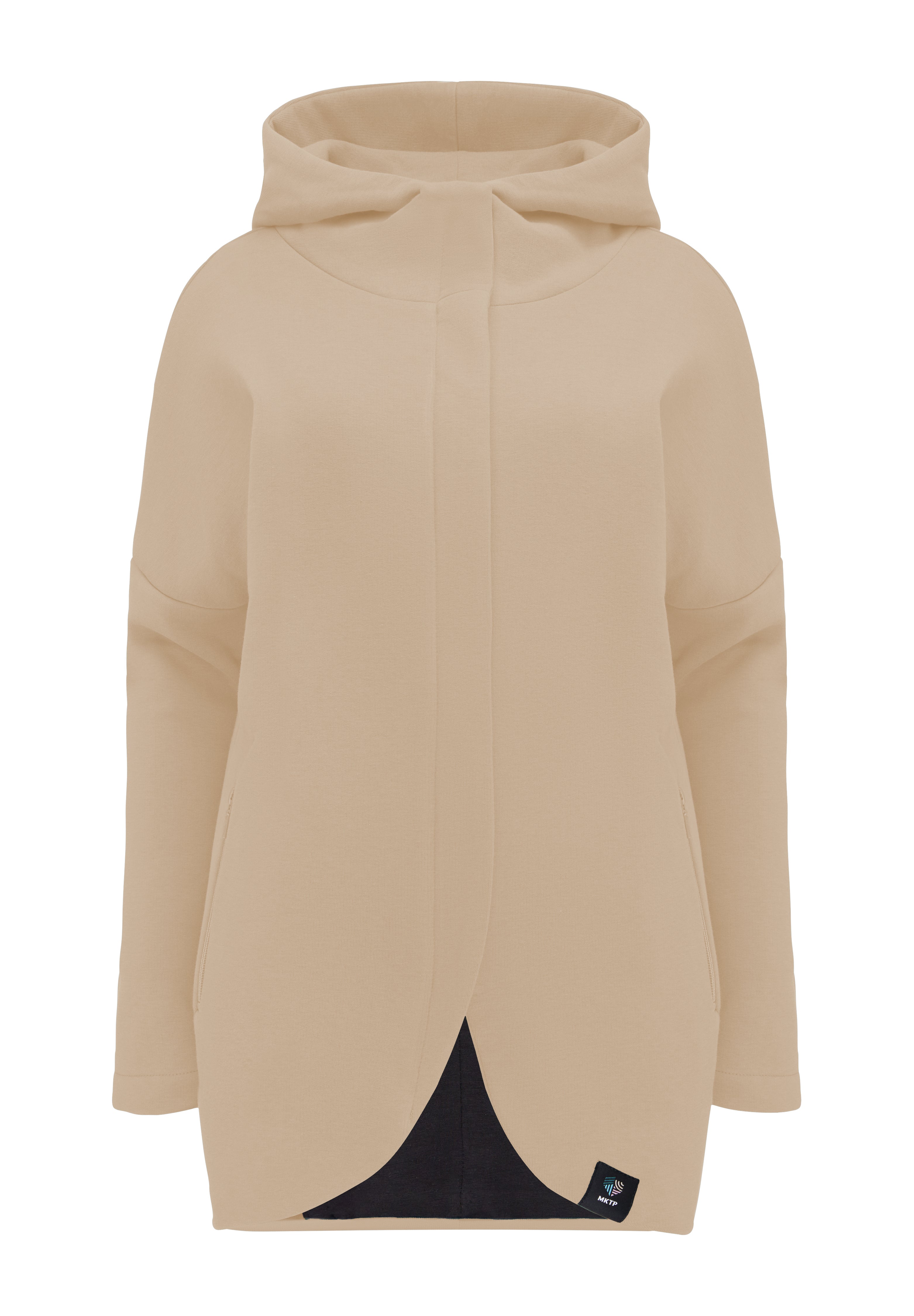 This cut is not just visually attractive, it’s also functional. The hoodie has a large hood, deep zipped pockets, a longer back, and a lining.