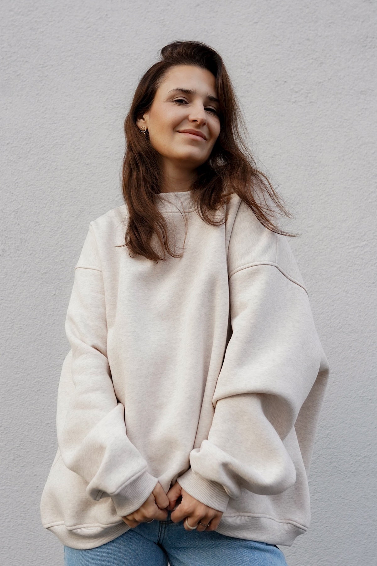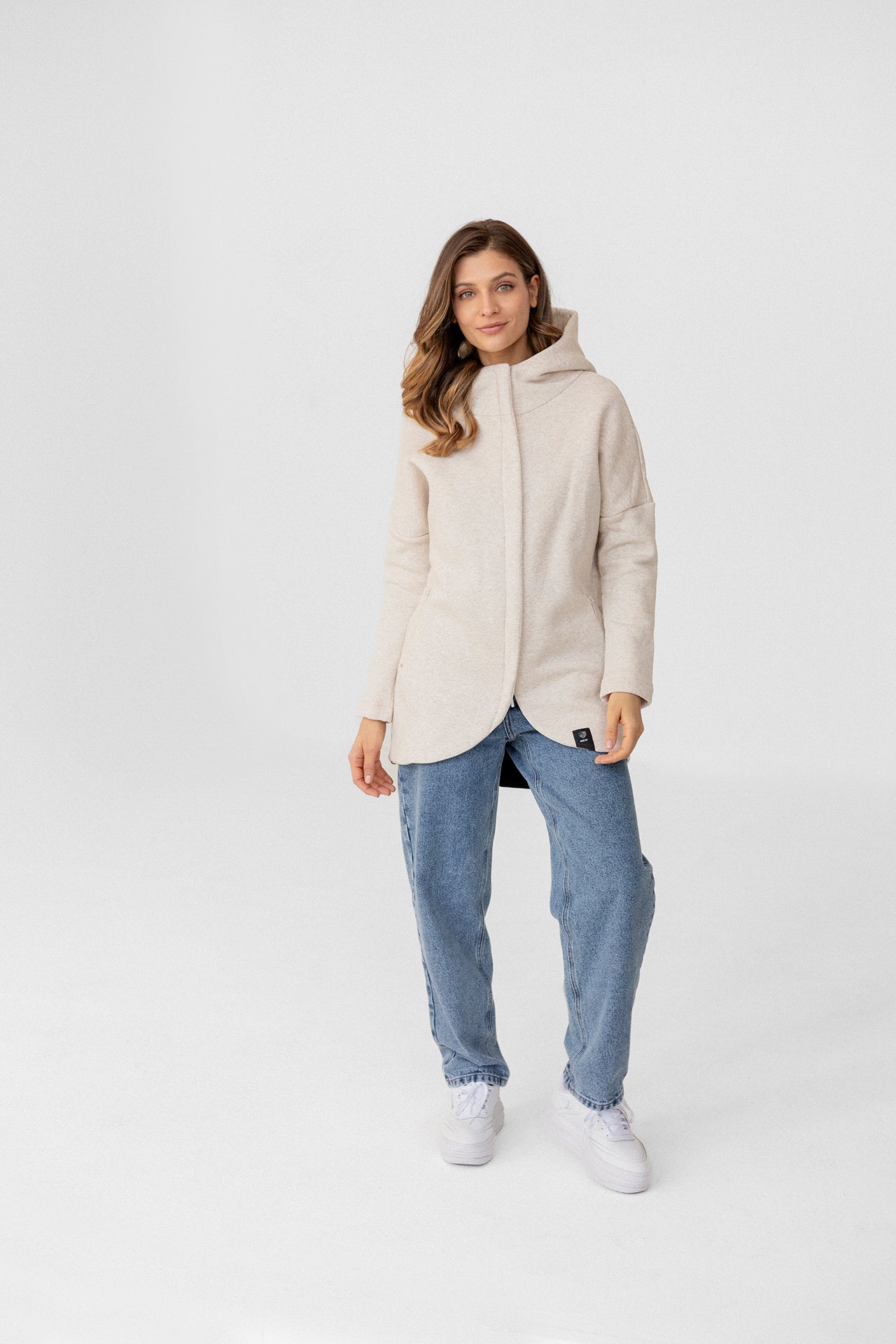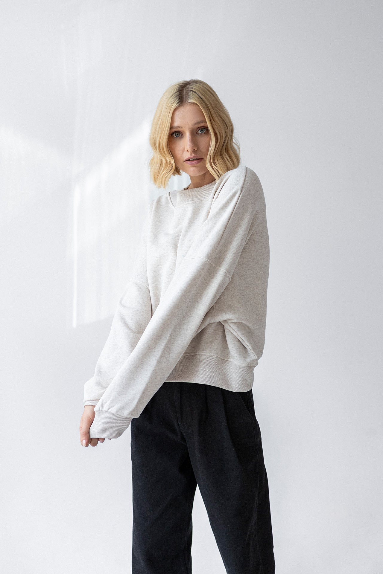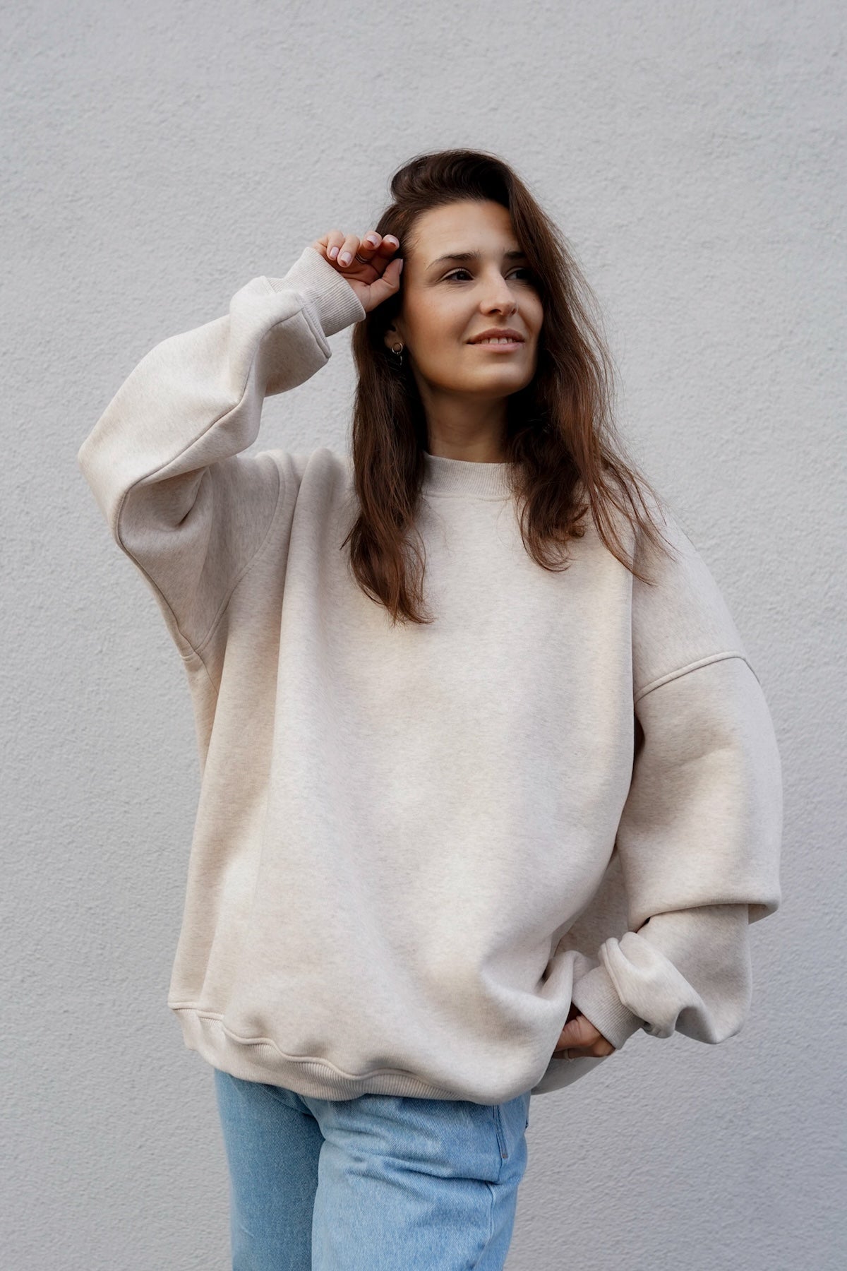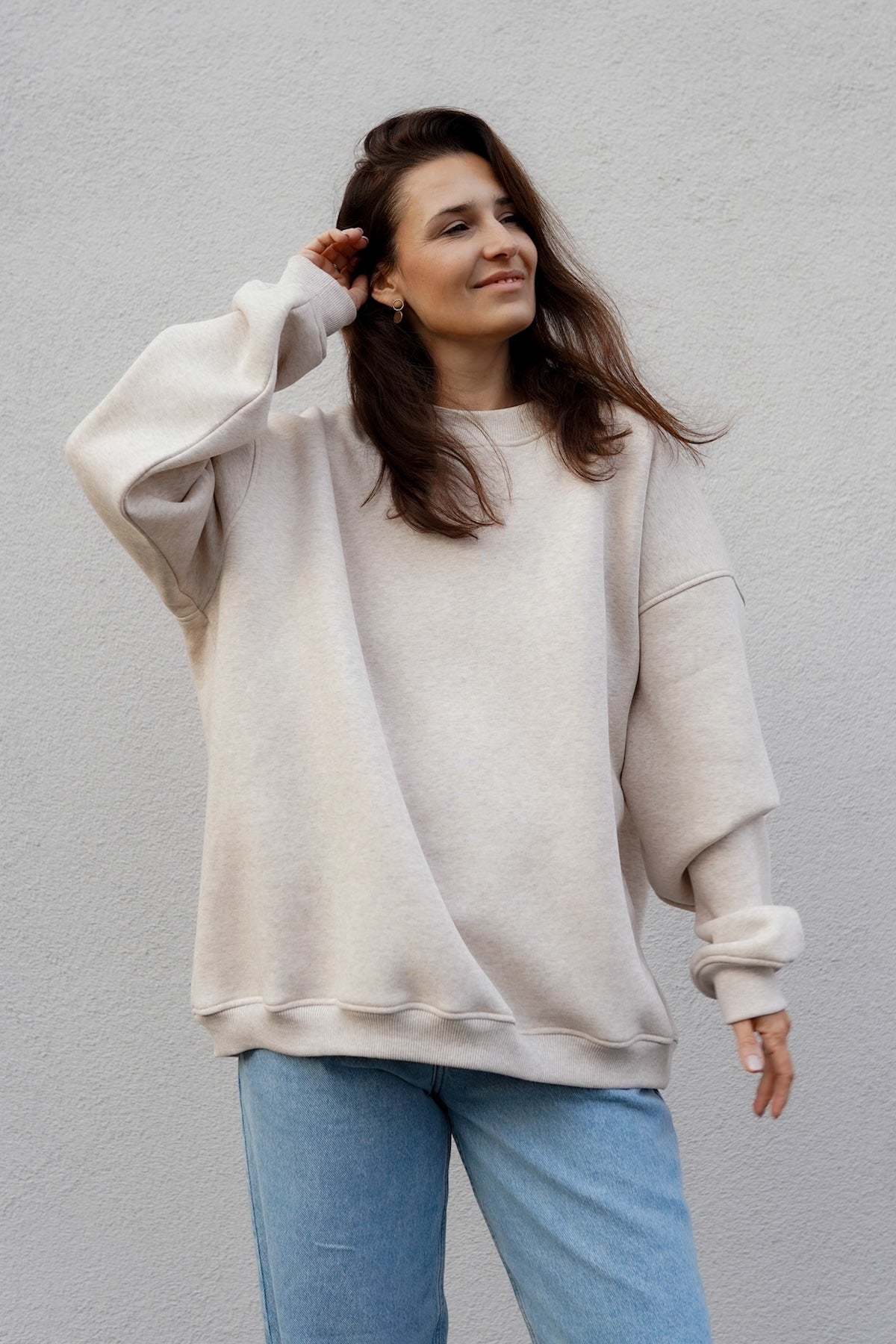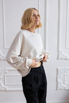 It is distinguished by its lowered shoulder line and wider, puffy sleeves, which literally add style and immediately attract attention. Additionally, a loose, oversized and slightly nonchalant cut, although shorter because it reaches just to the hips. The bottom is finished with a wider cuff, which also enhances the sleeves and neckline. Effect? Comfort has not looked so feminine and original for a long time.