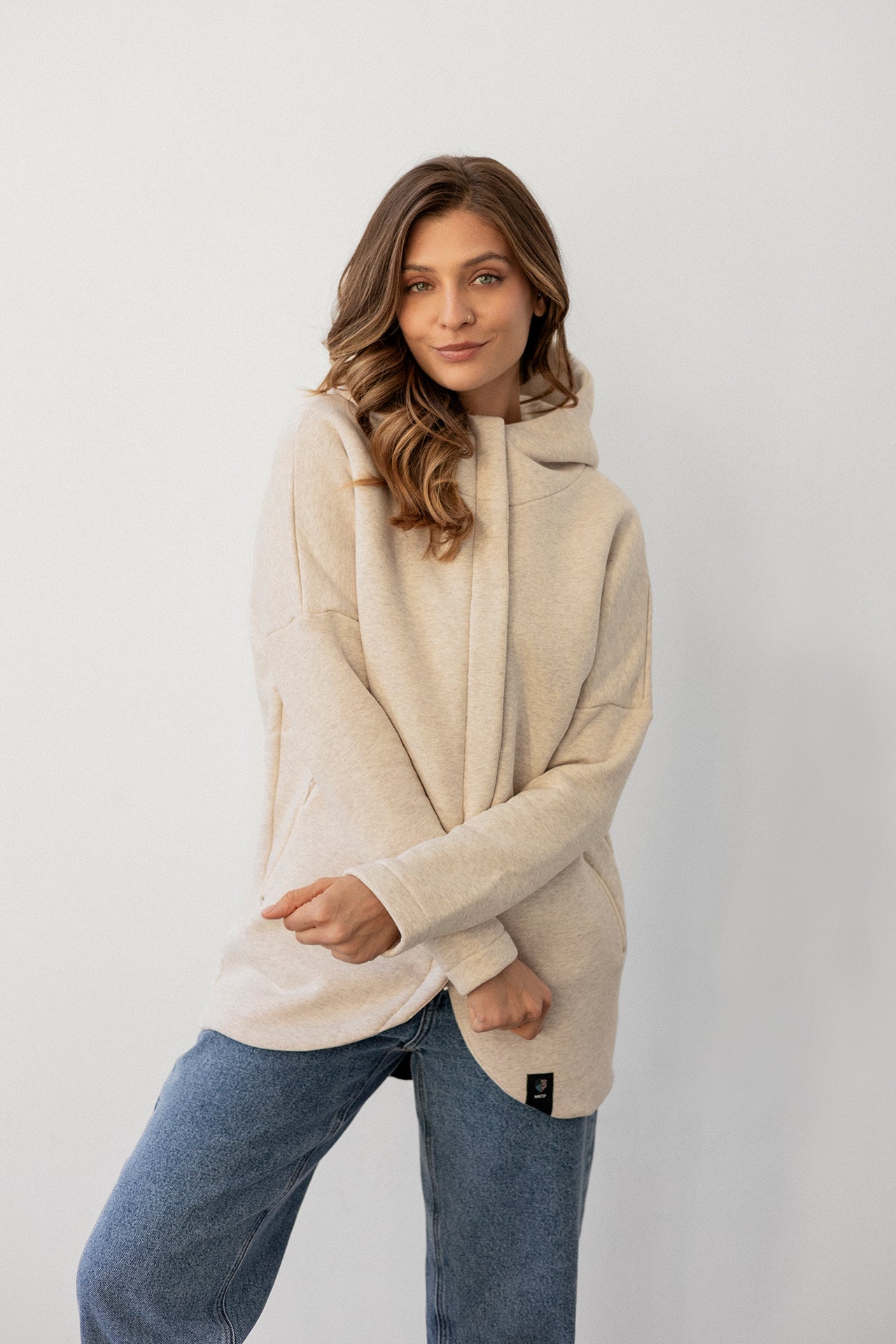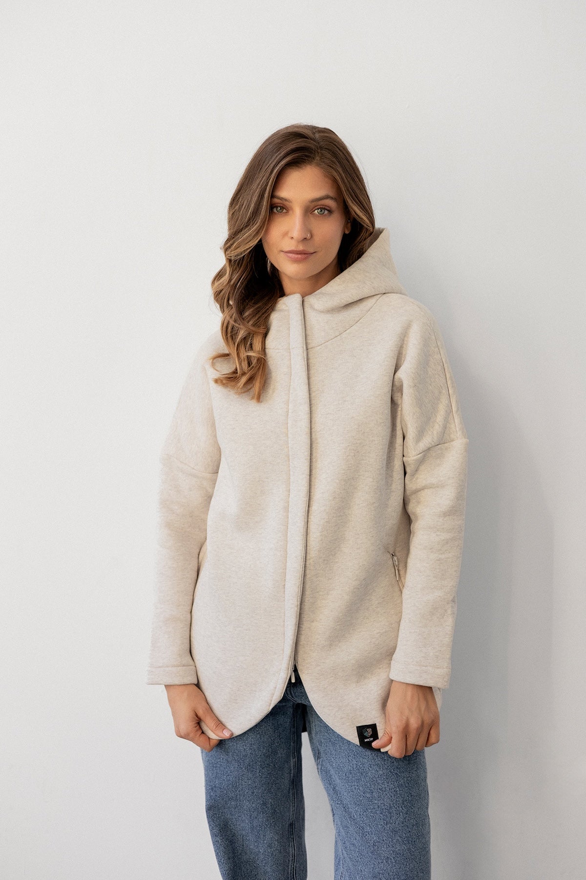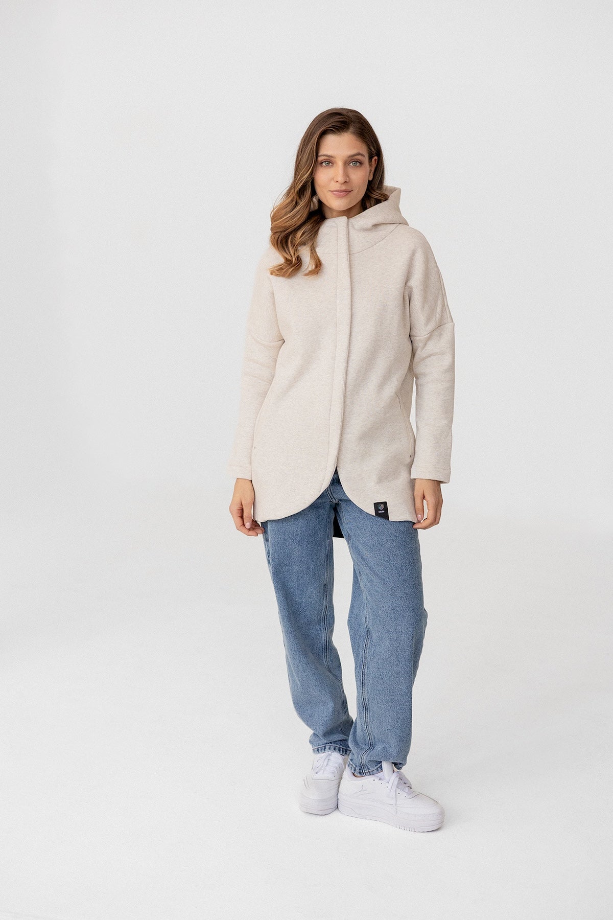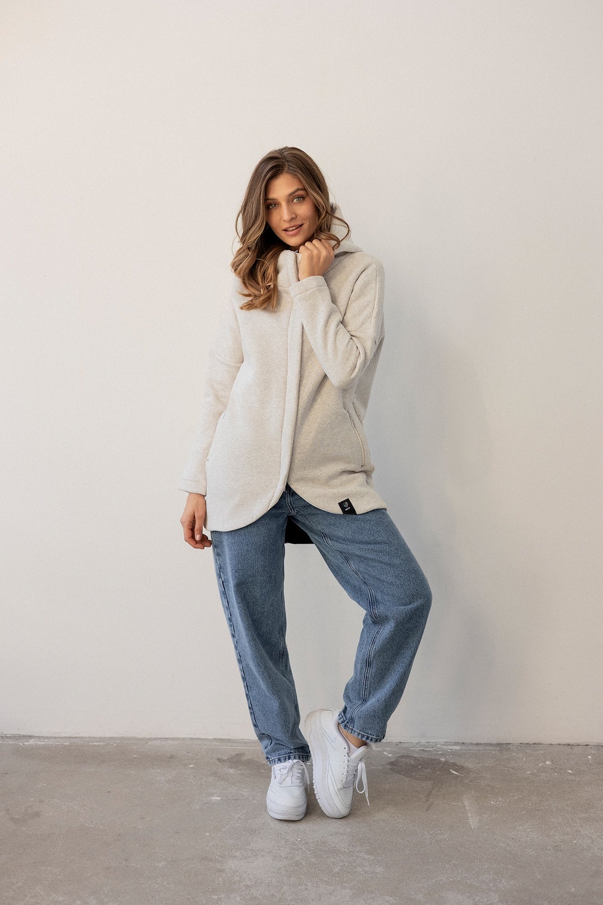 It is distinguished by its lowered shoulder line and wider, puffy sleeves, which literally add style and immediately attract attention. Additionally, a loose, oversized and slightly nonchalant cut, although shorter because it reaches just to the hips. The bottom is finished with a wider cuff, which also enhances the sleeves and neckline. Effect? Comfort has not looked so feminine and original for a long time.