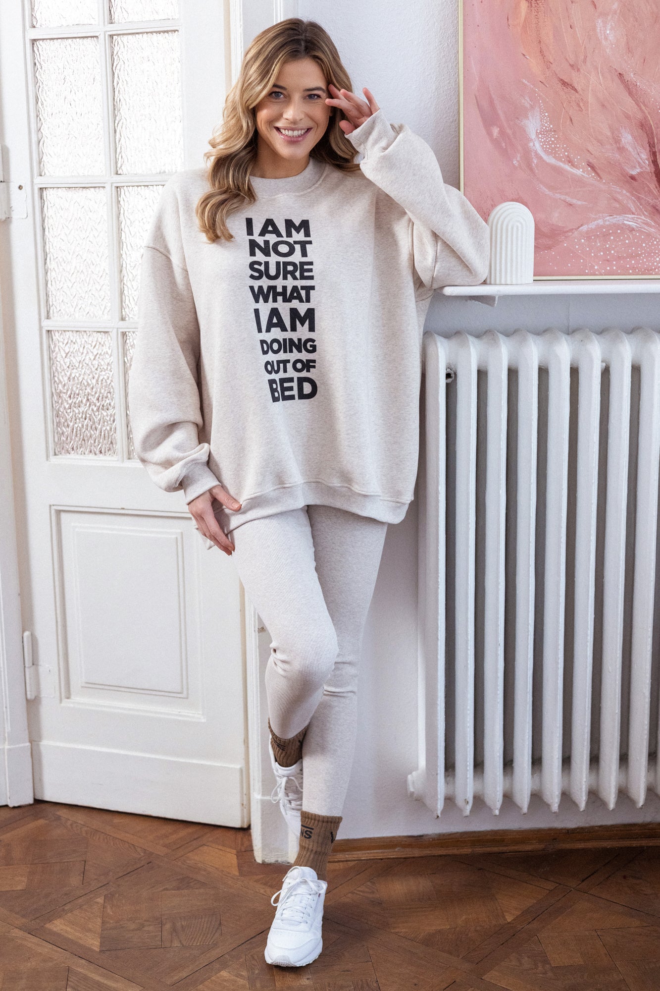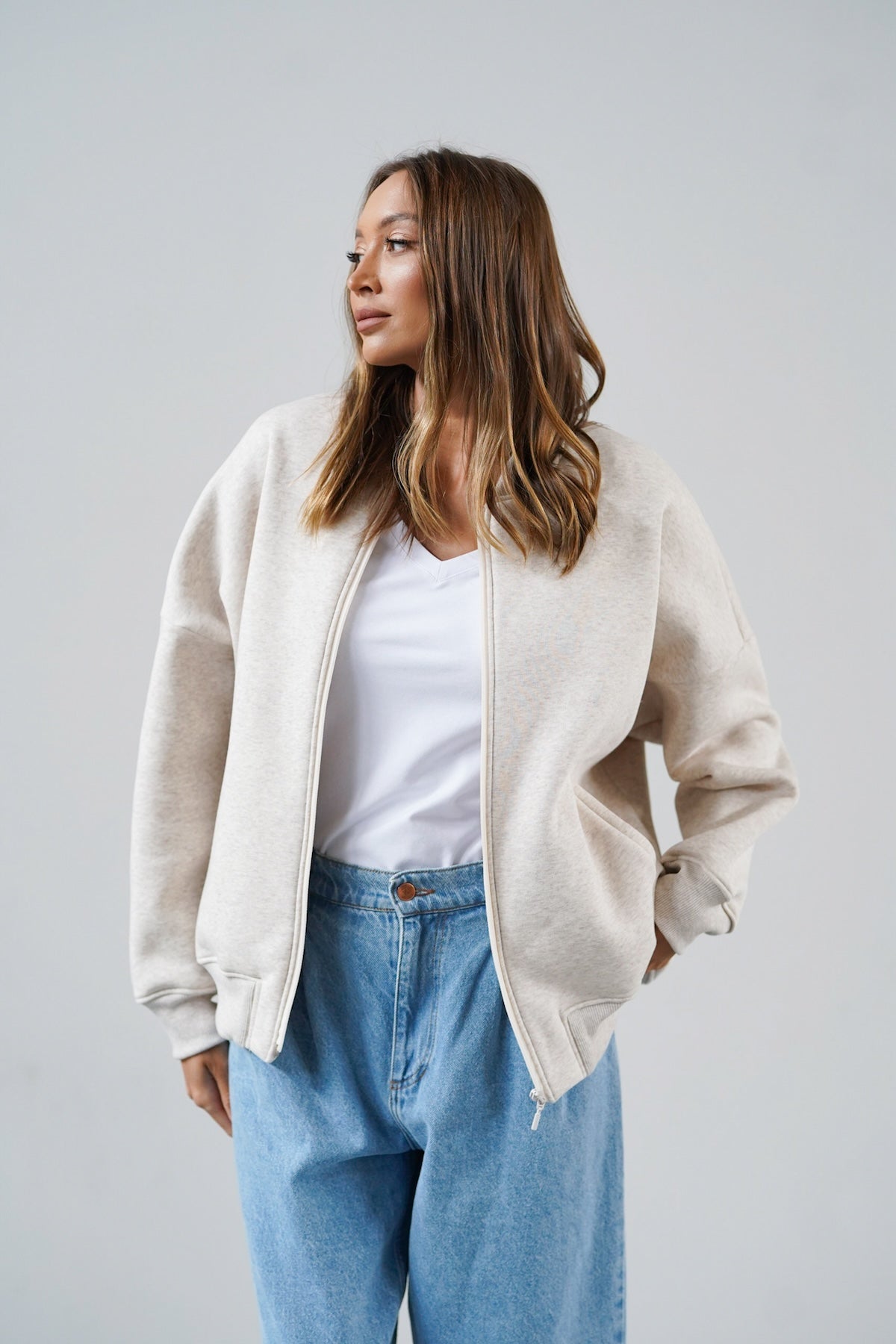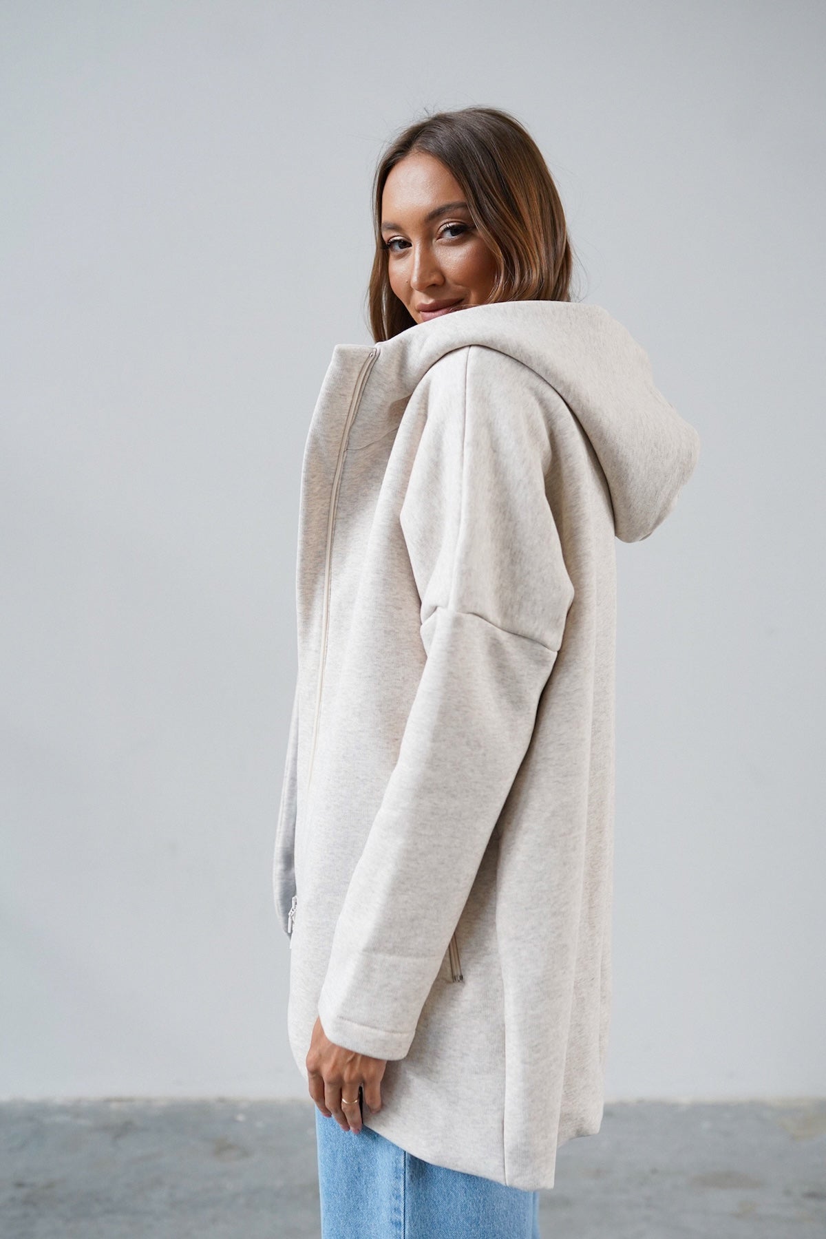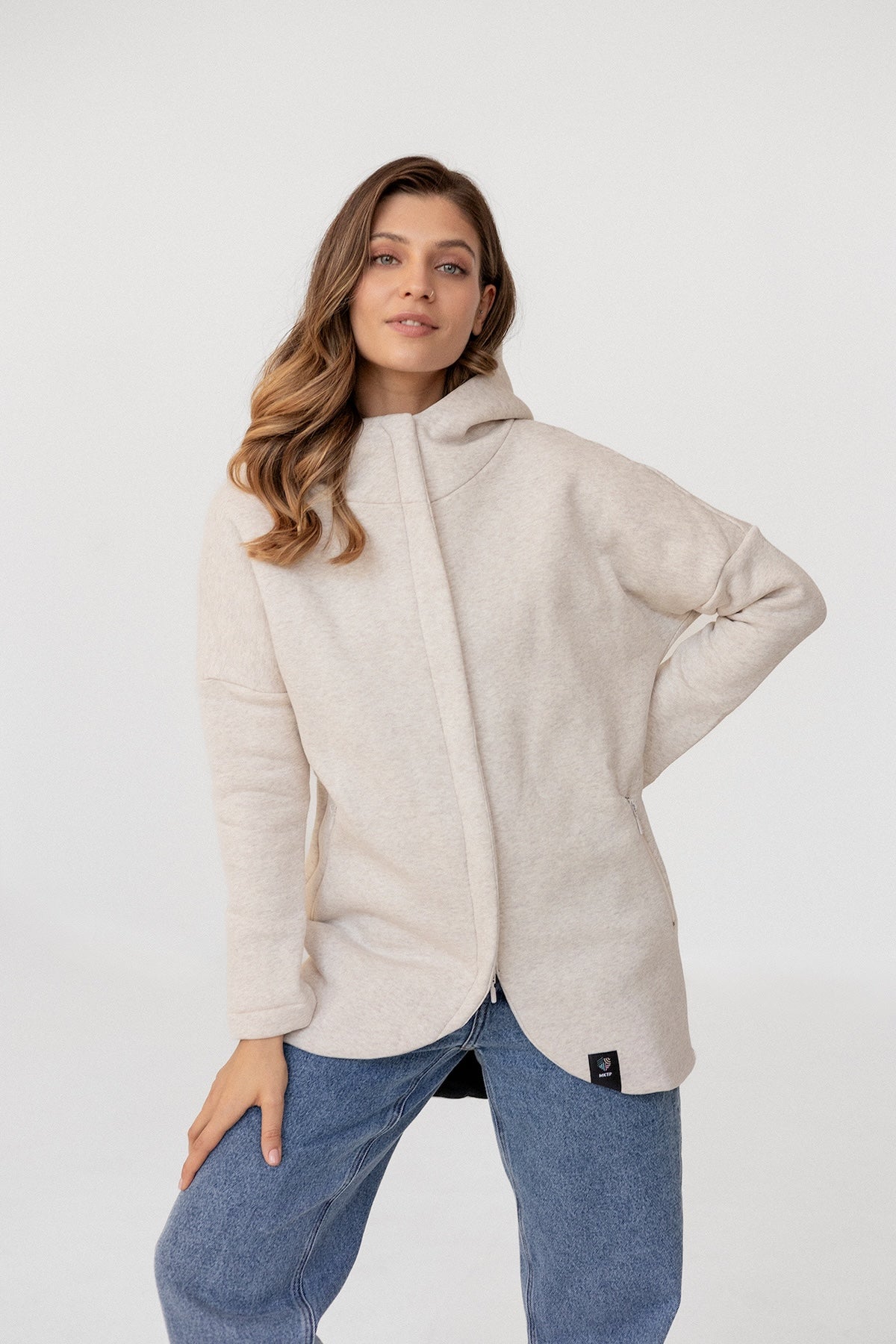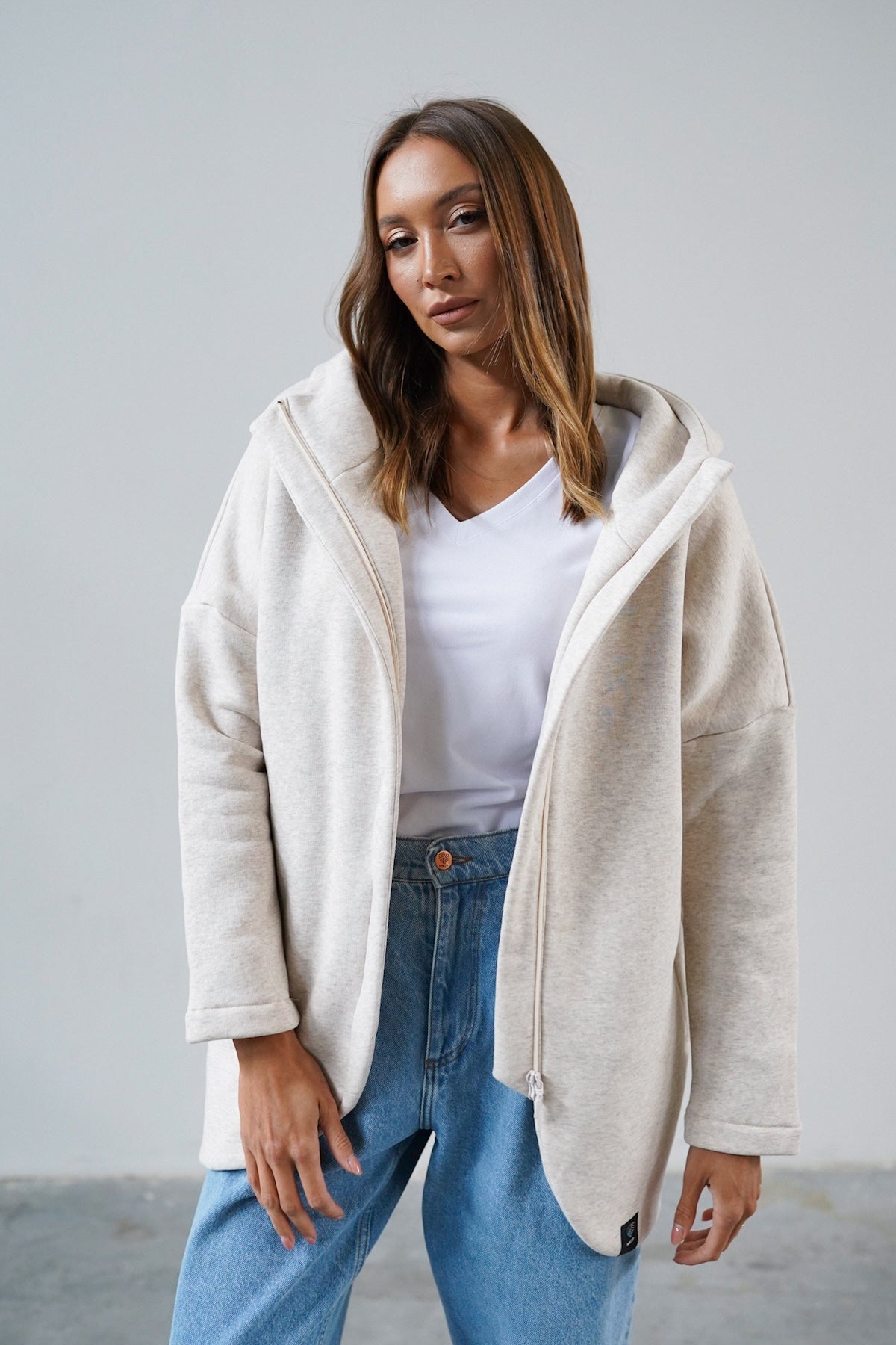 It is distinguished by its lowered shoulder line and wider, puffy sleeves, which literally add style and immediately attract attention. Additionally, a loose, oversized and slightly nonchalant cut, although shorter because it reaches just to the hips. The bottom is finished with a wider cuff, which also enhances the sleeves and neckline. Effect? Comfort has not looked so feminine and original for a long time.