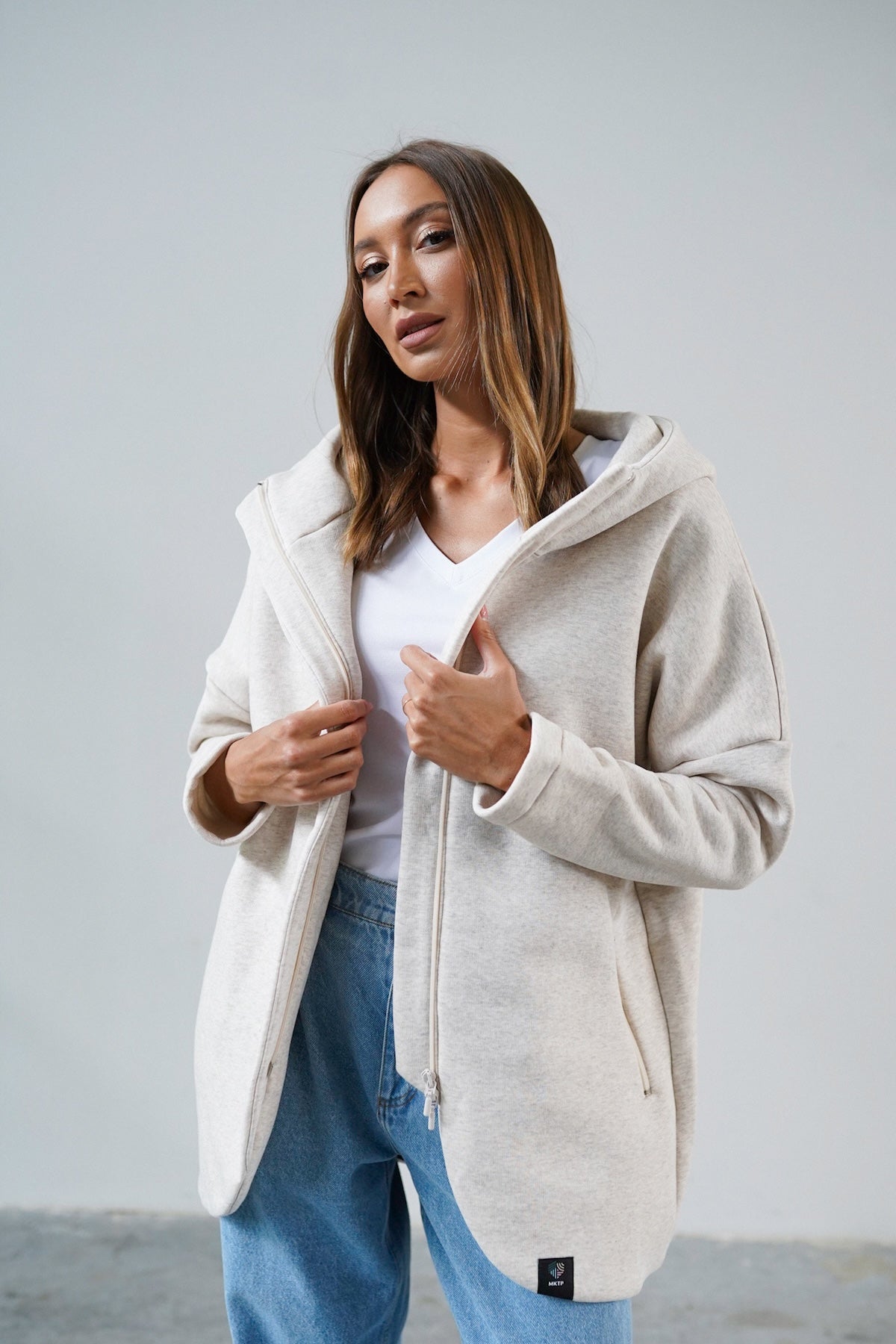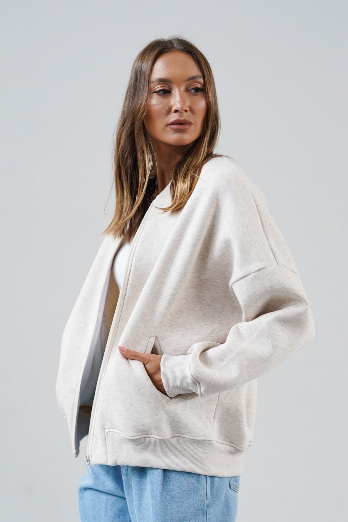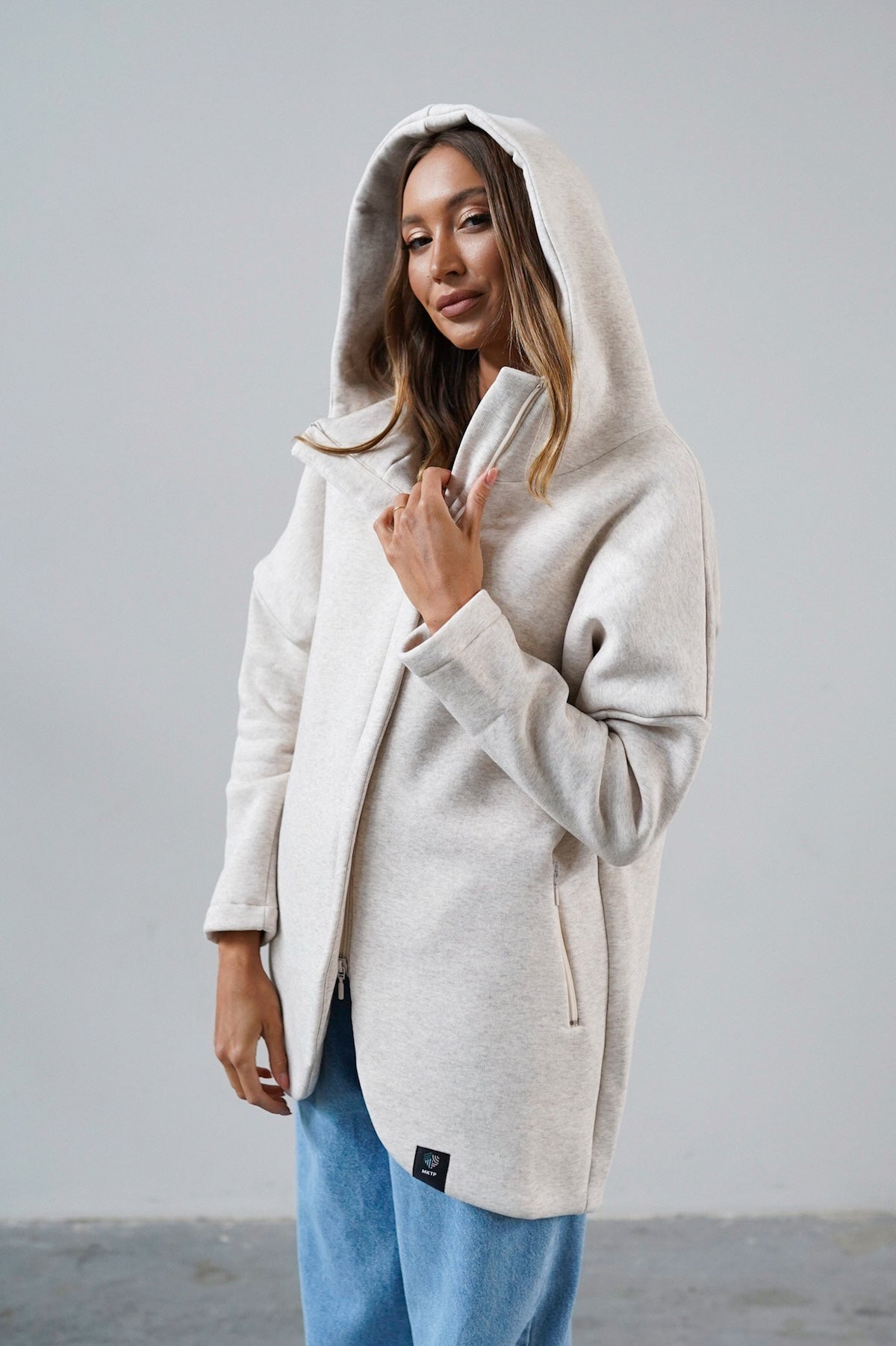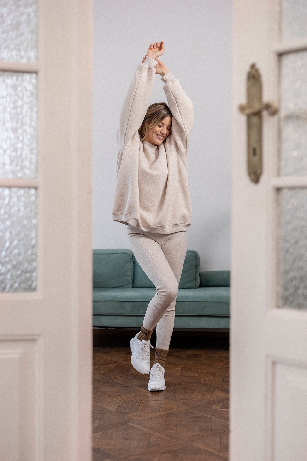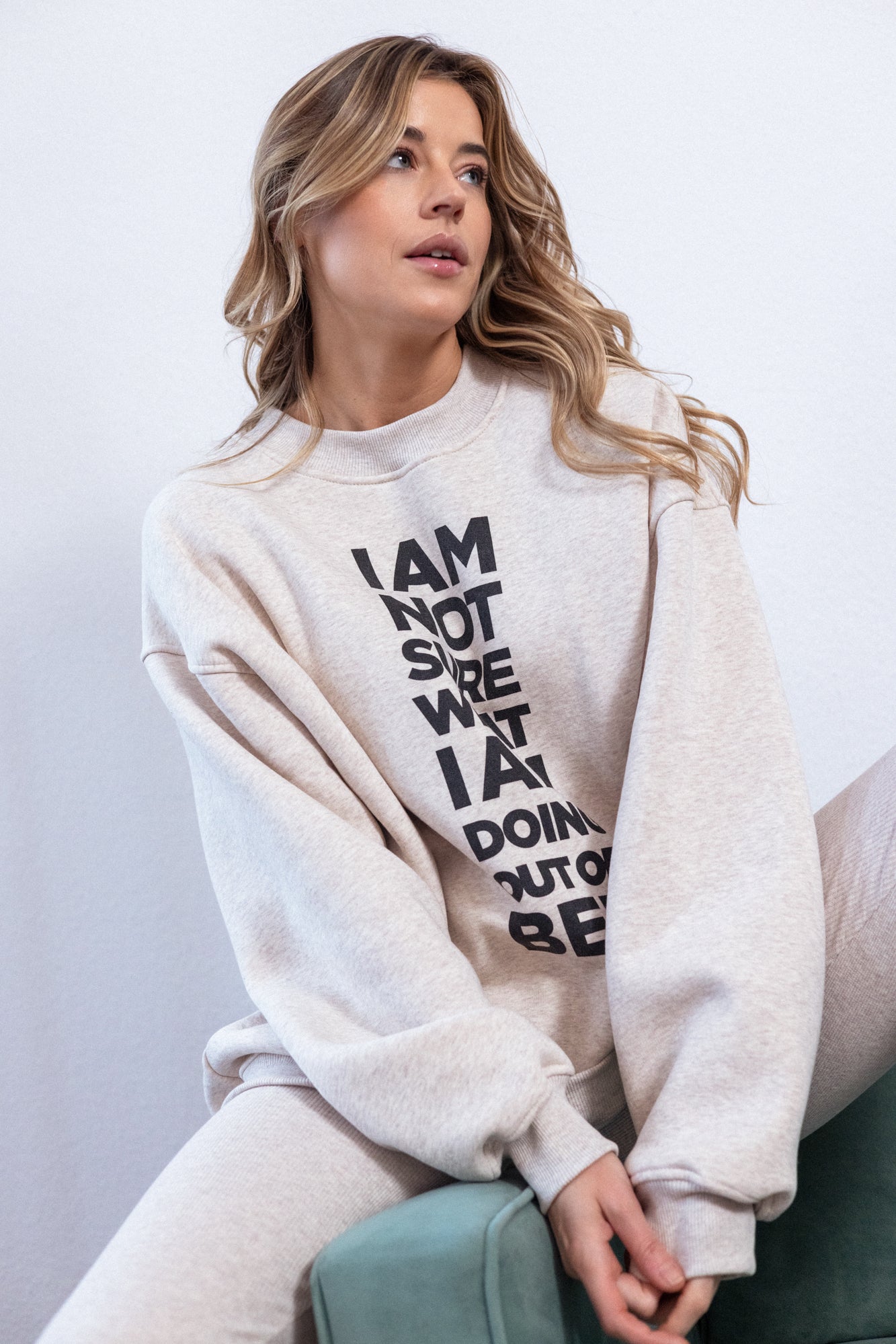It is distinguished by its lowered shoulder line and wider, puffy sleeves, which literally add style and immediately attract attention. Additionally, a loose, oversized and slightly nonchalant cut, although shorter because it reaches just to the hips. The bottom is finished with a wider cuff, which also enhances the sleeves and neckline. Effect? Comfort has not looked so feminine and original for a long time.