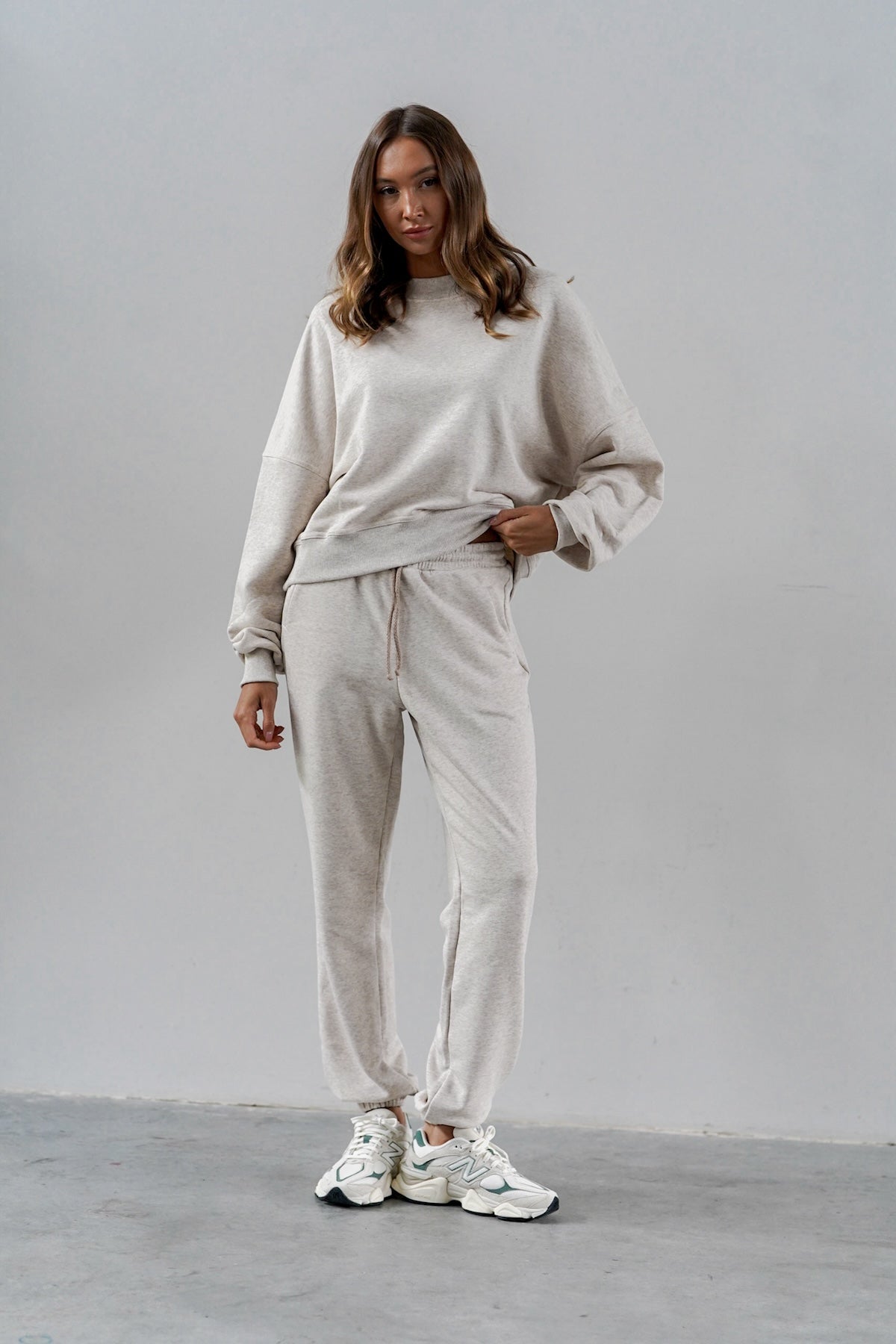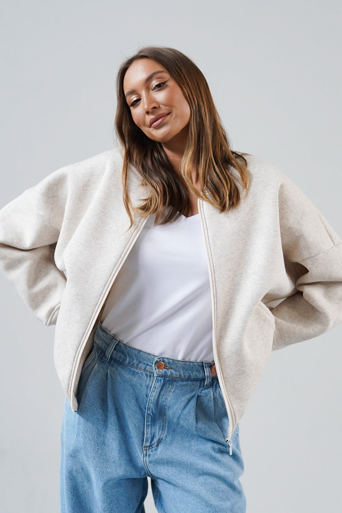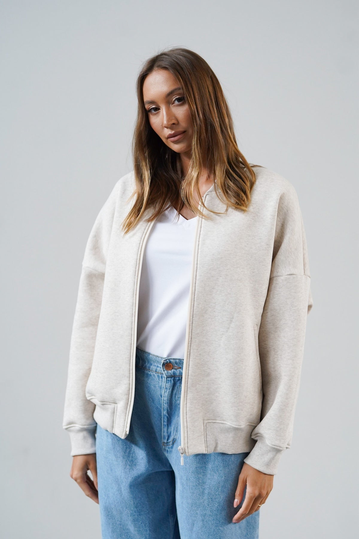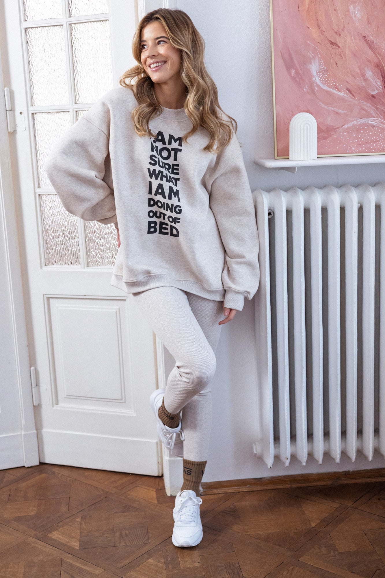 It is distinguished by its lowered shoulder line and wider, puffy sleeves, which literally add style and immediately attract attention. Additionally, a loose, oversized and slightly nonchalant cut, although shorter because it reaches just to the hips. The bottom is finished with a wider cuff, which also enhances the sleeves and neckline. Effect? Comfort has not looked so feminine and original for a long time.