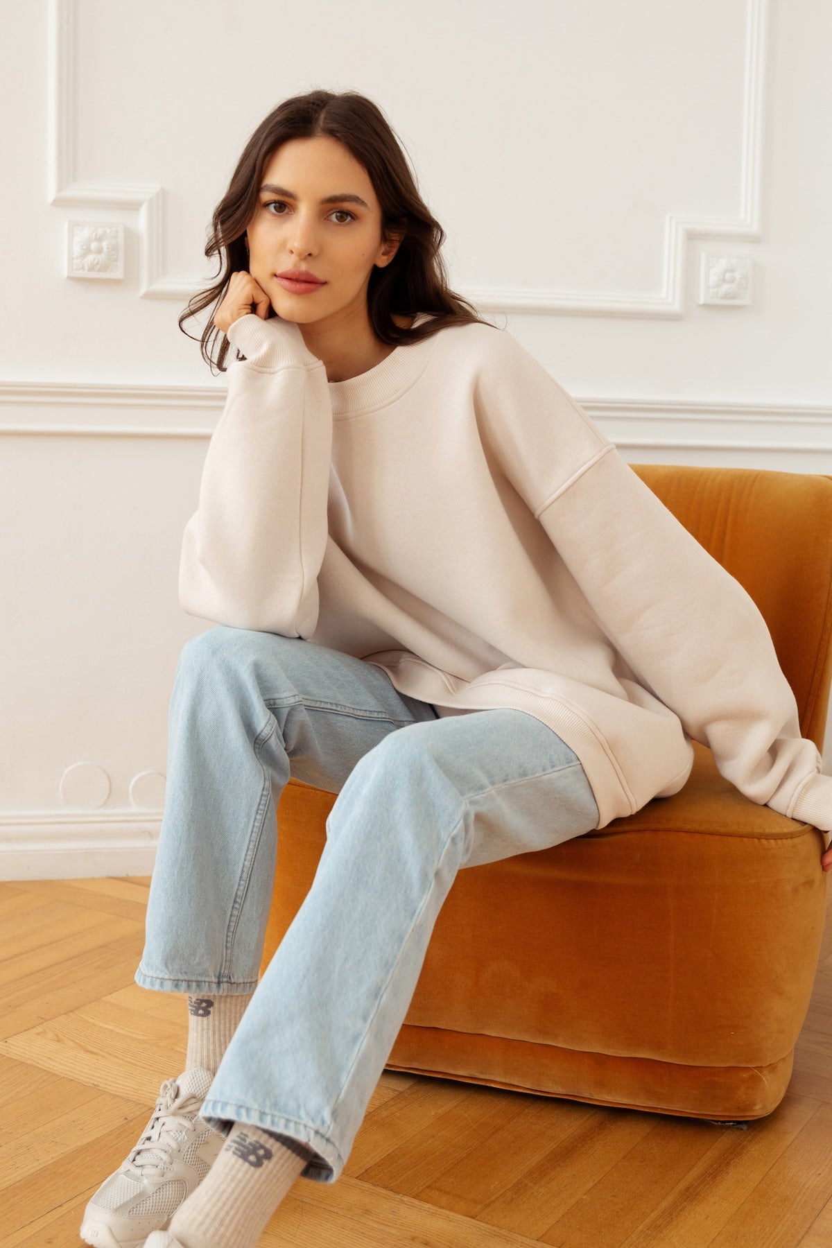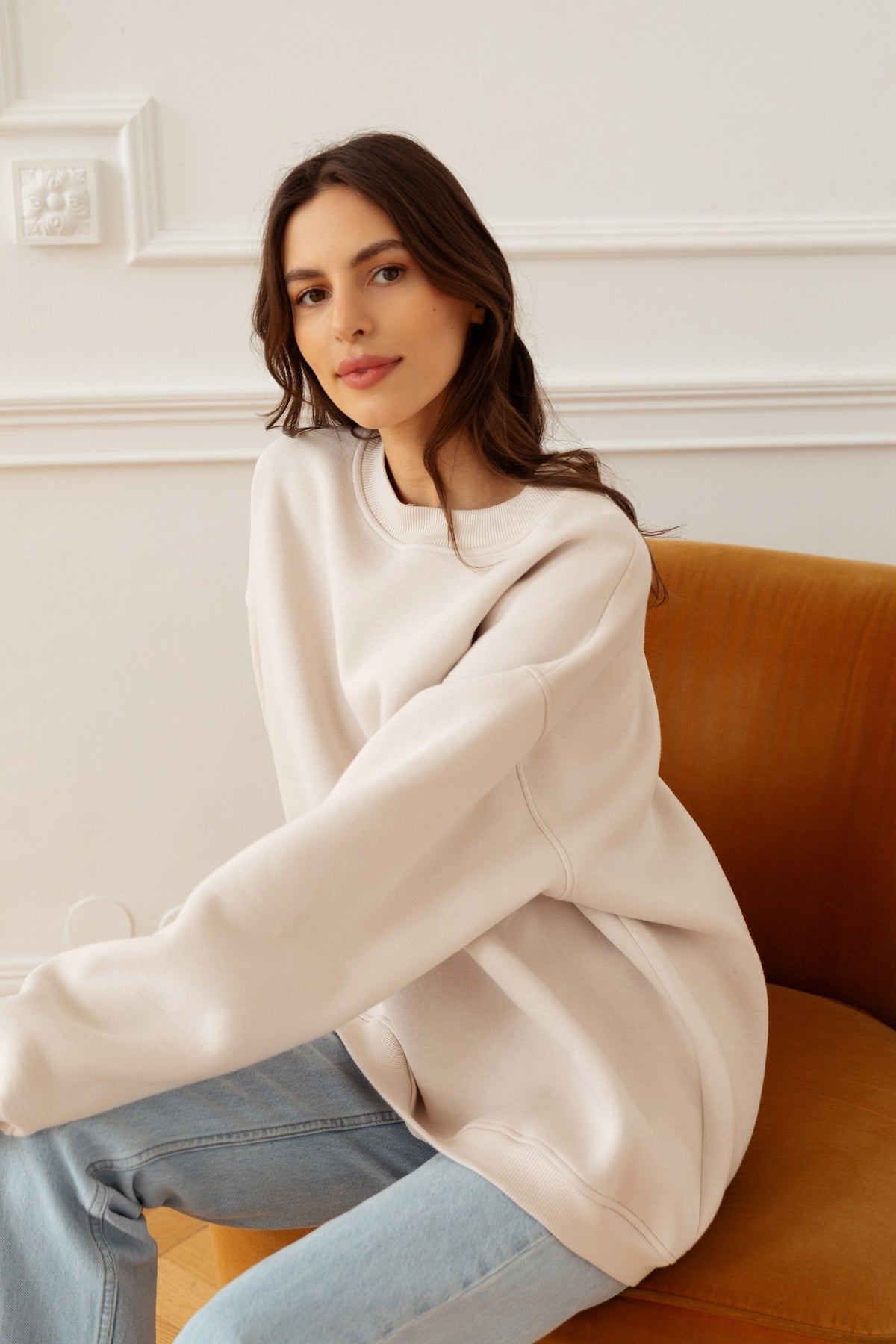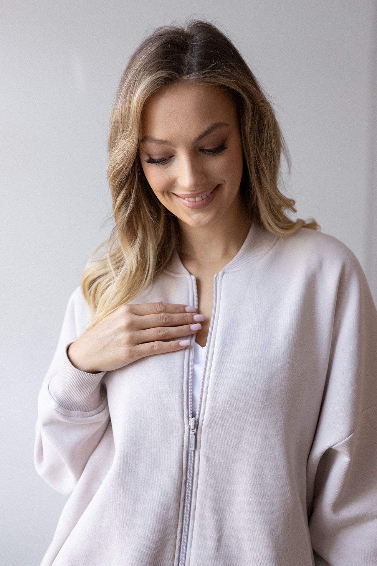 A word of advice: our sweatshirt coat is oversized, so it’s best to choose one size smaller than usual. So if you’re an M size, go for an S, and if you’re an S size, opt for an XS.