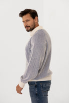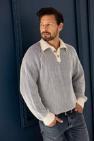 Sweter o charakterze klasycznego, ale odpowiednio podrasowanego polo w cieplejszej, całorocznej odsłonie. Od razu przyciąga uwagę wyraźnym splotem w dwóch odcieniach, tworzących wyjątkową i odpowiednio nasyconą kolorem kompozycję.
