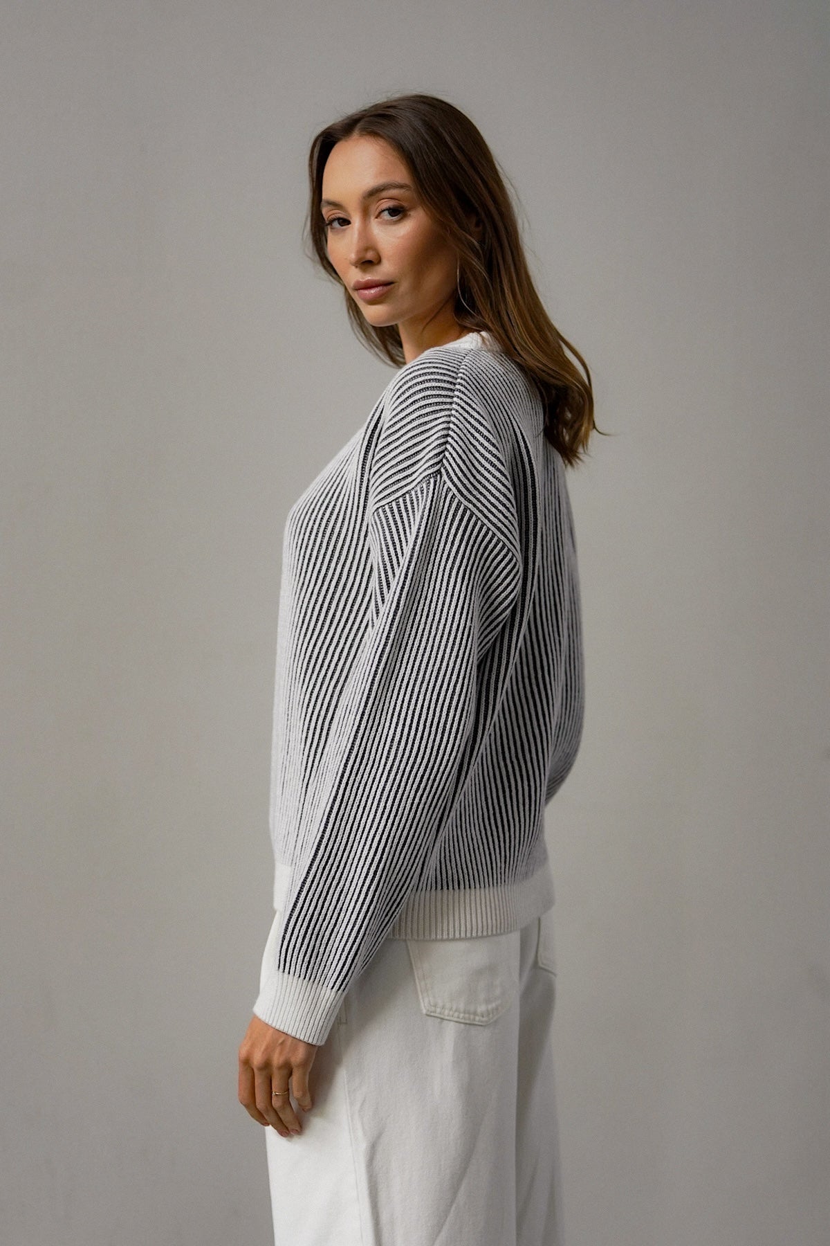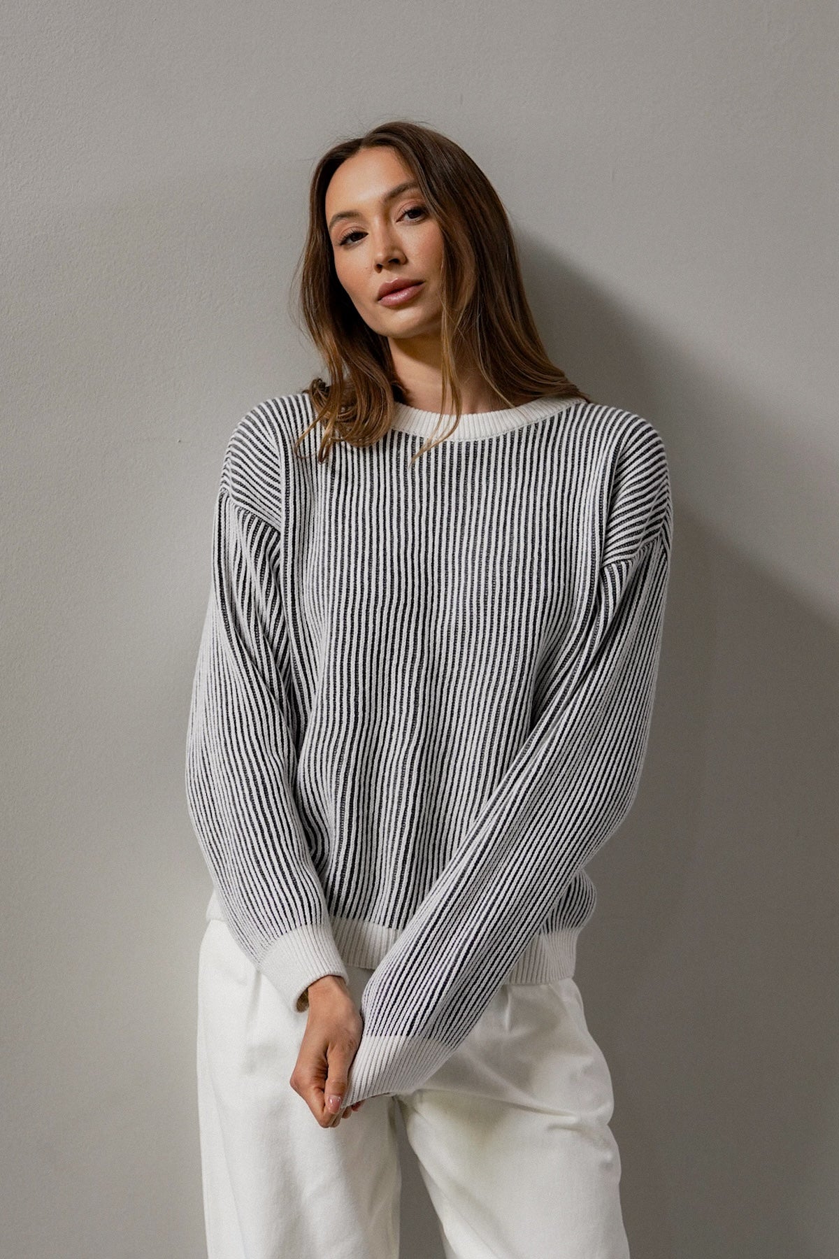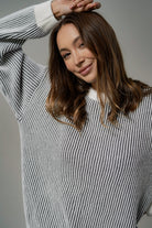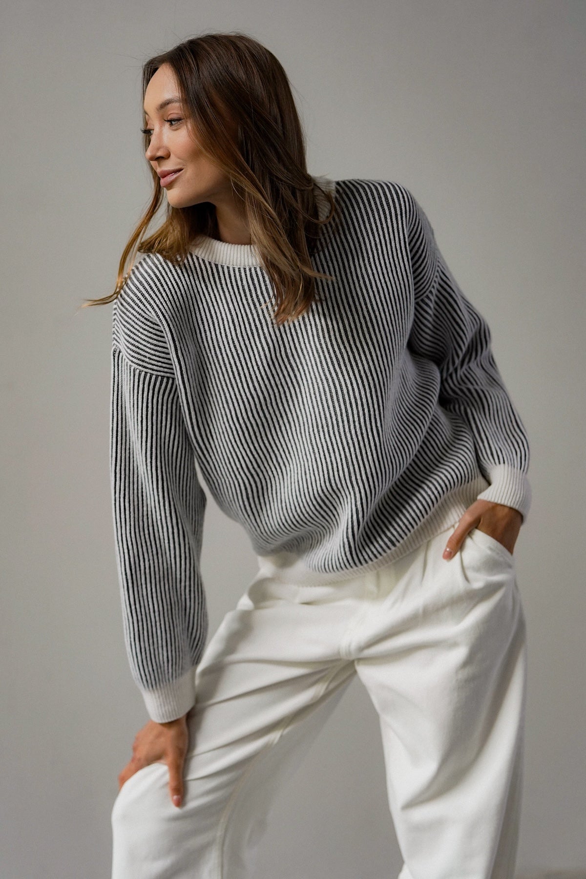The cut is versatile, yet original. It has a simple, slightly loose form that sits comfortably on the figure - without being too tight, but still with a sense of proportion. The use of contrasting cuffs and a subtle accent at the neckline gives the sweater a distinctive but unobtrusive detail. Because little things make a difference. The sleeves are slightly lowered, which adds even more casualness and lightness.