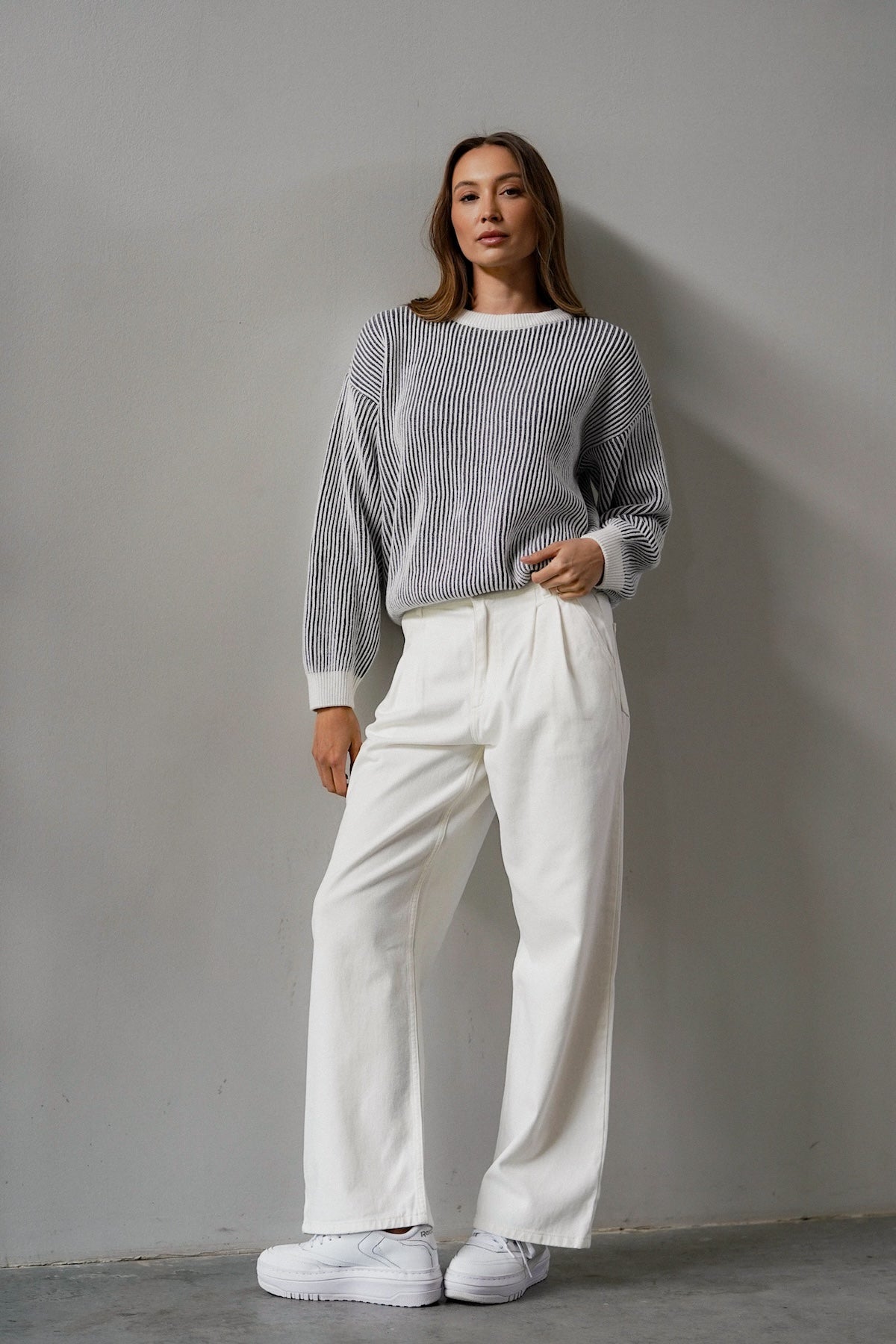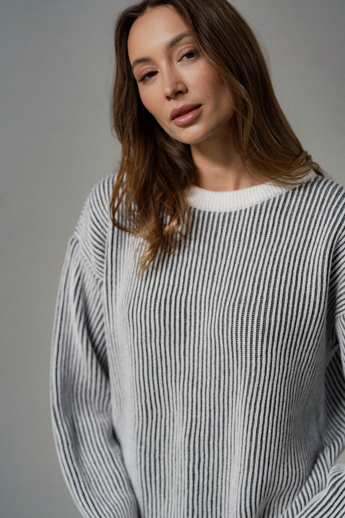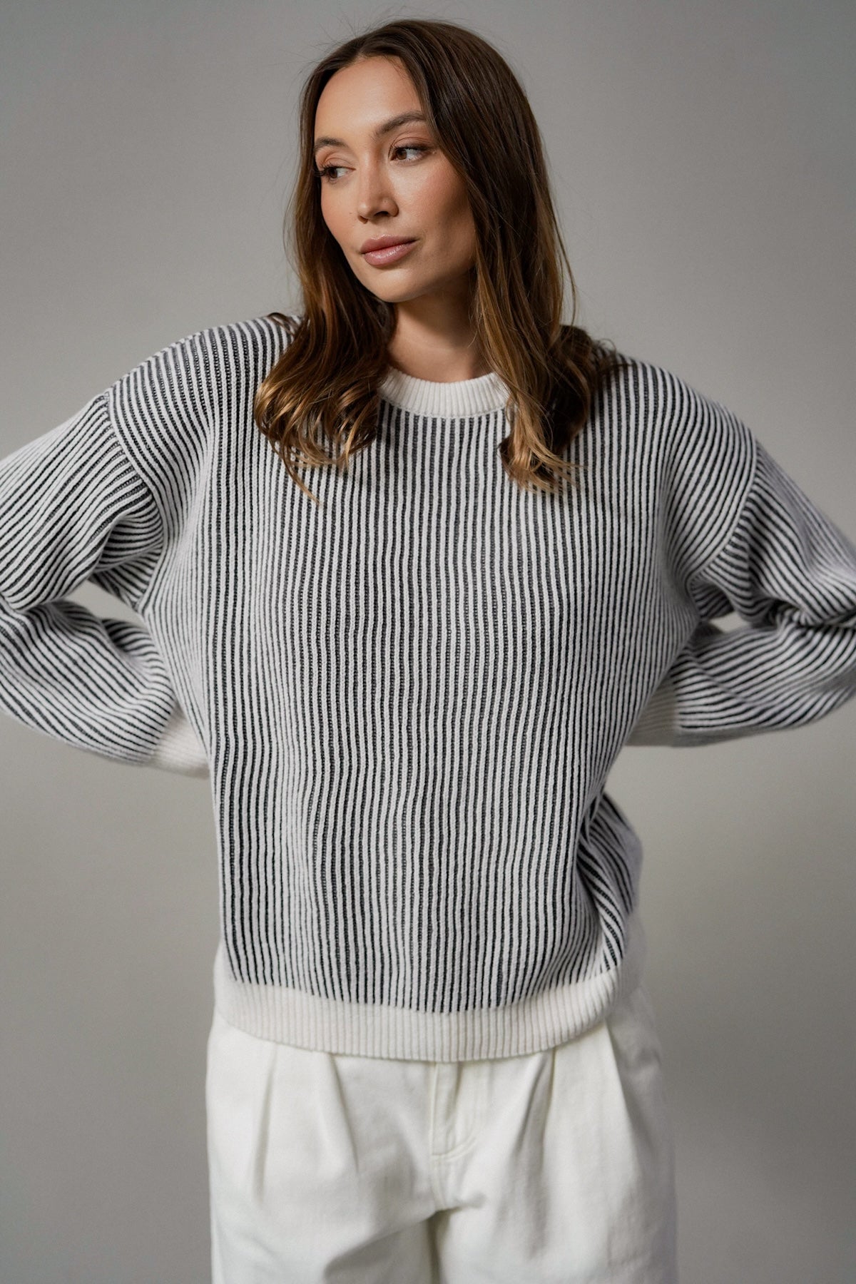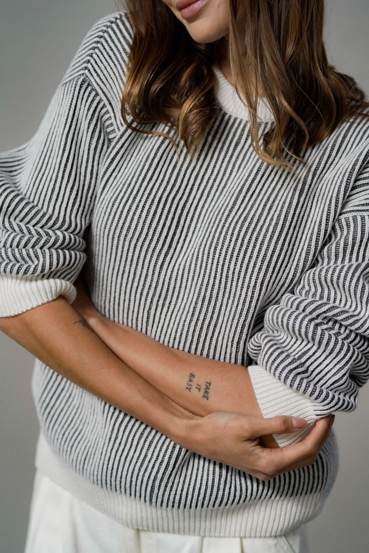 The cut is versatile, yet original. It has a simple, slightly loose form that sits comfortably on the figure - without being too tight, but still with a sense of proportion. The use of contrasting cuffs and a subtle accent at the neckline gives the sweater a distinctive but unobtrusive detail. Because little things make a difference. The sleeves are slightly lowered, which adds even more casualness and lightness.