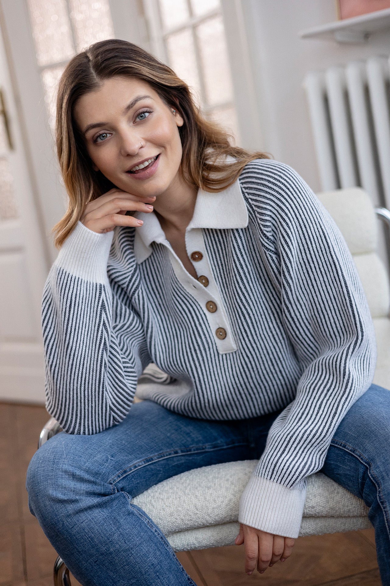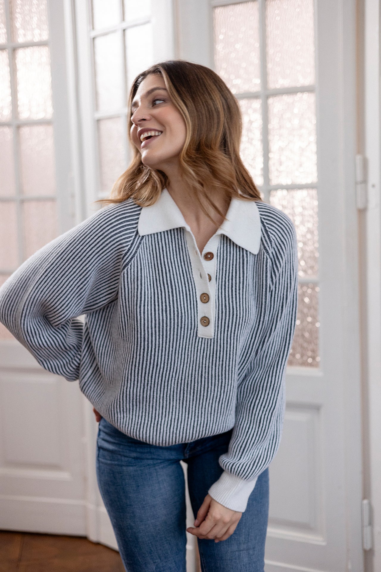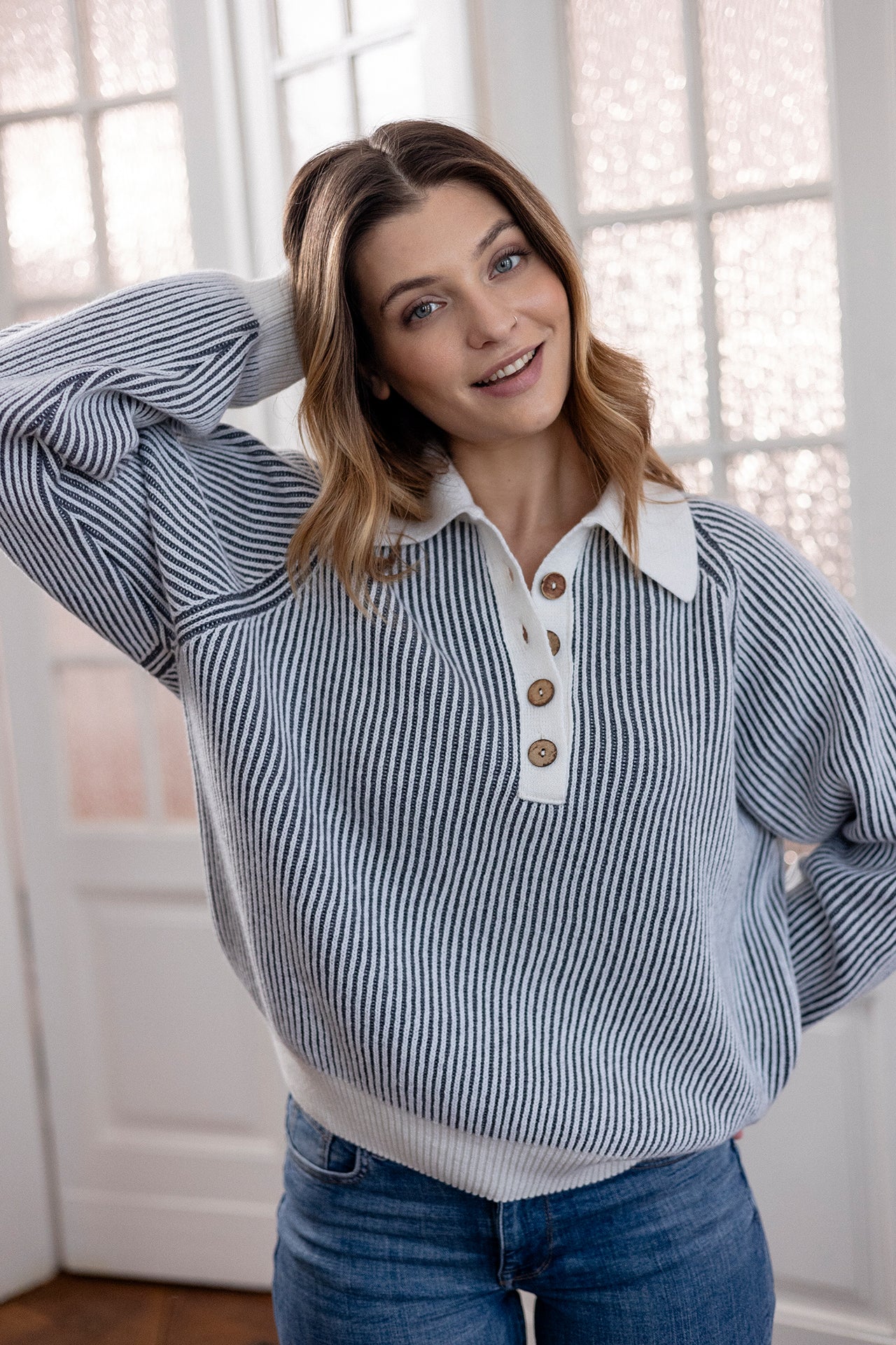 A sweater with the character of a classic, but appropriately tweaked polo in a warmer, year-round version. It immediately attracts attention with a clear weave in two shades, creating a unique and appropriately saturated with color composition.