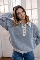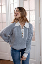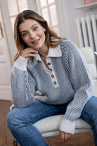 Sporty chic is intertwined with a touch of femininity. The neckline is topped with a collar in a striking white, fastened with aesthetic buttons. The cut itself is free and looser, providing not only comfort, but also the right fit on the figure. The sleeves are subtly puffed and elongated, finished with a delicate cuff.