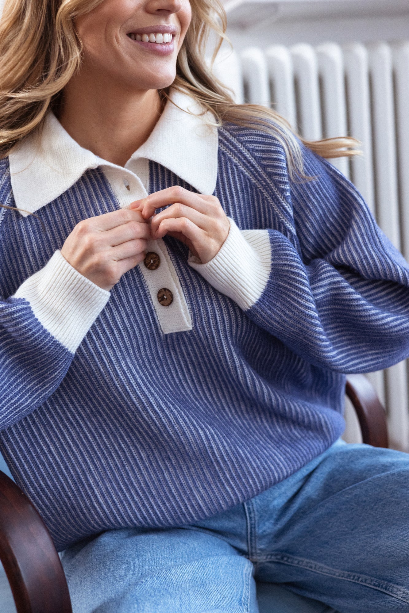 A sweater with the character of a classic, but appropriately tweaked polo in a warmer, year-round version. It immediately attracts attention with a clear weave in two shades, creating a unique and appropriately saturated with color composition.