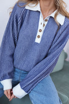 Sporty chic is intertwined with a touch of femininity. The neckline is topped with a collar in a striking white, fastened with aesthetic buttons. The cut itself is free and looser, providing not only comfort, but also the right fit on the figure. The sleeves are subtly puffed and elongated, finished with a delicate cuff.