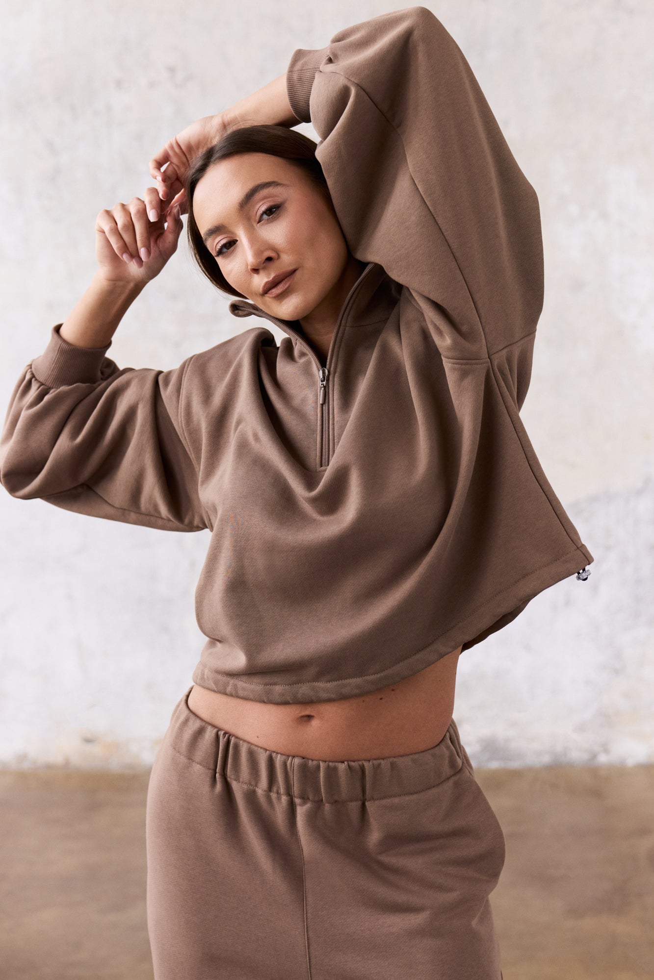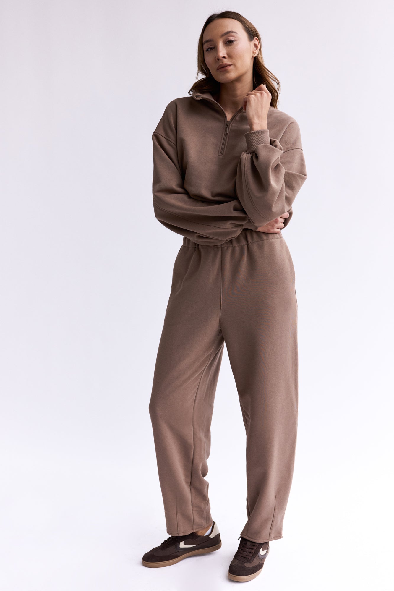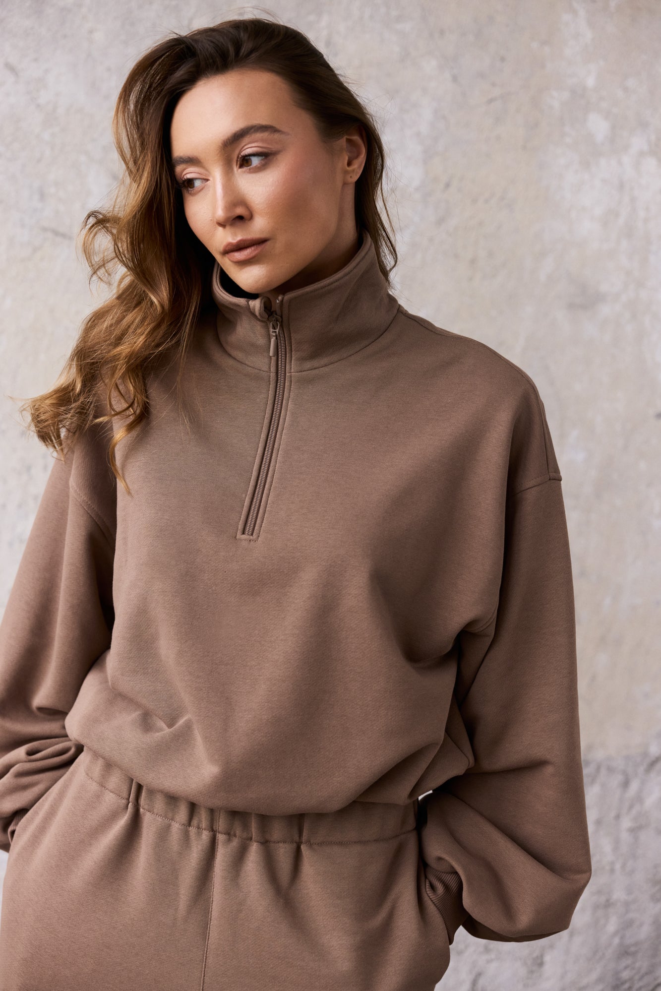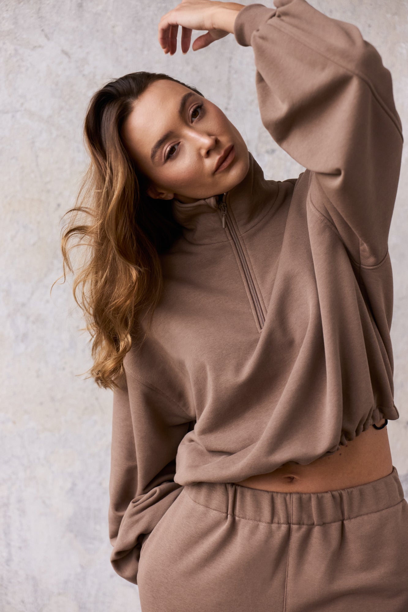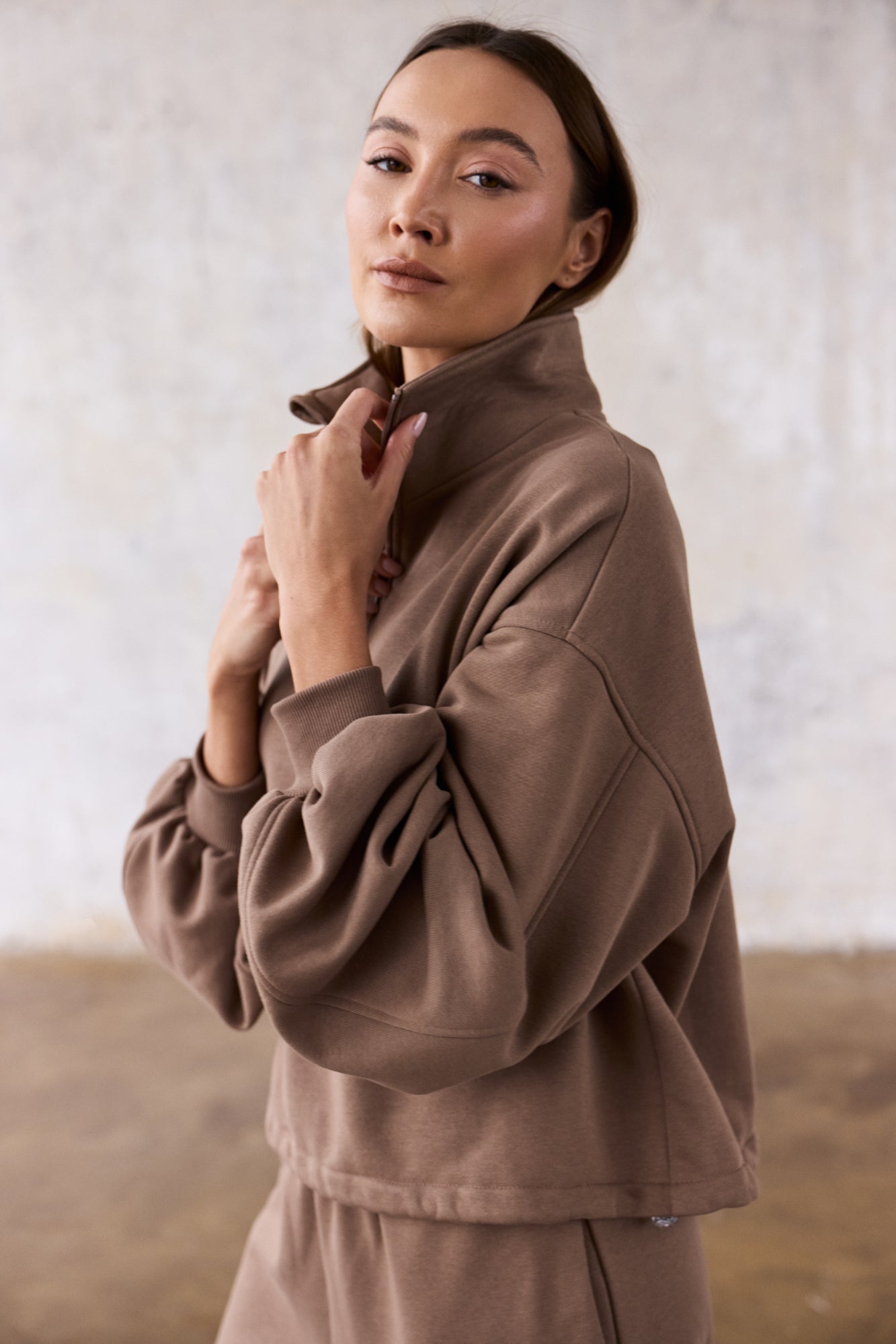 To minimalistyczna bluza, która nabiera charakteru za sprawą formy i kilku nieszablonowych rozwiązań, dlatego świetnie sprawdzi się zarówno na co dzień, jak i w bardziej stylowych, miejskich zestawach. My nosimy ją do naszych dżinsów Suzy, a gdy chcemy poczuć się jeszcze bardziej komfortowo zestawiamy z dresami Monica.