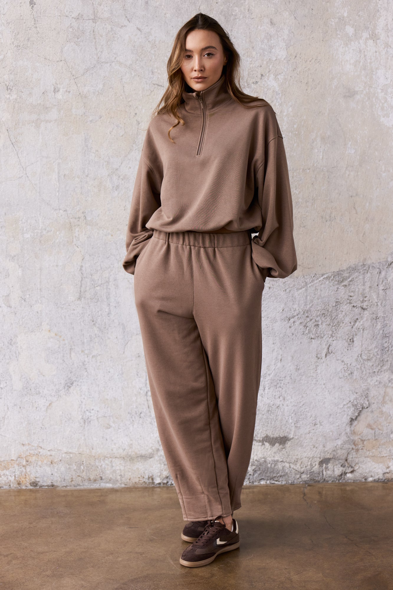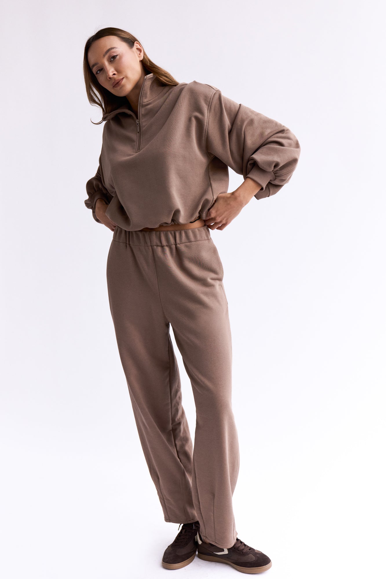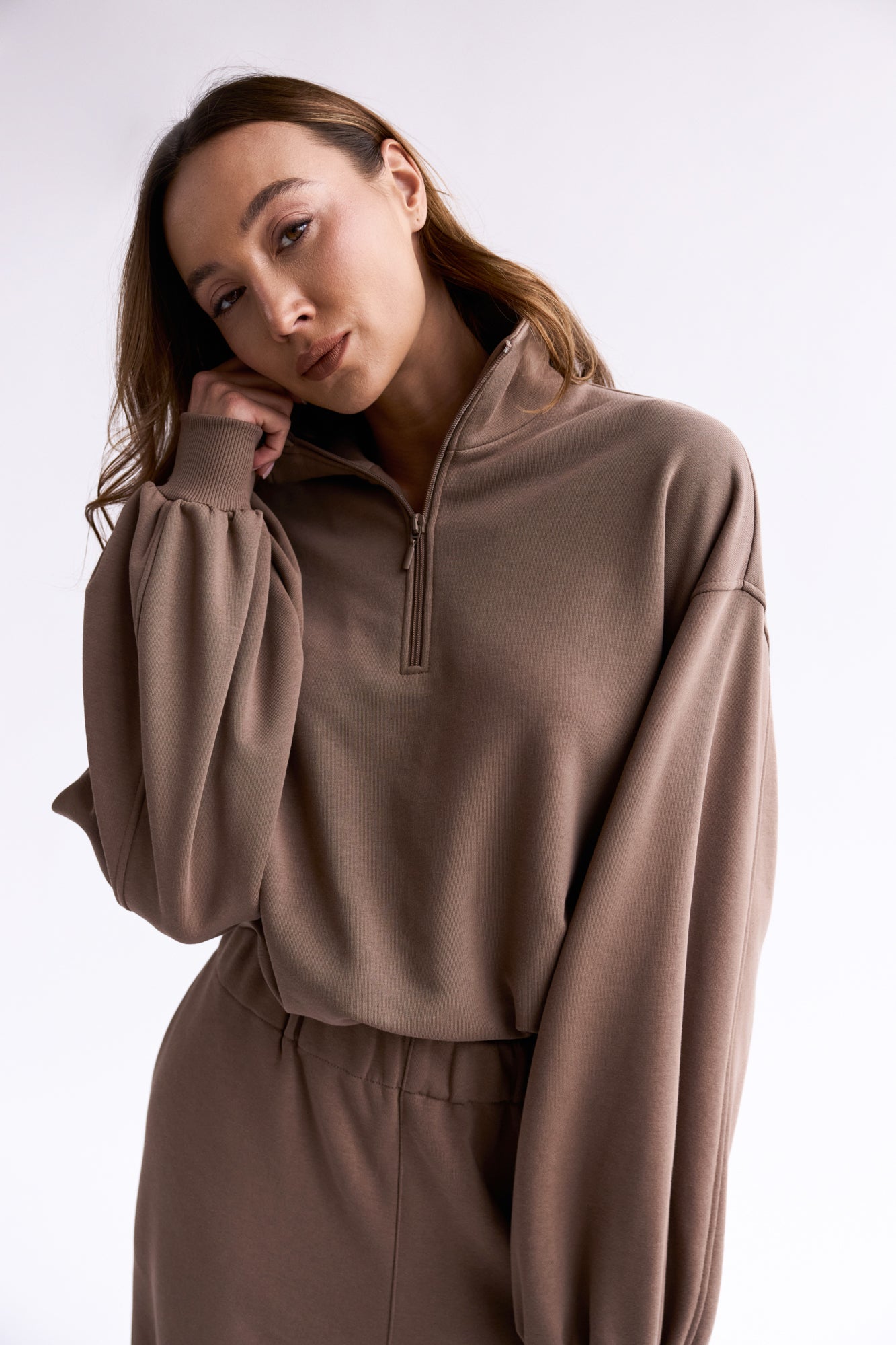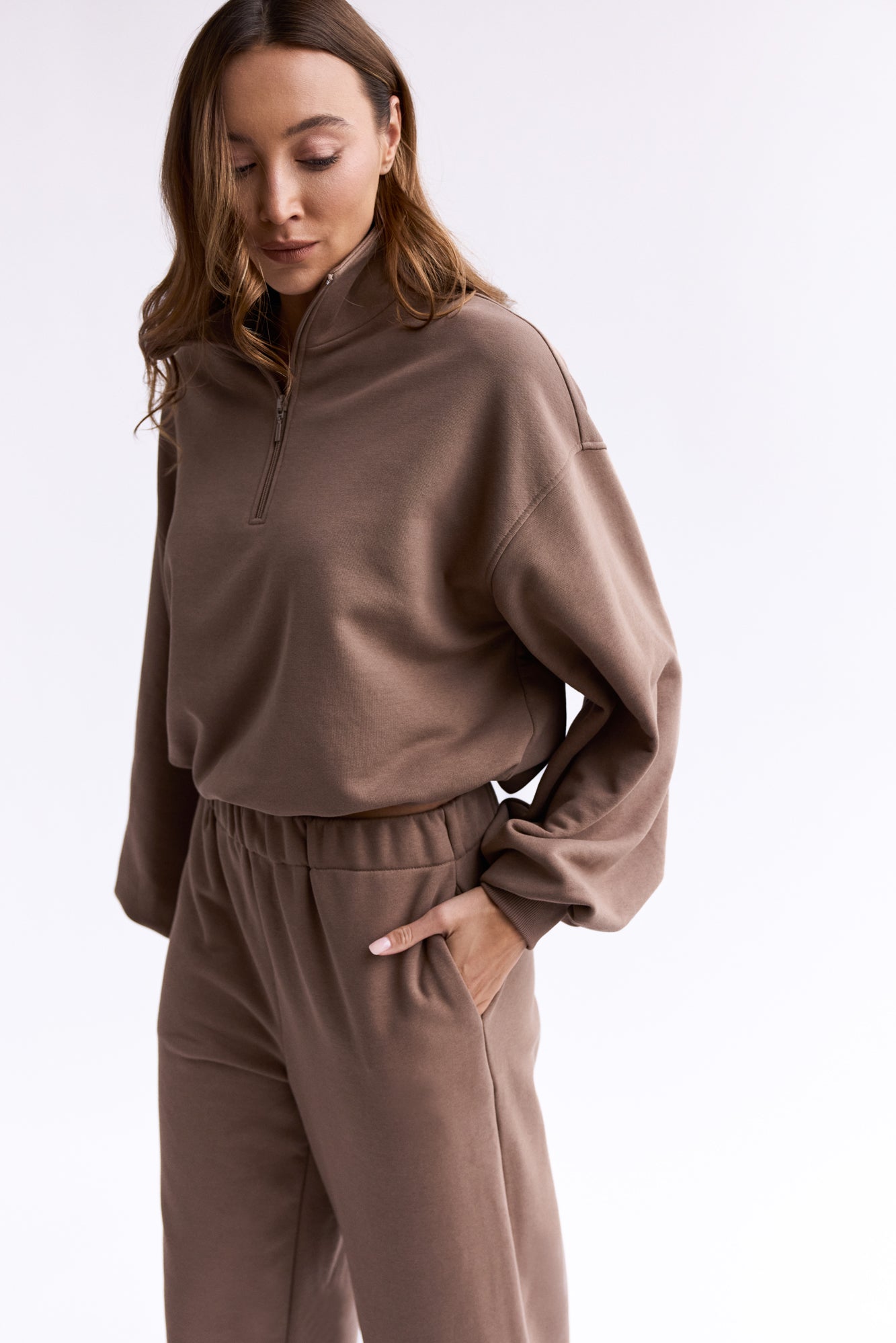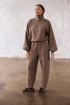 To minimalistyczna bluza, która nabiera charakteru za sprawą formy i kilku nieszablonowych rozwiązań, dlatego świetnie sprawdzi się zarówno na co dzień, jak i w bardziej stylowych, miejskich zestawach. My nosimy ją do naszych dżinsów Suzy, a gdy chcemy poczuć się jeszcze bardziej komfortowo zestawiamy z dresami Monica.