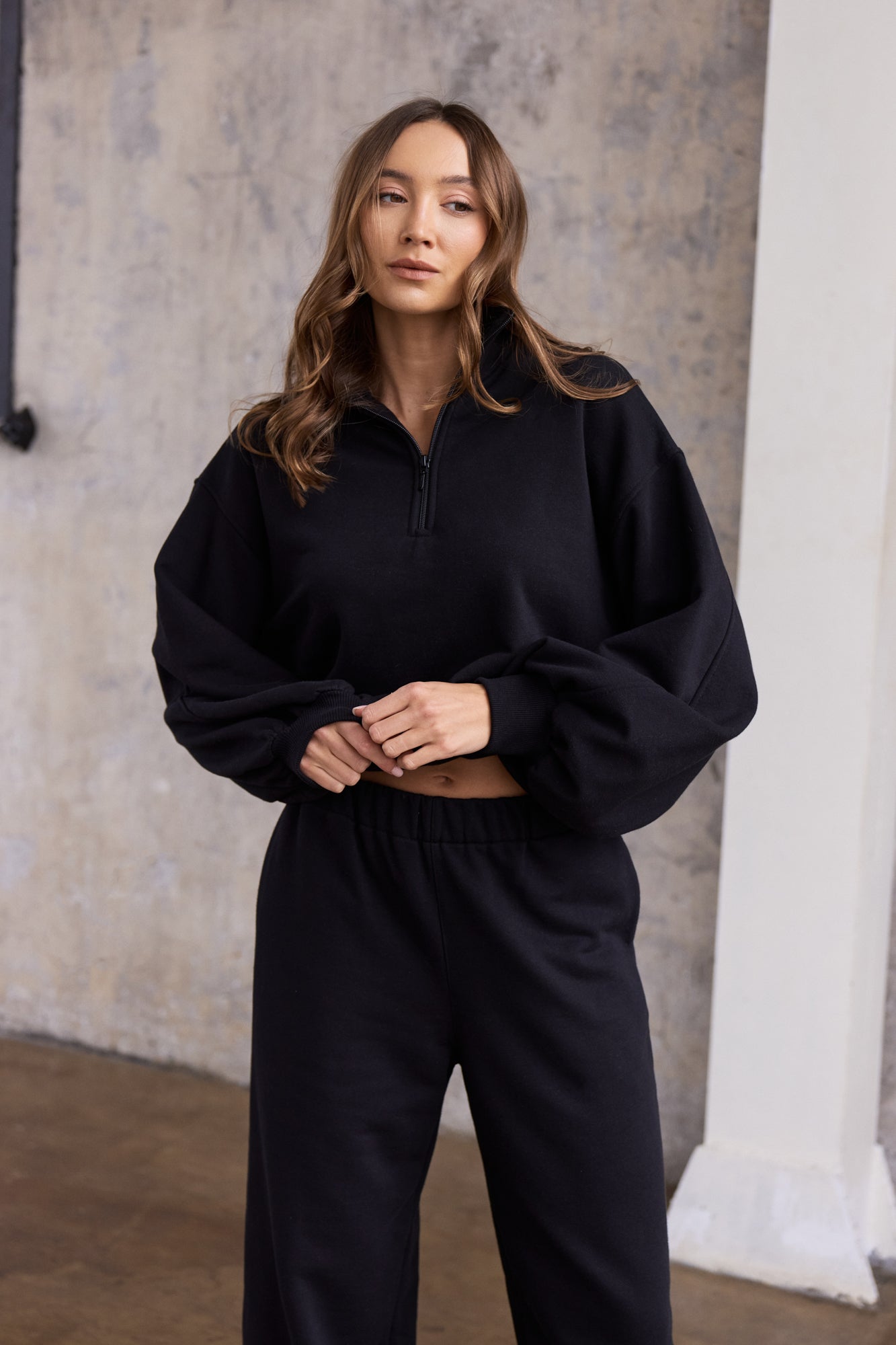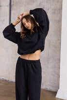 To minimalistyczna bluza, która nabiera charakteru za sprawą formy i kilku nieszablonowych rozwiązań, dlatego świetnie sprawdzi się zarówno na co dzień, jak i w bardziej stylowych, miejskich zestawach. My nosimy ją do naszych dżinsów Suzy, a gdy chcemy poczuć się jeszcze bardziej komfortowo zestawiamy z dresami Monica.