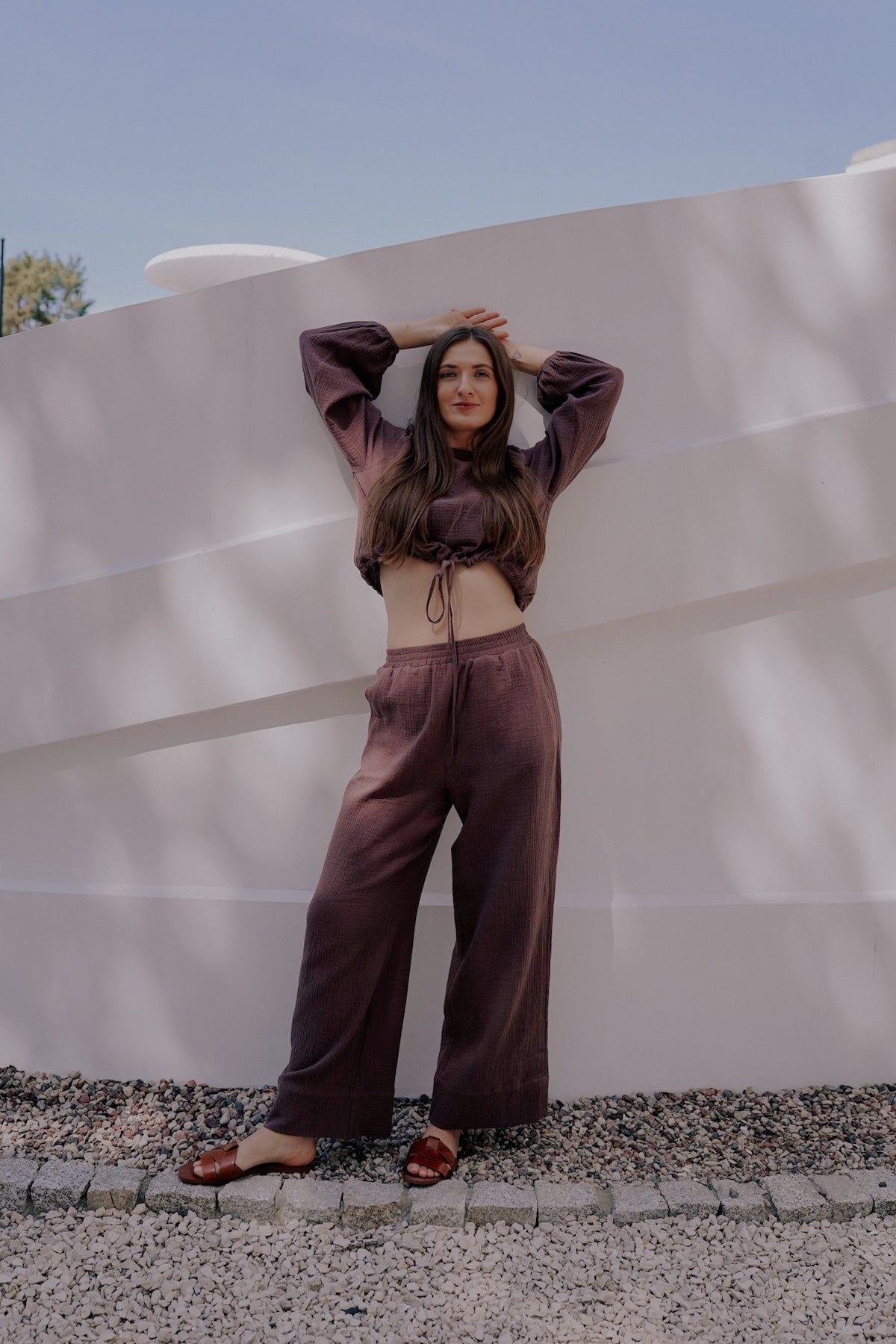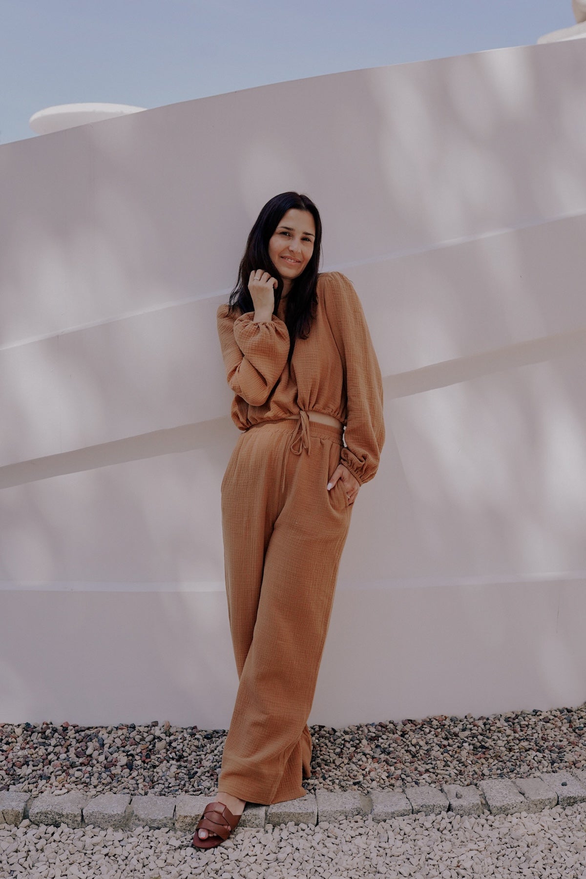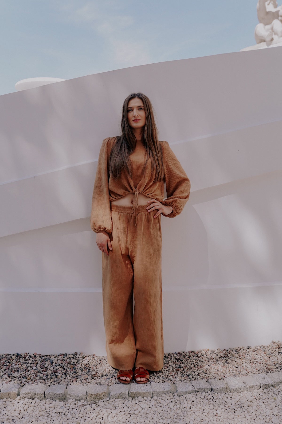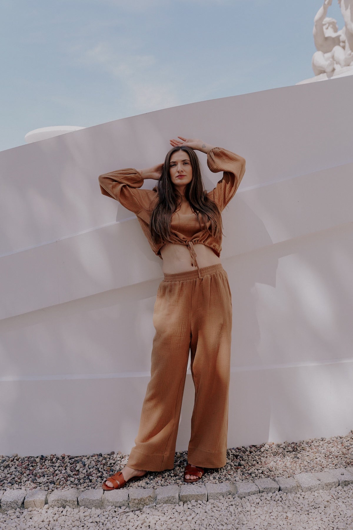 Lekkości i subtelności nadaje im zwiewny materiał w postaci bawełny muślinowej. Nogawki są odpowiednie szersze i nonszalancko dłuższe, by nadawały się nie tylko do płaskich butów, ale też stworzyły zgrabny look ze szpilkami. Do tego kieszenie, które pomieszczą drobiazgi, a w talii wszyta wygodna, estetyczna gumka.